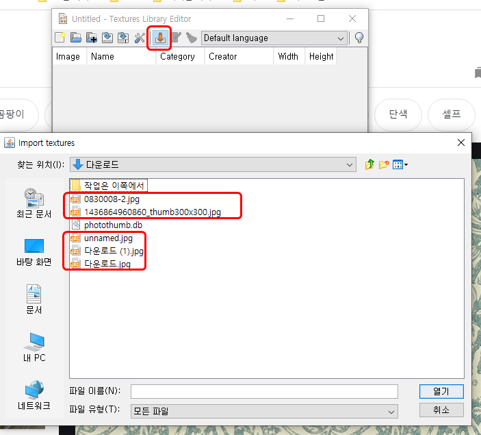 표시된 Import texture 아이콘을 클릭하면 화면 탐색 창이 뜹니다. 텍스쳐로 사용하기 위해 다운로드한 파일이 있는 폴더로 이동합니다. 저는 다섯 개의 파일을 받아놨습니다. 다섯 개 파일을 한꺼번에 선택 후 등록이 가능합니다. 다량의 3D 객체를 Furniture Library Editor에서 불러오던 것과 동일합니다!
