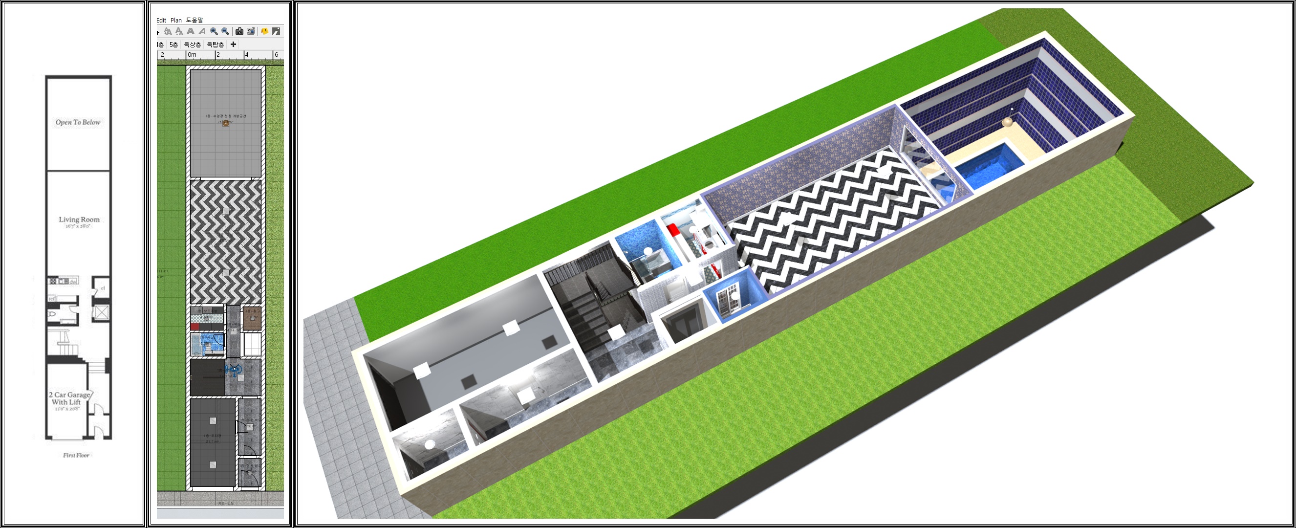 거실과 수영장 천정에 별도의 창이 있는지 여부는 원본에 표시가 되어 있지 않아 통창을 임의로 넣어봤습니다. 그 외 주택 후면으로 채광이나 환기를 위한 창 또한 표시가 되어 있지 않아 넣을까 하다가 일단 생략했습니다. 이 주택의 이웃 집들이 어떤 식으로 위치했는지는 모르겠으나 별도의 뜰이 없다면 창을 낼 수 없는 상황일 거라는 판단입니다.