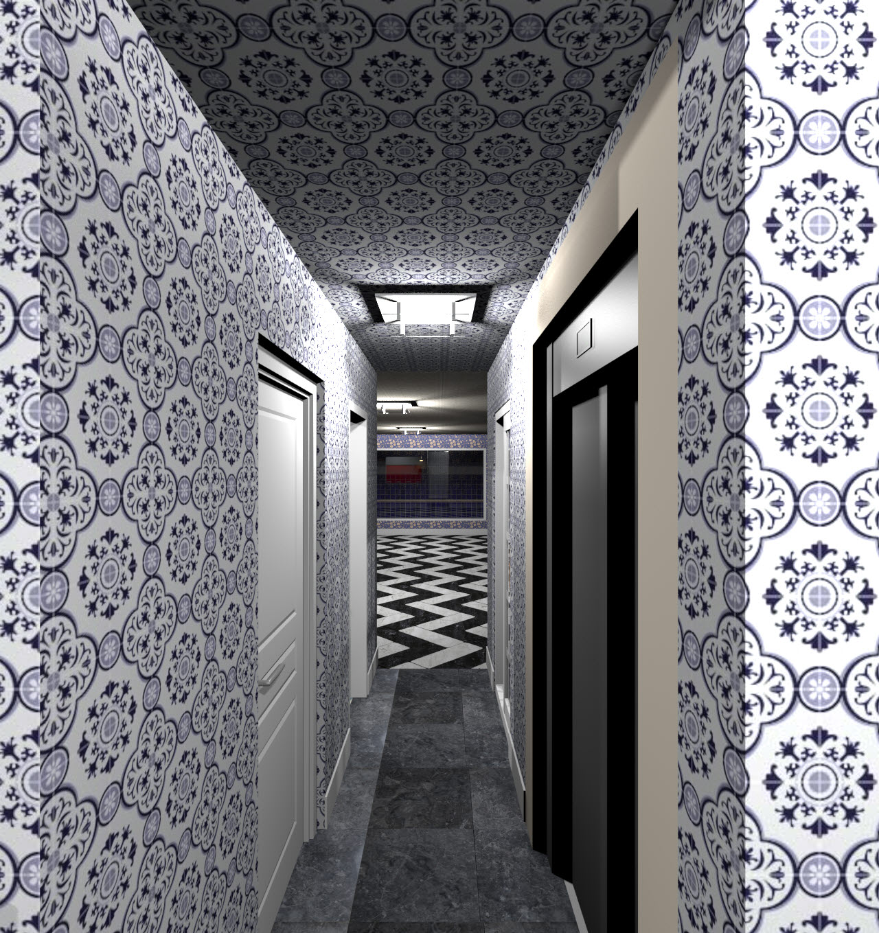 그럼 각 구간 렌더링 이미지를 보겠습니다. 순서는 현관에서 차고, 계단실을 거쳐 복도와 각 공간, 거실, 거실창을 통한 수영장 풍경입니다. 간략한 설명은 이미지 하단에 달겠습니다.