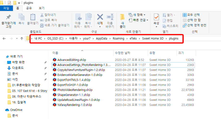 아래의 이미지 처럼 숨겨진 폴더를 찾아가서 plugins 폴더에 받아온 플러그인을 모두 옮겨주면 됩니다. 혹시라도 Sweet Home 3D 폴더 아래에 plugins라는 폴더가 없으면 "plugins" 폴더를 만든 후 옮기면 됩니다.