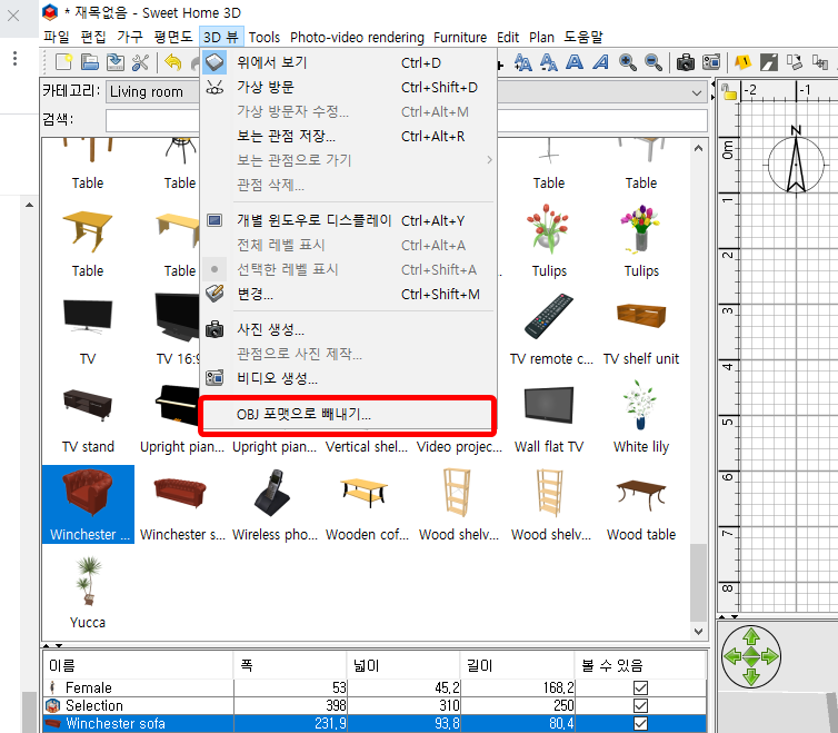 내보낼 가구 객체들이 모두 선택된 상태에서 3D 뷰 창으로 마우스 커서를 옮기고 오른쪽 키를 누르면 아래처럼 메뉴창 상에 obj 포맷으로 빼내기를 선택할 수 있습니다.