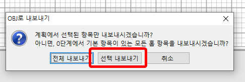 저장을 누르면 다음 메시지가 출력되는데 여기서 정말 주의하셔야 합니다. 우리가 필요한 건 선택된 객체들을 하나로 묶어서 obj파일로 내보내는 것이지 작업하는 모든 객체를 다 내보내는 것이 아니므로 꼭 "선택 내보내기"를 클릭해주시기 바랍니다. 안 그러면 깔아놓은 모든 객체들, 벽과 바닥. 즉 설계하던 모든 것들이 하나로 묶여서 저장됩니다.