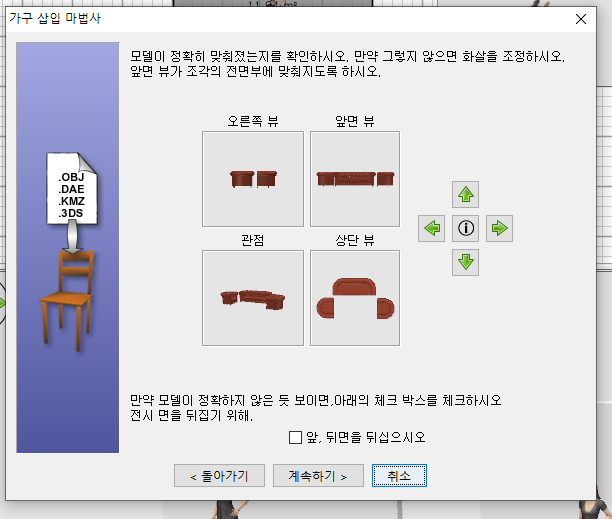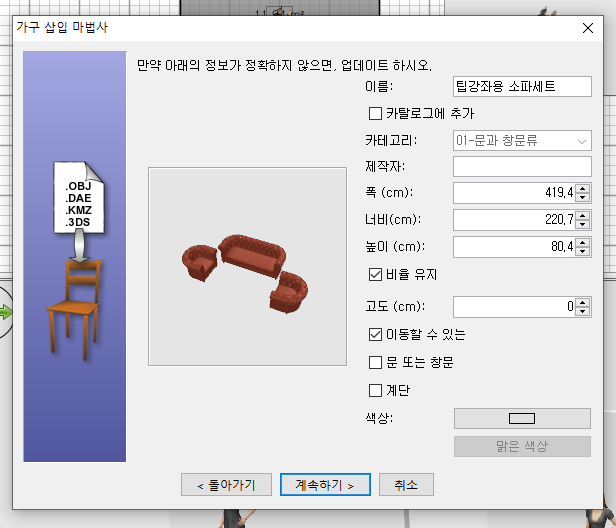 자 그럼 이 객체가 이상 없이 가구 가져오기로 등록되는지 확인해 보겠습니다. 아래 캡처 이미지들처럼 가구 삽입 마법사에서 3개의 가구가 하나로 묶인 상태로 이상 없이 등록되는 것을 확인할 수 있습니다.