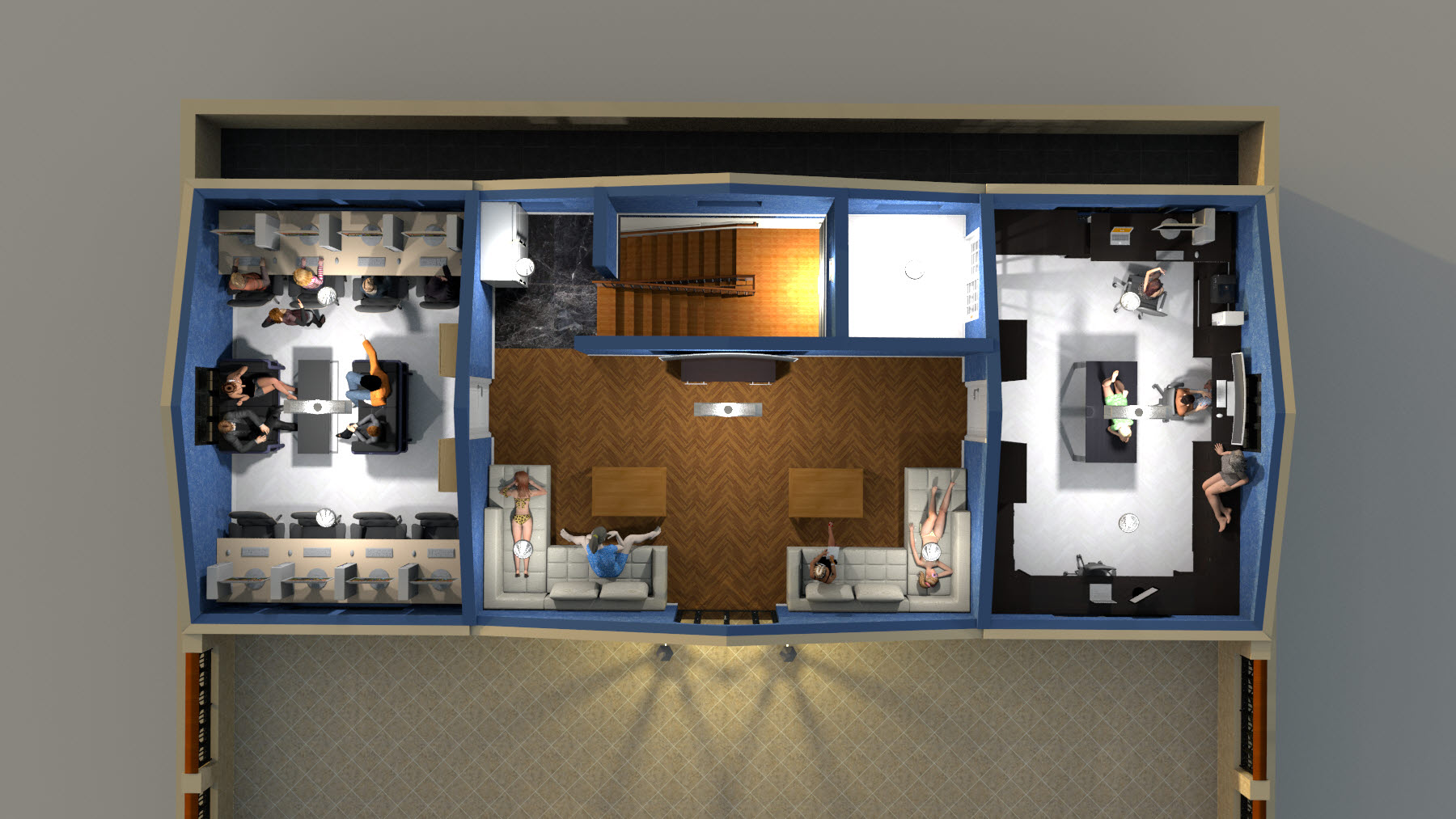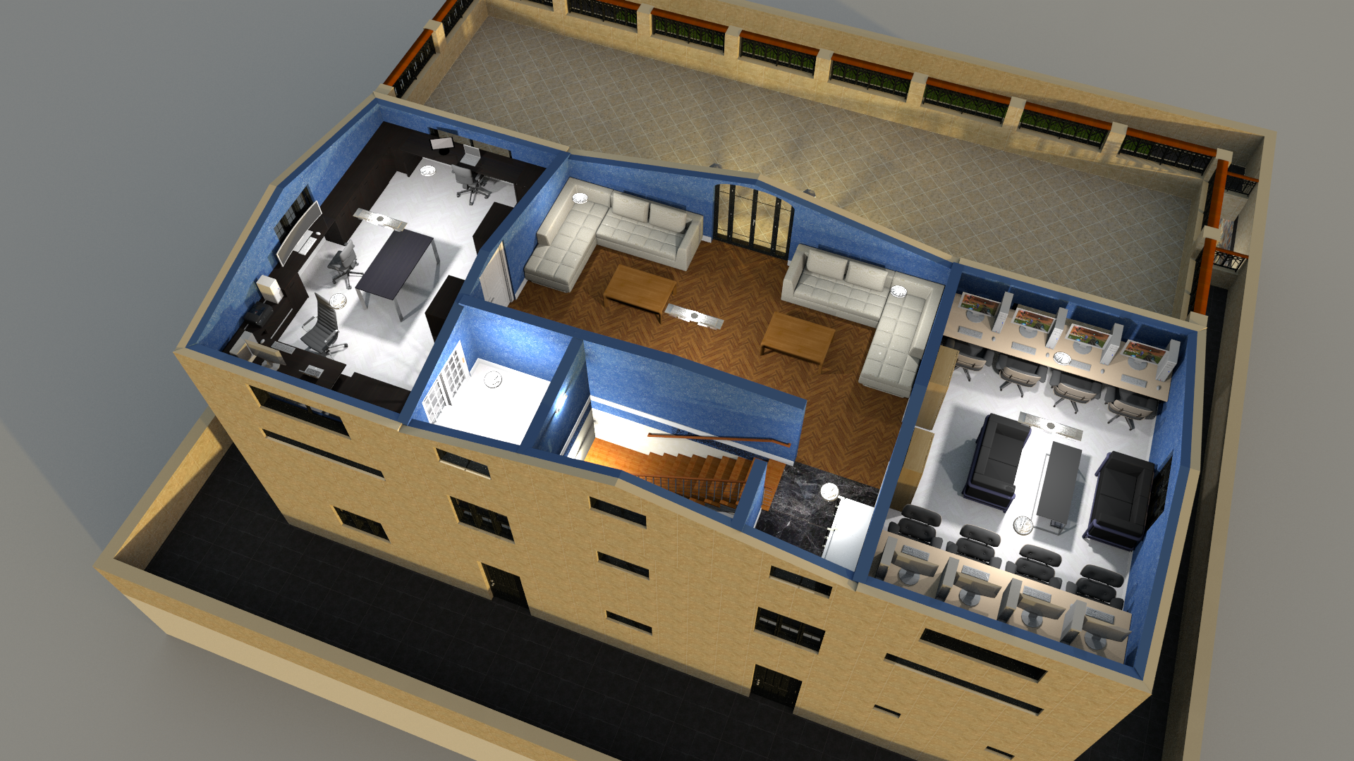 마지막 옥상층입니다! 렌더링은 역시 다 완료가 안되어서 일단은 평면도, 상단 뷰, 쿼터뷰와 렌더링 완료된 일부 구간부터 올려봅니다.