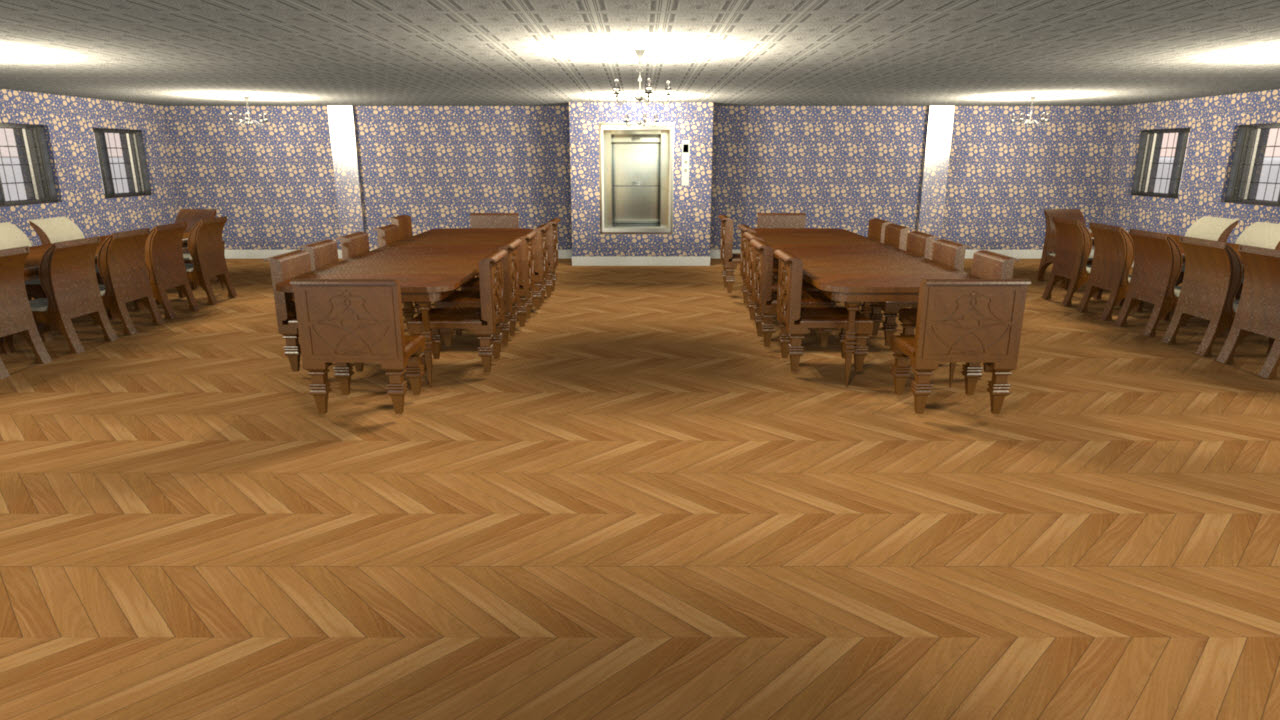 ■ 평면도, 3D 상단뷰, 상단뷰 렌더링 : 4층은 통째로 대식당 입니다. 12인 식탁 4개와 8인 원형 식탁 2개를 배치해서 총 64명이 한꺼번에 만찬을 즐길 수 있습니다. 음식은 3층 식당의 주방에서 조리 후 음식용 승강기를 통해서 공급받는 방식입니다.