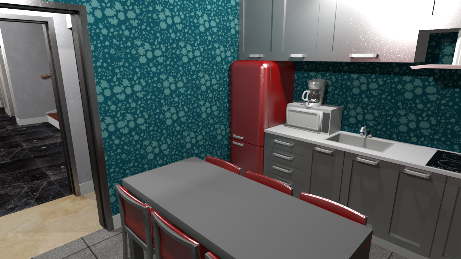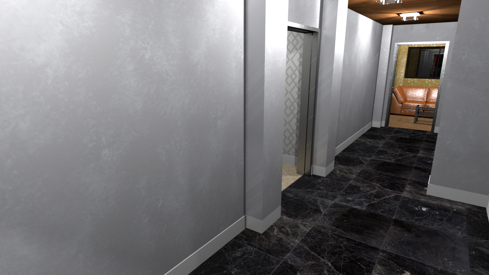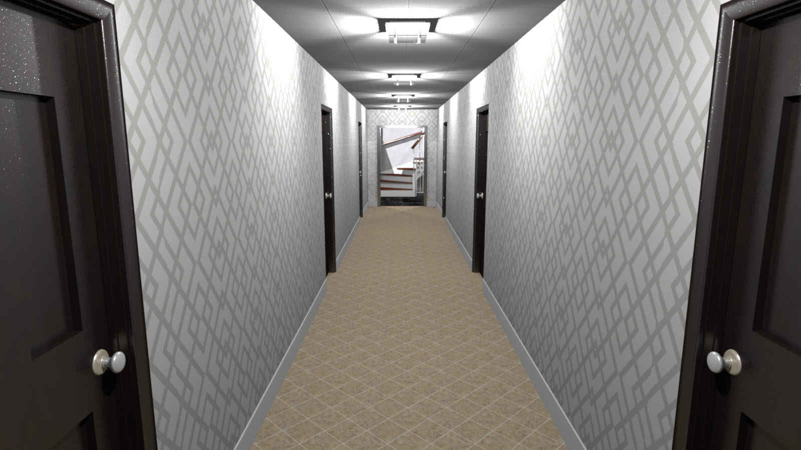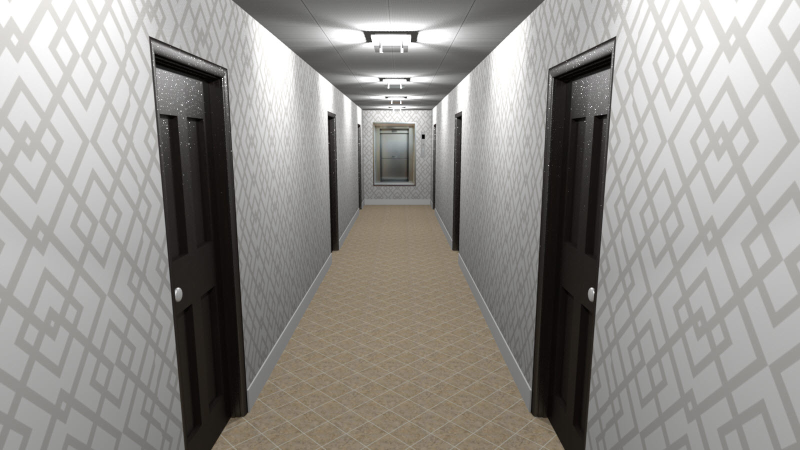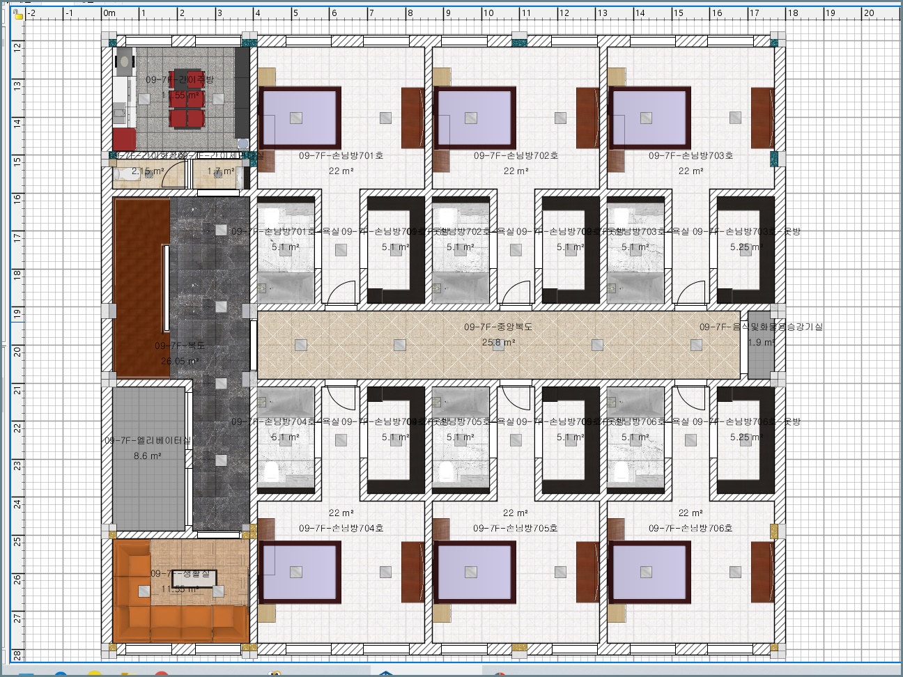 드디어 7층까지 왔습니다. 7층부터는 방들로 구성되어 있습니다. 7~8층은 각 6개실, 9~10층은 각 4개실의 손님방으로 구성되어 있고 11~12층은 가족실로 설계했습니다. 7~8층은 구조가 똑같습니다, 또한 각 방의 모양도 같기 때문에 1개의 방만 렌더링을 돌리고 벽지 색상은 2개로 나눴기 때문에 벽지 색상 차이만 확인하기 위해 별도의 렌더링을 하나만 만들었습니다. 일단 7층 바로 올려보겠습니다.
