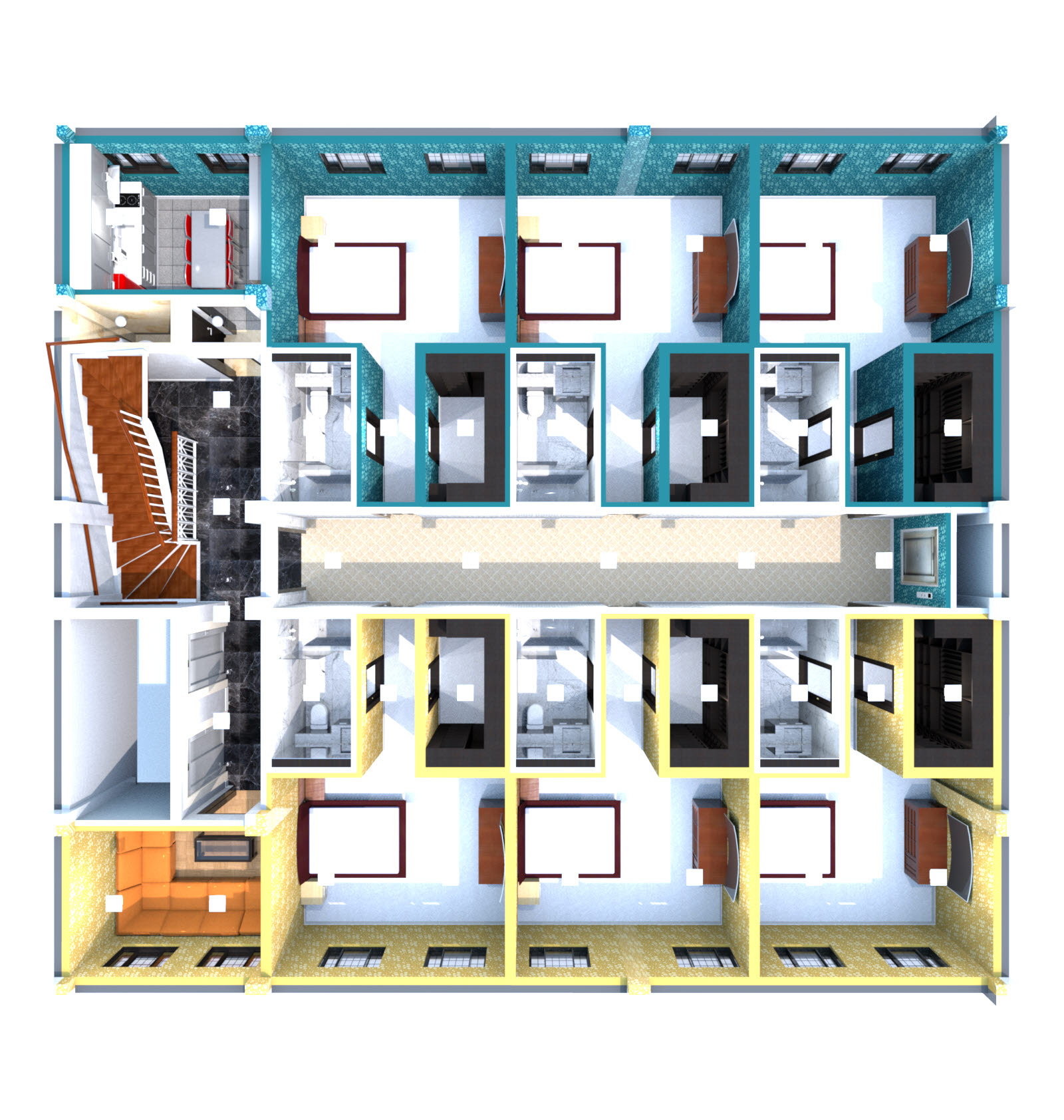 ■ 평면도, 3D 상단뷰, 상단뷰 렌더링 : 각 방에 욕실이 딸려 있기 때문에, 남녀 화장실은 생활실, 간이 부엌으로 변경하였고, 창고 구간에 화장실 1개로 배치해봤습니다. 방은 중앙 복도를 기준으로 상하 각각 3개씩 배치된 구조입니다.