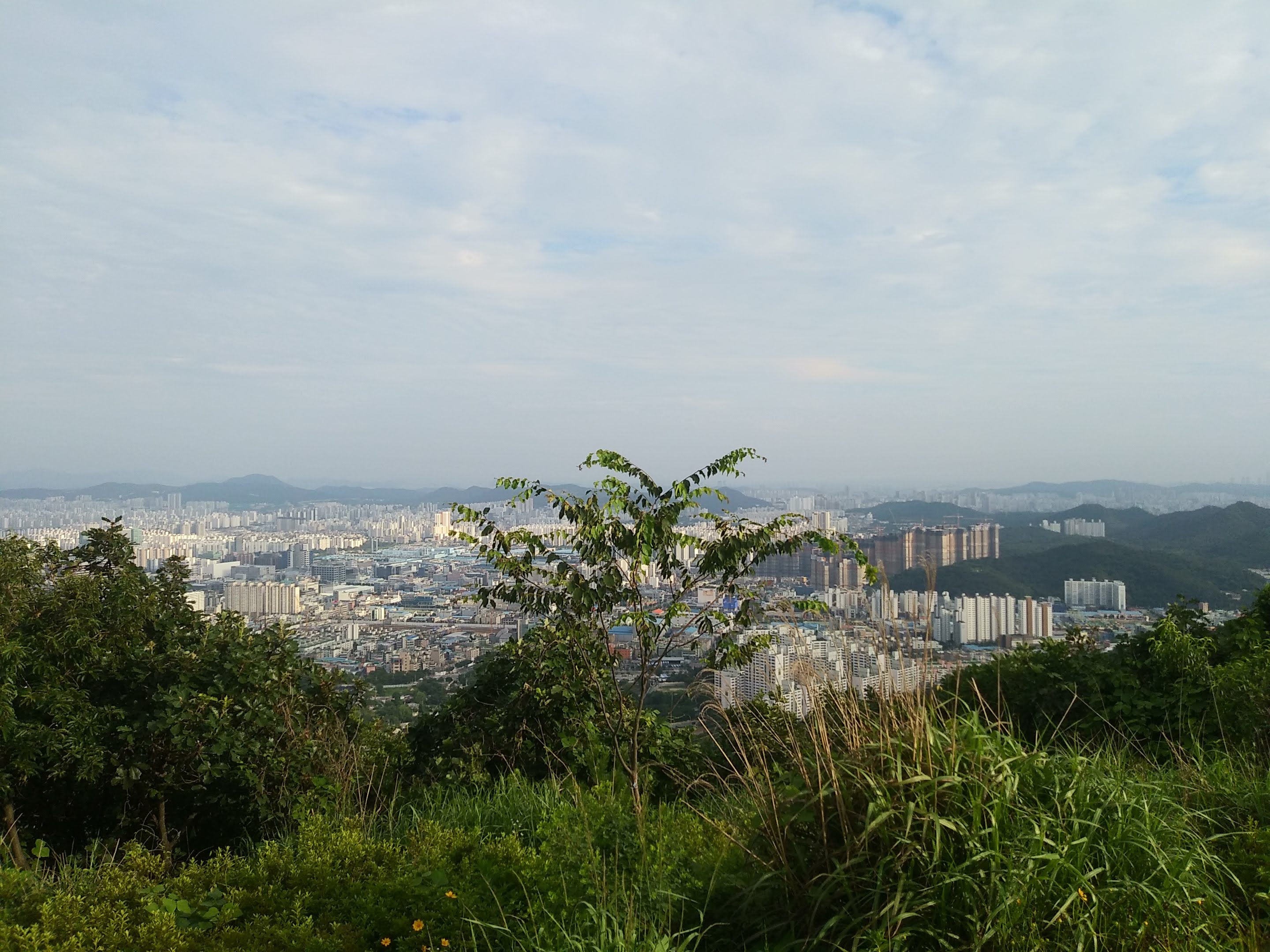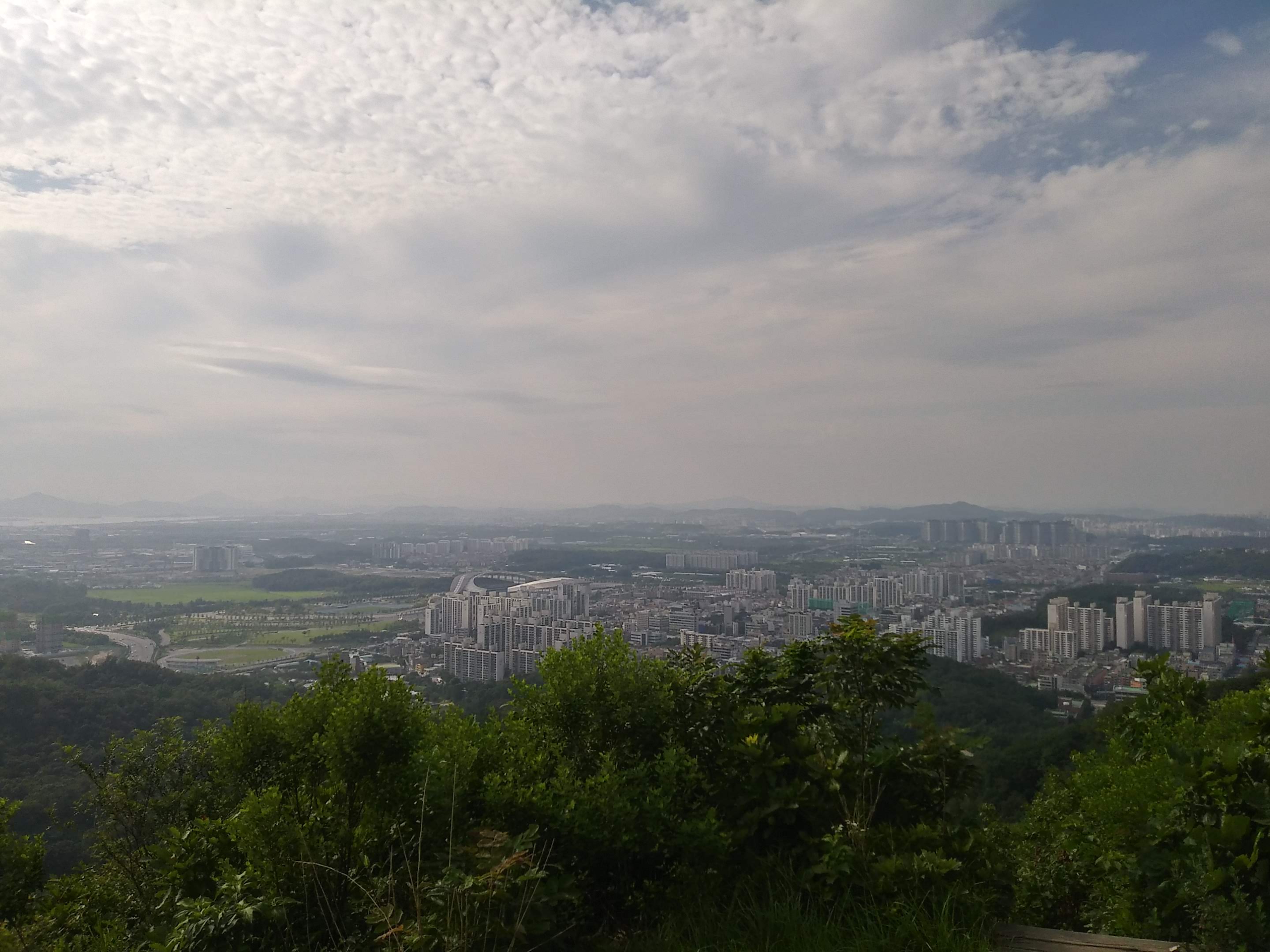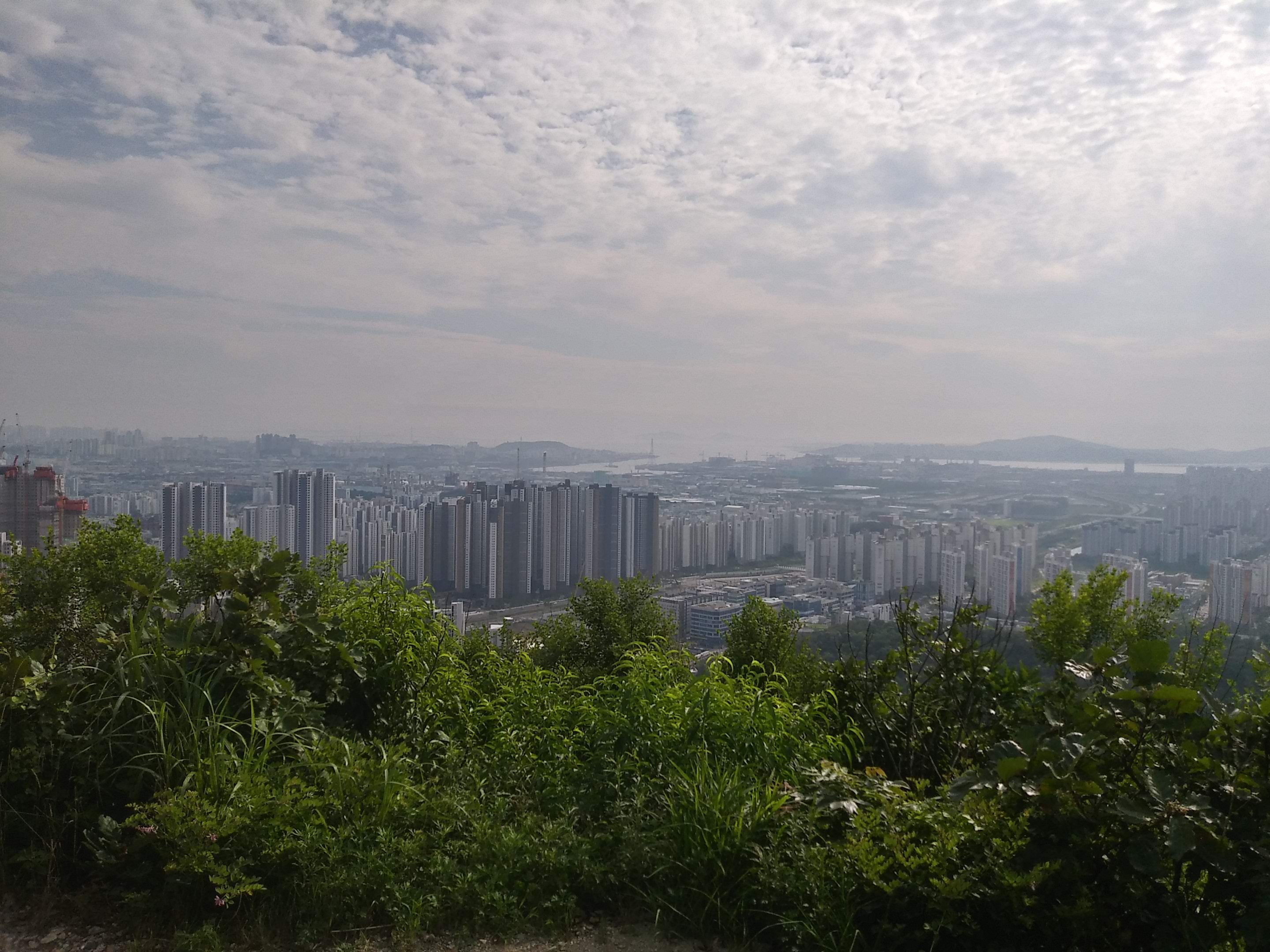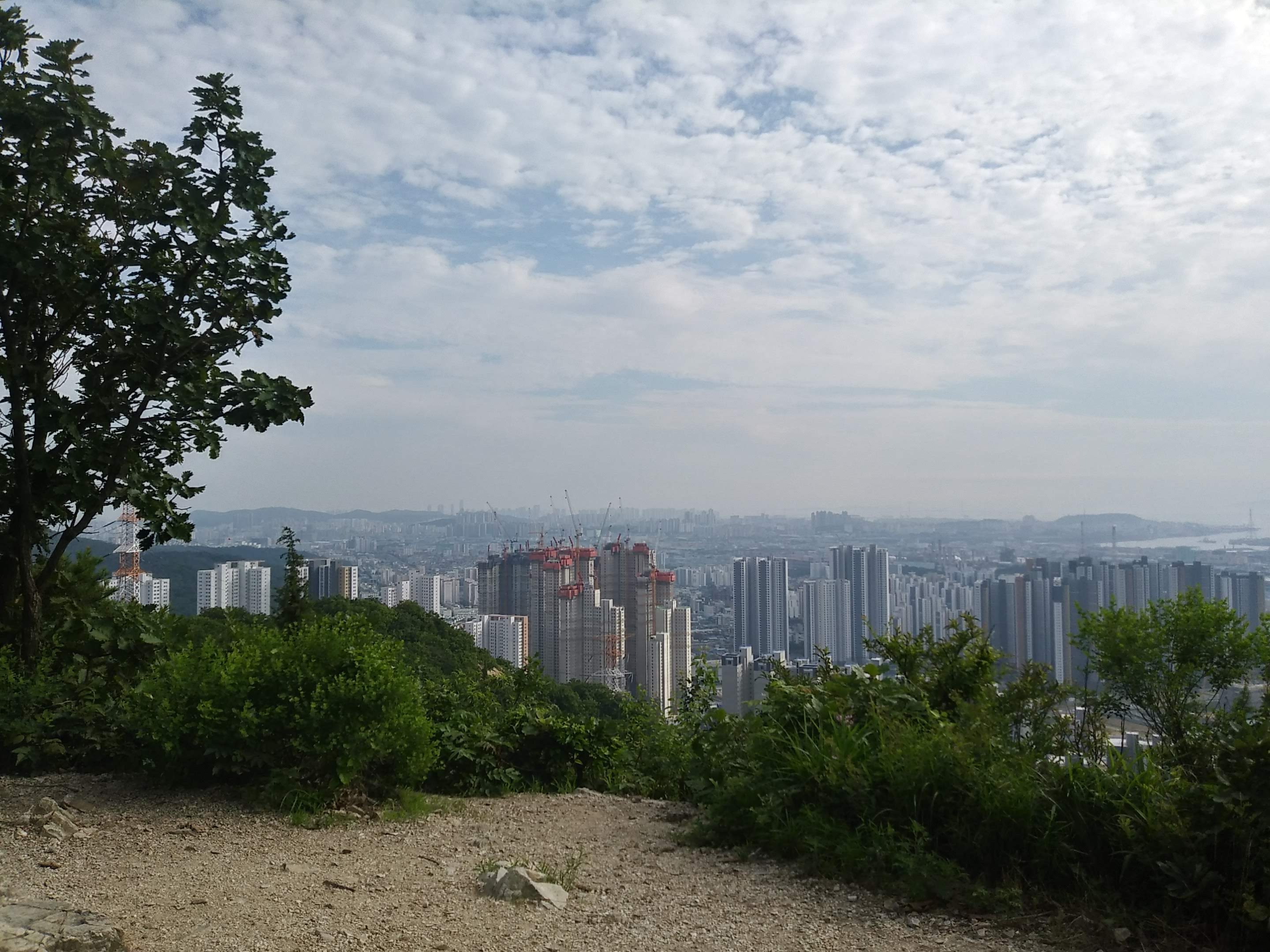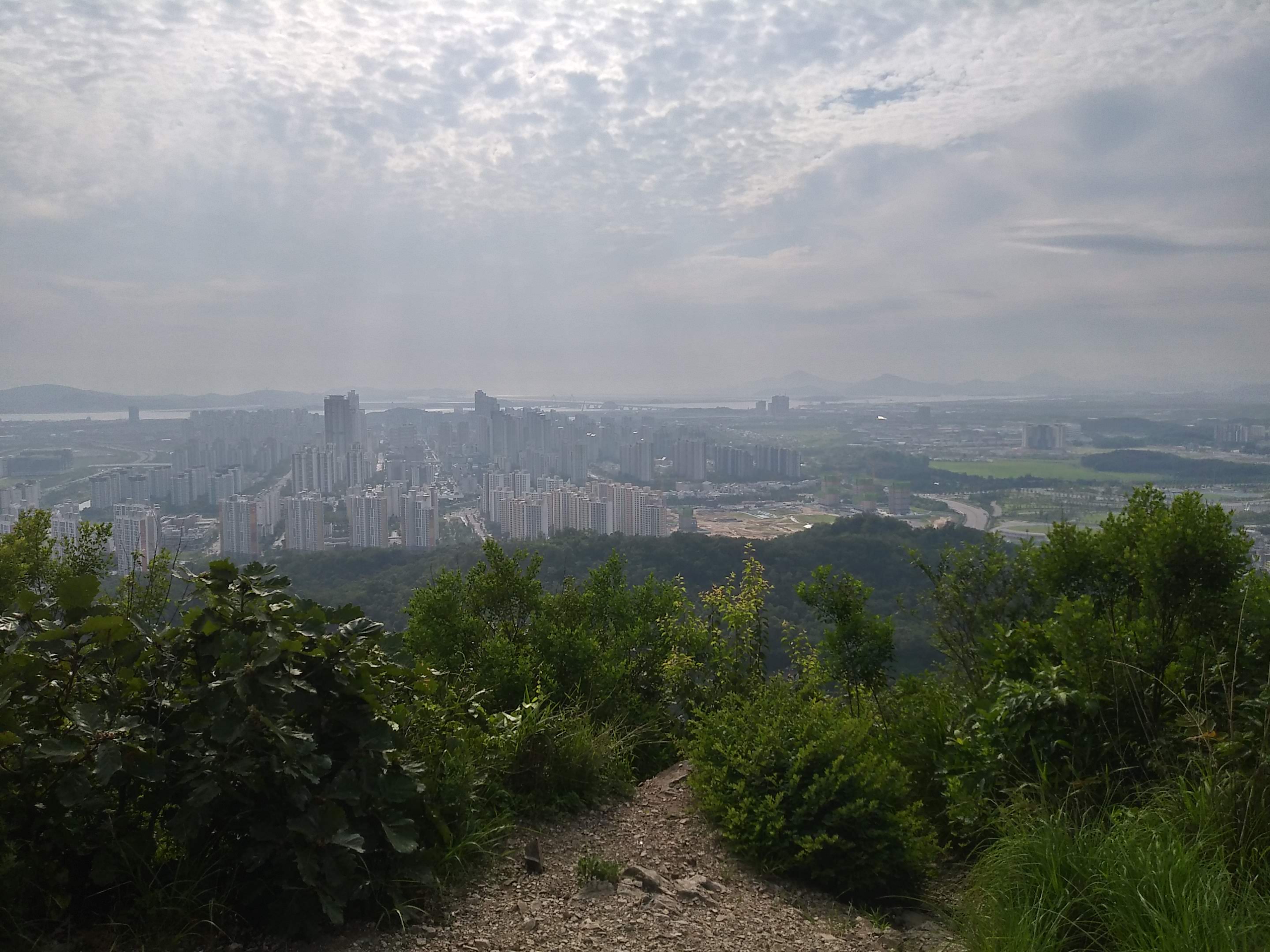 어디메인지 기억은 가물가물한데, 정상 가기 한참 전에 탁 트인 곳이 있어서 쉬면서 찍어본 사진입니다. 서쪽을 보고 찍으니 청라 방면과 멀리 바다까지 보이더군요. 하지만 역시나 중공발 미세먼지로 인해 하늘은 뿌였습니다. 미세 먼지 없던 봄철 -중공이 지들이 퍼트린 우한 폐렴의 변종으로 전국을 봉쇄 한다고 부스런 떨던 그때 갔다 왔으면 청량하게 저 멀리 서해까지 사진에 잘 담을 수 있었을 텐데 말이죠...