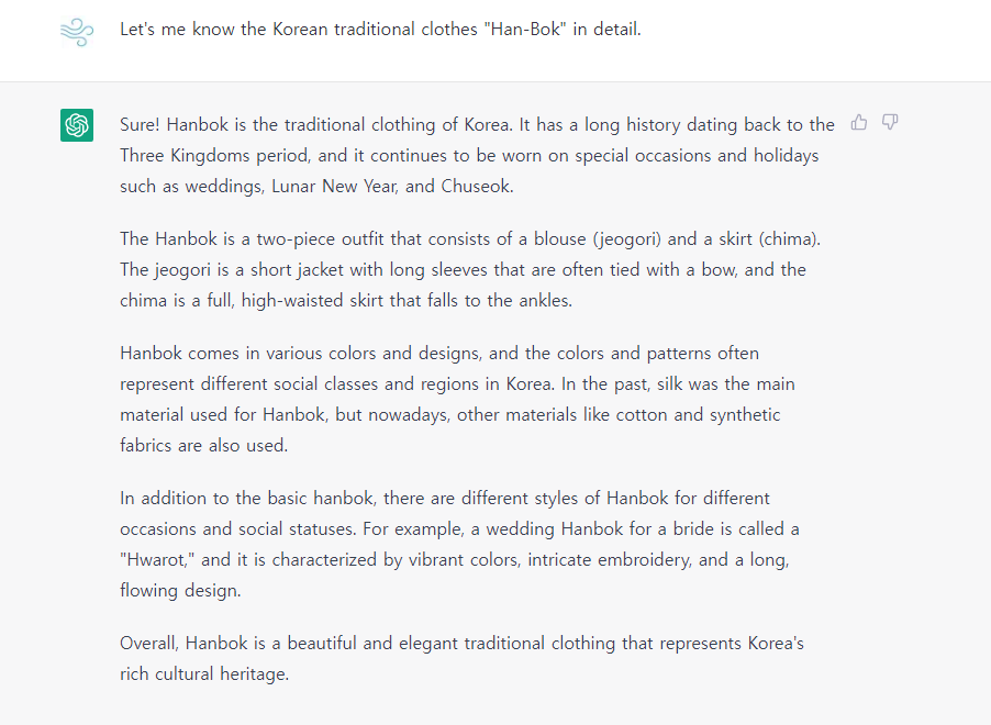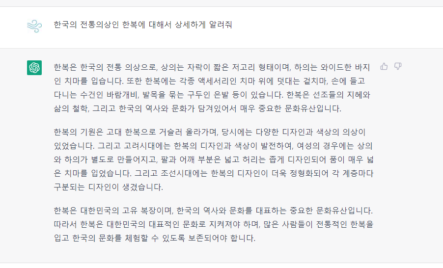 중공의 동북공정이 도를 넘어서 뭐든지 다 지들 거라고 우기고 있는 요즘, 한복에 대해서 ChatGPT에게 물어보았습니다!