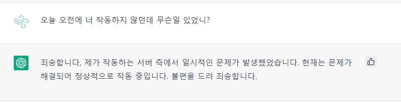 이것이 미리 입력되어 있던 답을 출력한 거라면 모를까, 이 상황에 맞게 AI가 답변을 내 놓은 것이라면 ㅎㄷㄷ 하네요. 본인의 서버가 문제가 있었다는 걸 인지하고 있다는 것이니 말이죠.