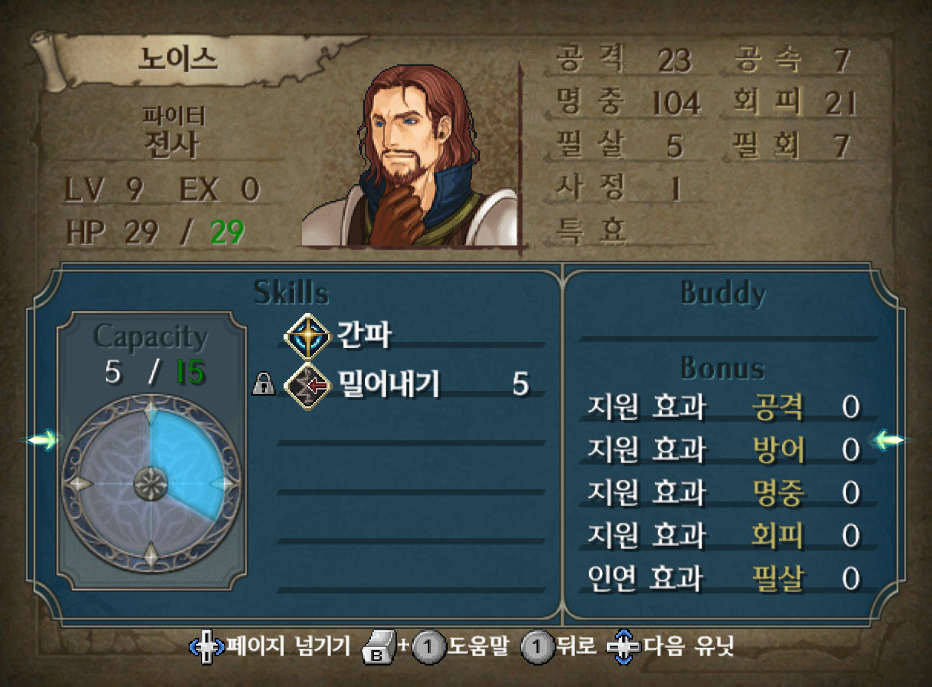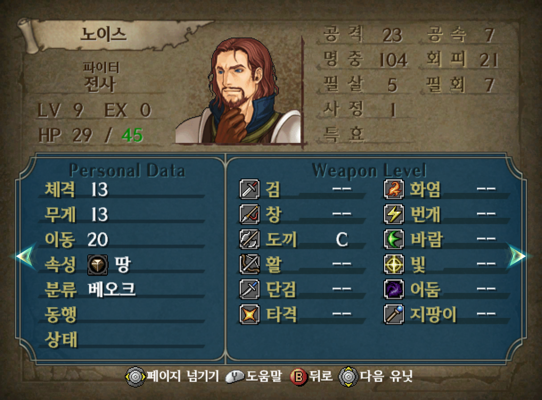 1부 1장에서는 시작 시에 노이스가 기본 합류합니다. 1차 전직 전인데도 HP 최댓값이 45까지 도핑이 됩니다. 대 놓고 탱커로 쓰라고 만들어 놓은 듯.