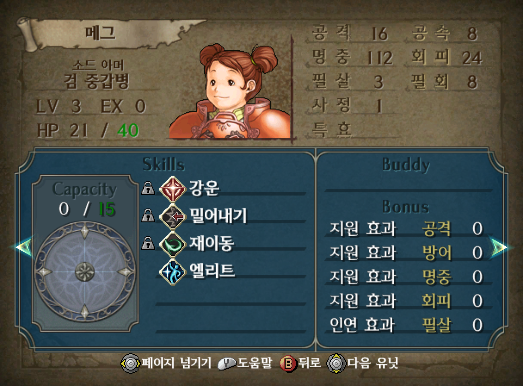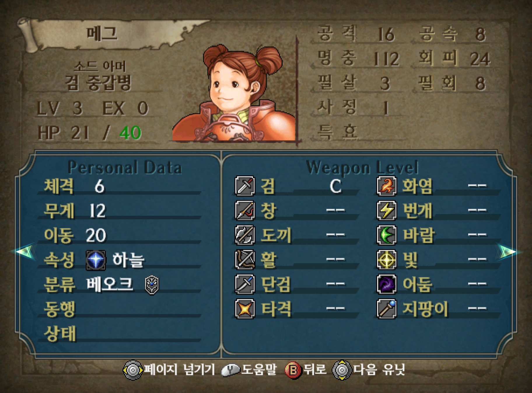 4장 거점에서는 메그가 등장합니다. 회화 탭에 떠 있는 회화 중 하나를 보면 합류하며, 메그는 창염의 궤적에서도 나오고 새벽의 여신에는 당연히 등장하는 배불뚝이 탱커 채프의 딸입니다. 아비를 닮아 딸도 돼지 형이고 솔직히 미형은 아니라서 키우기도 싫은 데다가 느린 공속으로 성장이 무지 어렵습니다.