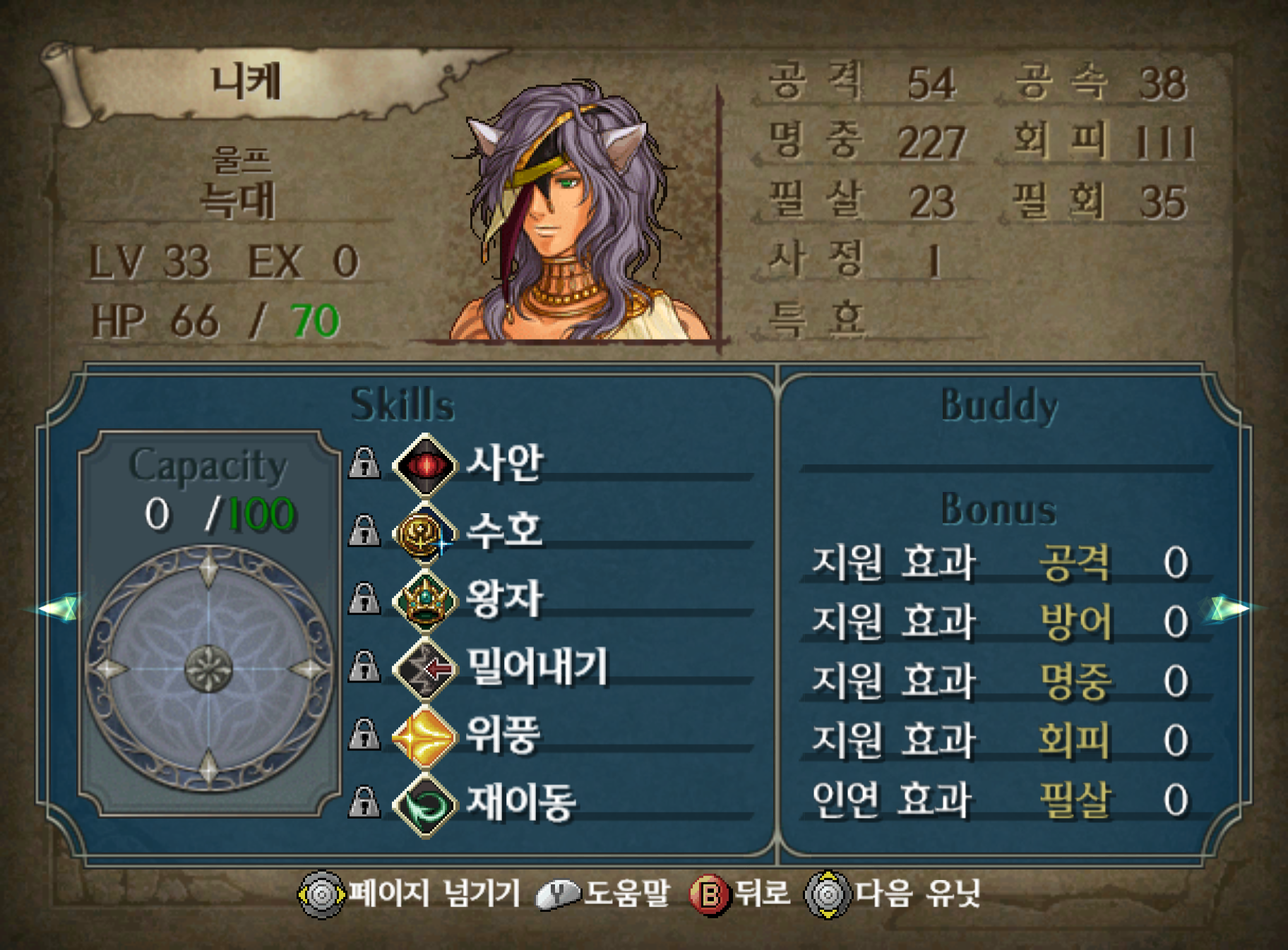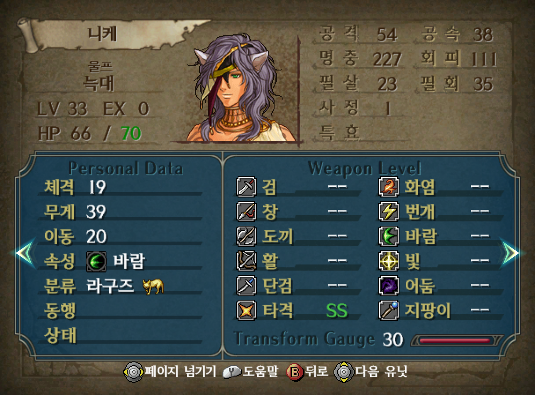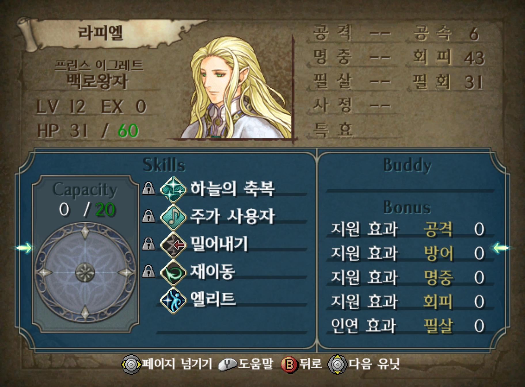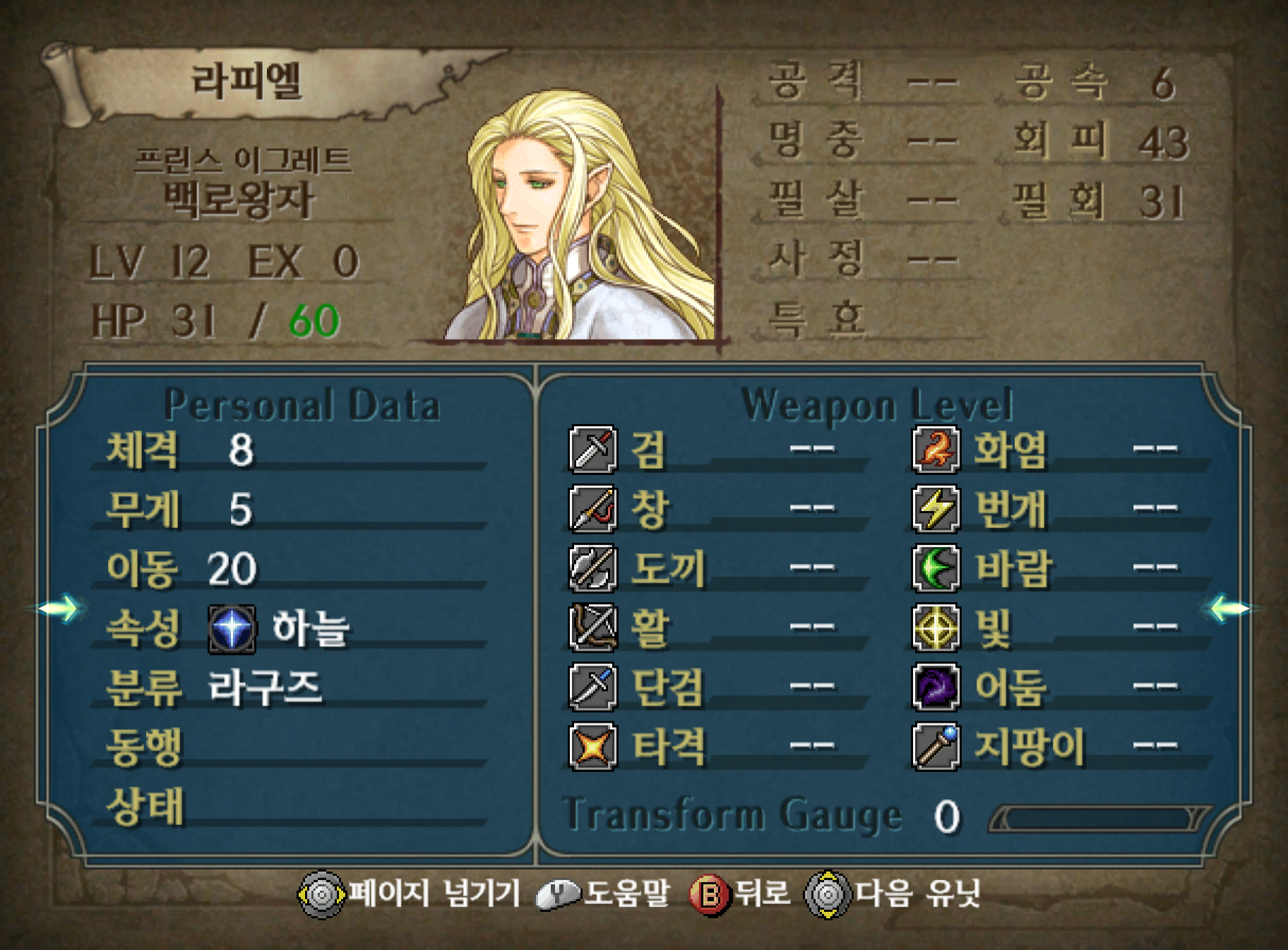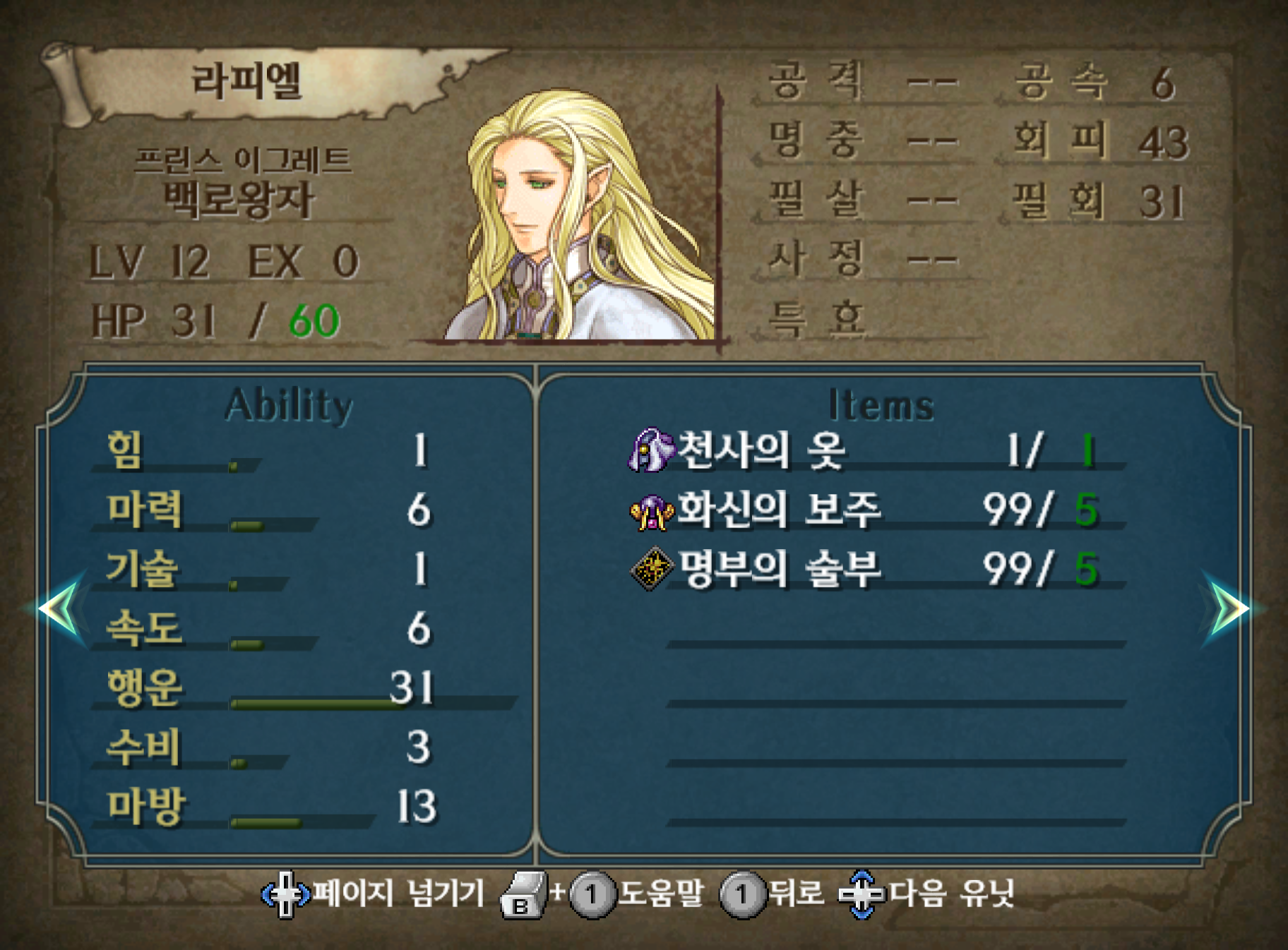 라피엘은 공격 능력이 전혀 없으나 명부의 술부라는 아이템을 소지하면 1~2턴 사정거리는 가지는 마법 공격이 가능합니다. 아이템이라 소모성이고 사실 이 시점에서는 디버그 모드에서 또는 AR CODE로 생성하지 않으면 확보할 수 없습니다. 하지만 치팅 좋은 것이 무엇이겠습니까! ^^