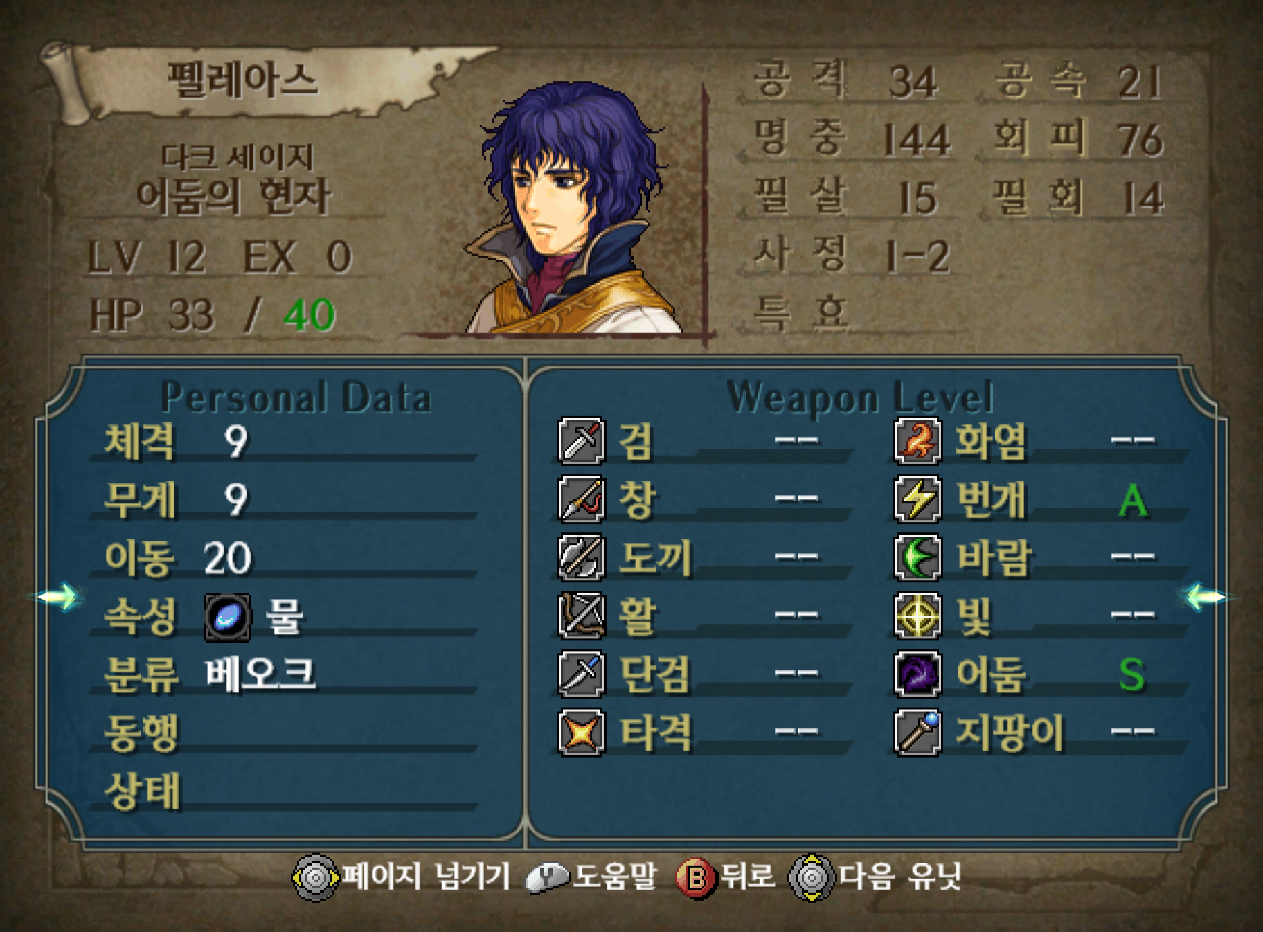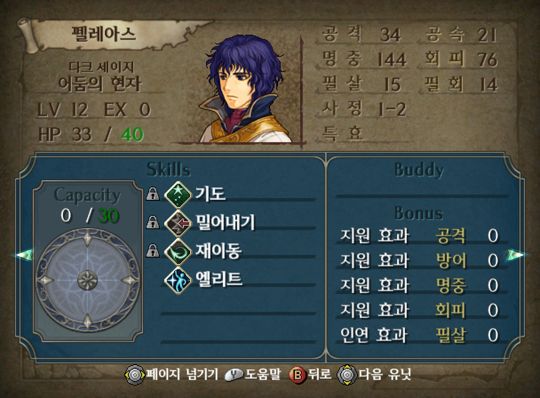 4부 시작에서 티반이 2 턴에서는 펠레아스가 등장합니다. 단 펠레아스는 2회 차 이상과 3부 13장에서 선택지를 할 수 없다를 고르는 조건을 모두 충족해 놔야 합니다. 펠레아스는 암흑마법을 사용하는 매우 희소한 법사인데 사실 이 게임에서는 암흑마법이 그닥 강력한 편도 아니고 등장시기도 늦은 편인지라...