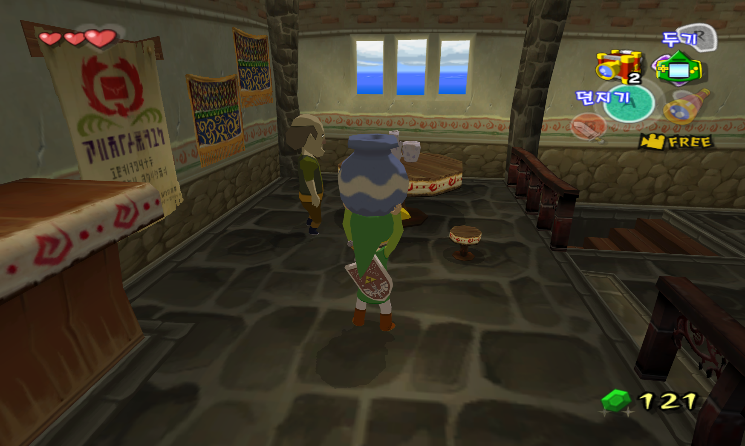 3. 저 대머리 남자가 있는 곳으로 이동 후 다음과 같은 구도에서 항아리를 던집니다.