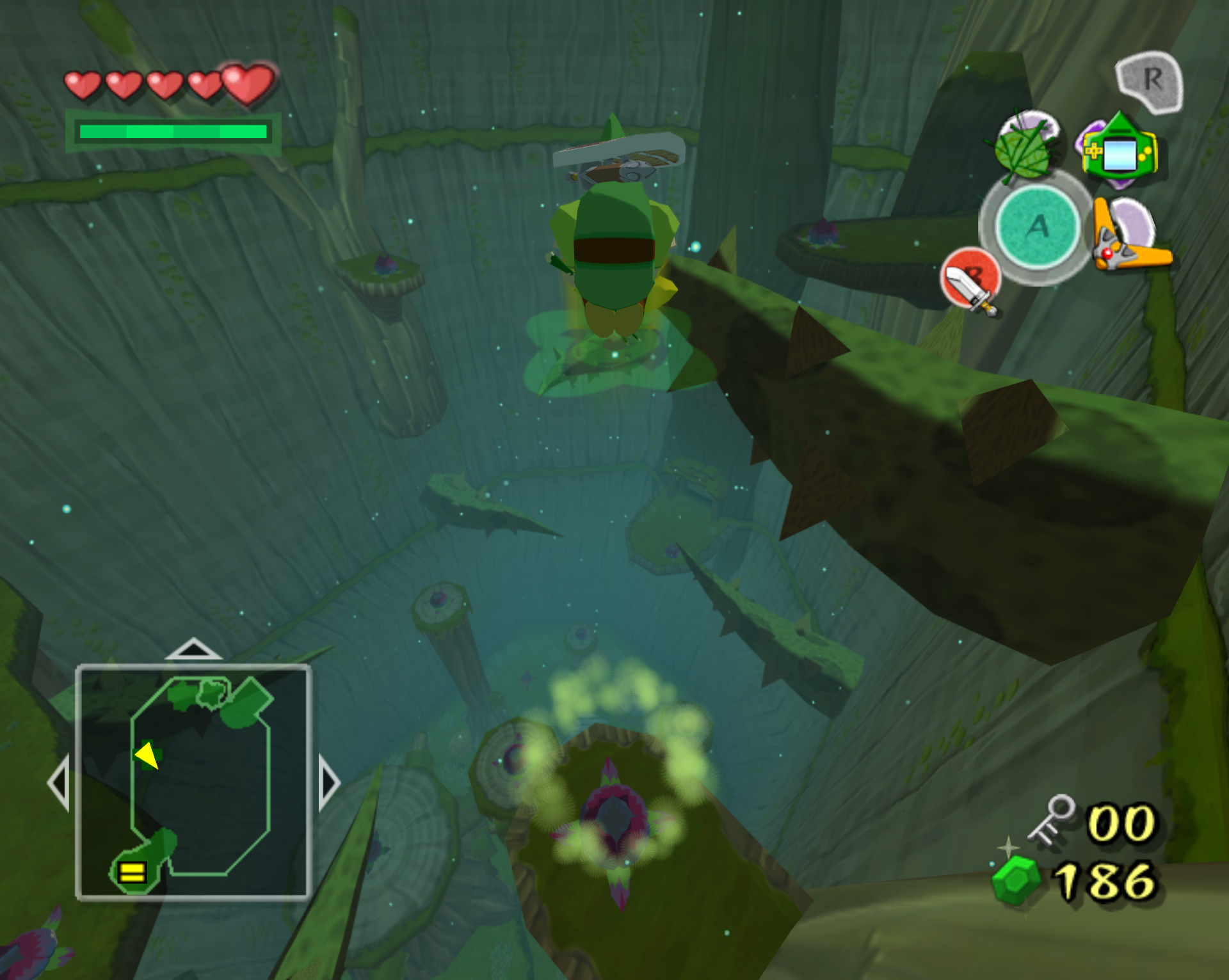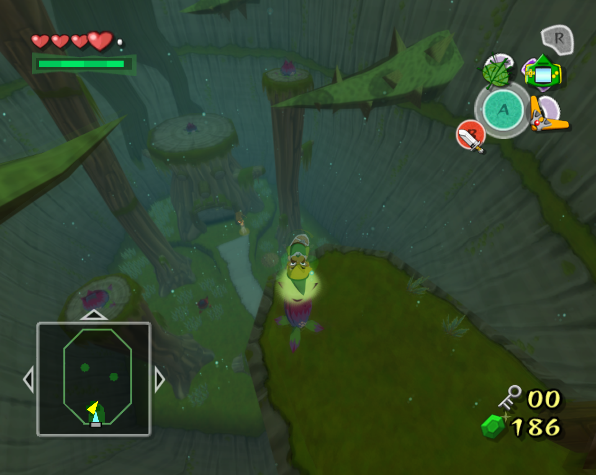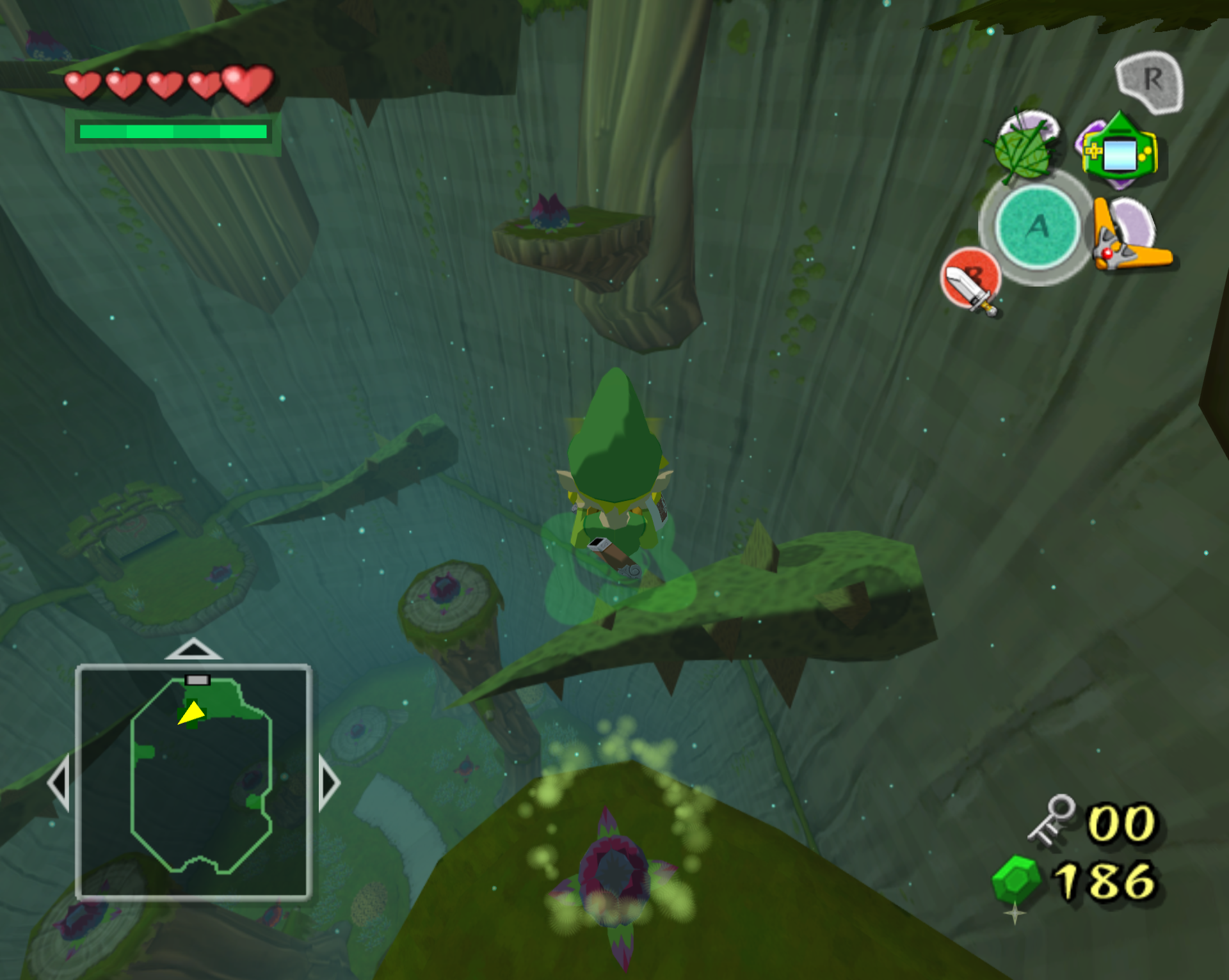 금단의 숲 던전 1층 시작 방 (워프 항아리 있는 방)에서 다음방으로 → 점핑 봉우리 이용해서 2층으로 올라간 후 → 2층에서도 마찬가지로 점프 봉우리들을 이용해서 3층의 보물 상자 방으로 진입.