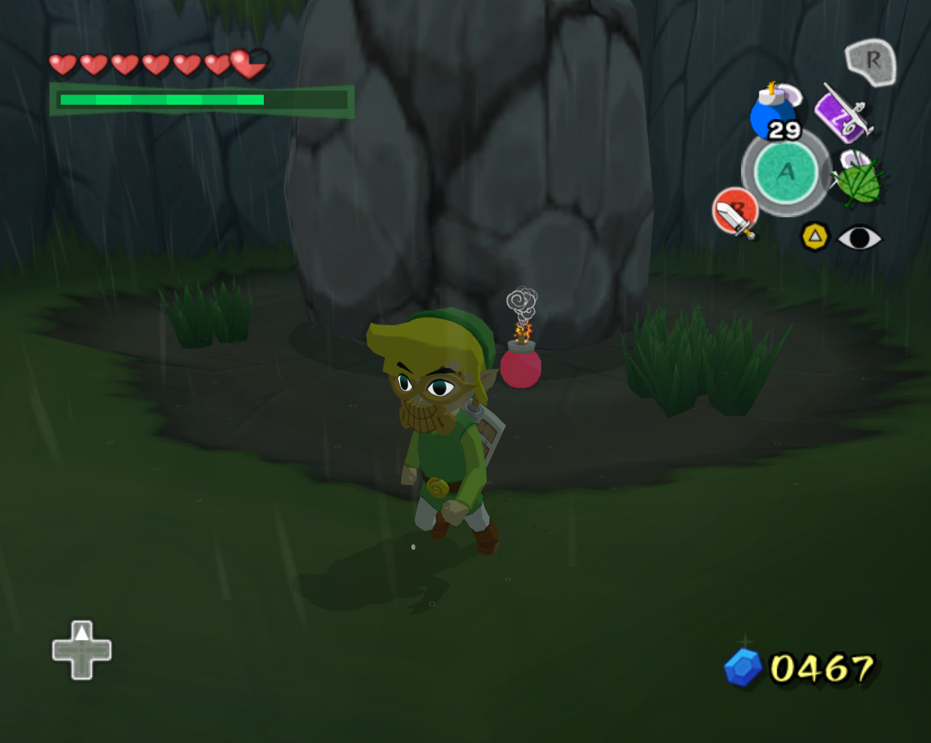이 이벤트는 데크 잎과 폭탄이 있어야 진행이 가능합니다. 프롤러 섬에서 테트라가 새에게 잡혀가다가 떨어졌던 동굴 안에는 요정의 샘터라는 입간판이 있고, 거대한 바위가 하나 놓여 있는 곳이 있습니다.