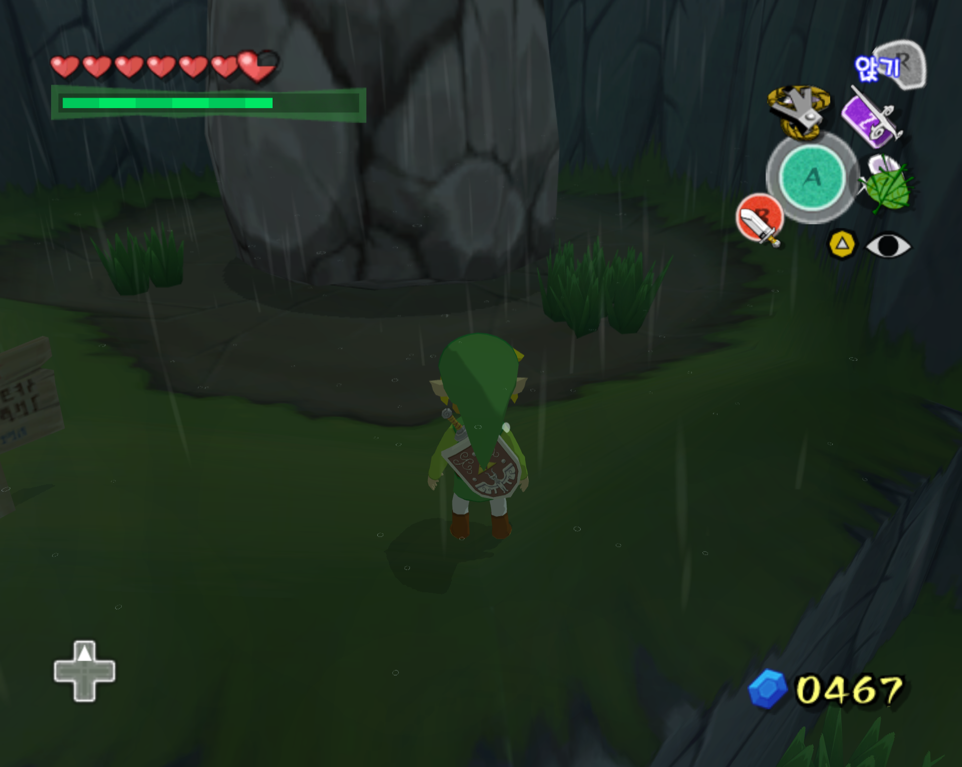 그 바위에 폭탄을 사용하면 밑으로 내려갈 수 있는 구멍이 있고 그곳에서 대요정이 루피를 증가시켜 주는 주머니를 줍니다. 다만 이 이벤트를 진행할 수 있는 시점에서는 아예 다리가 다 박살 나 있기 때문에 테크 잎을 사용해서 날아가야 합니다.