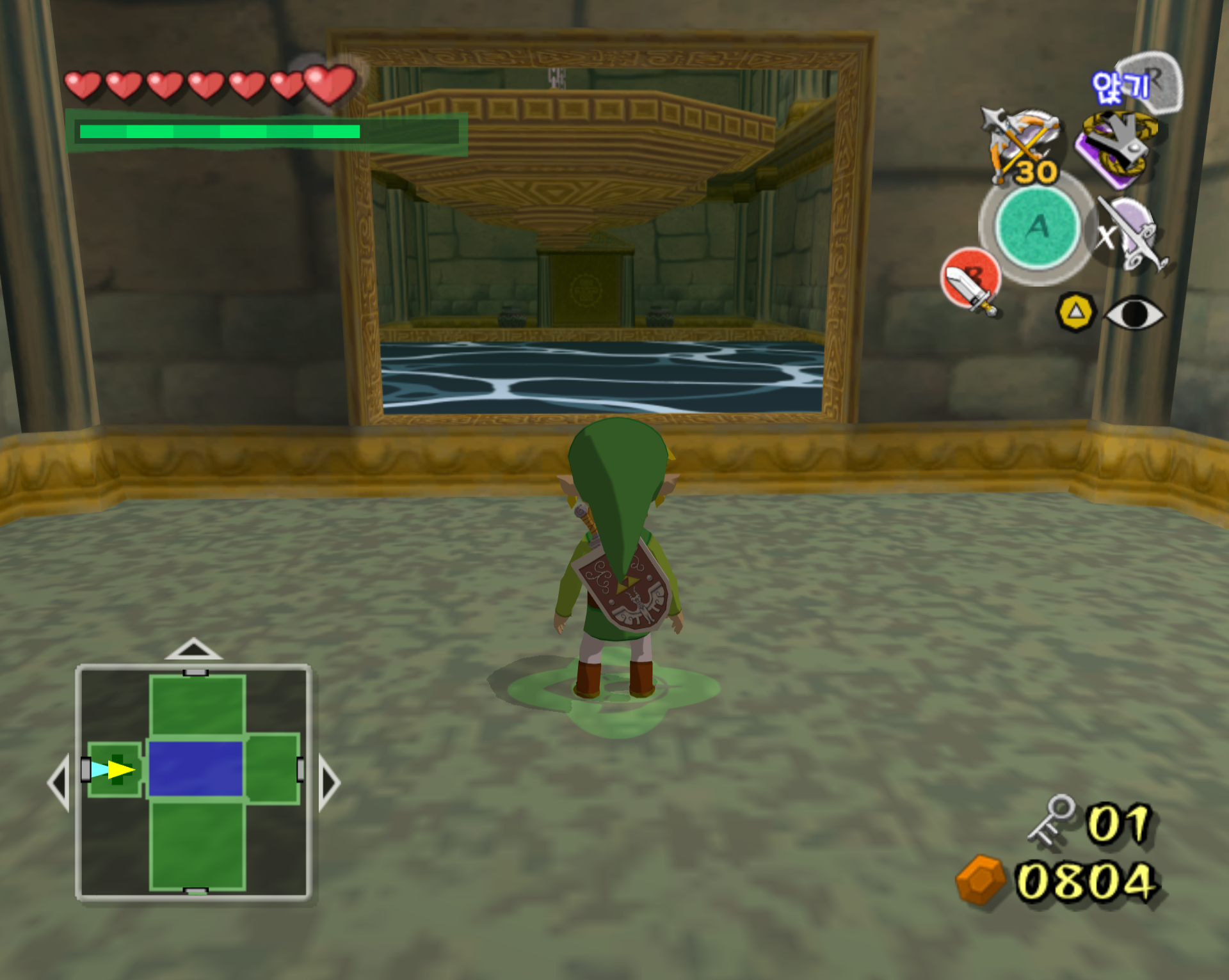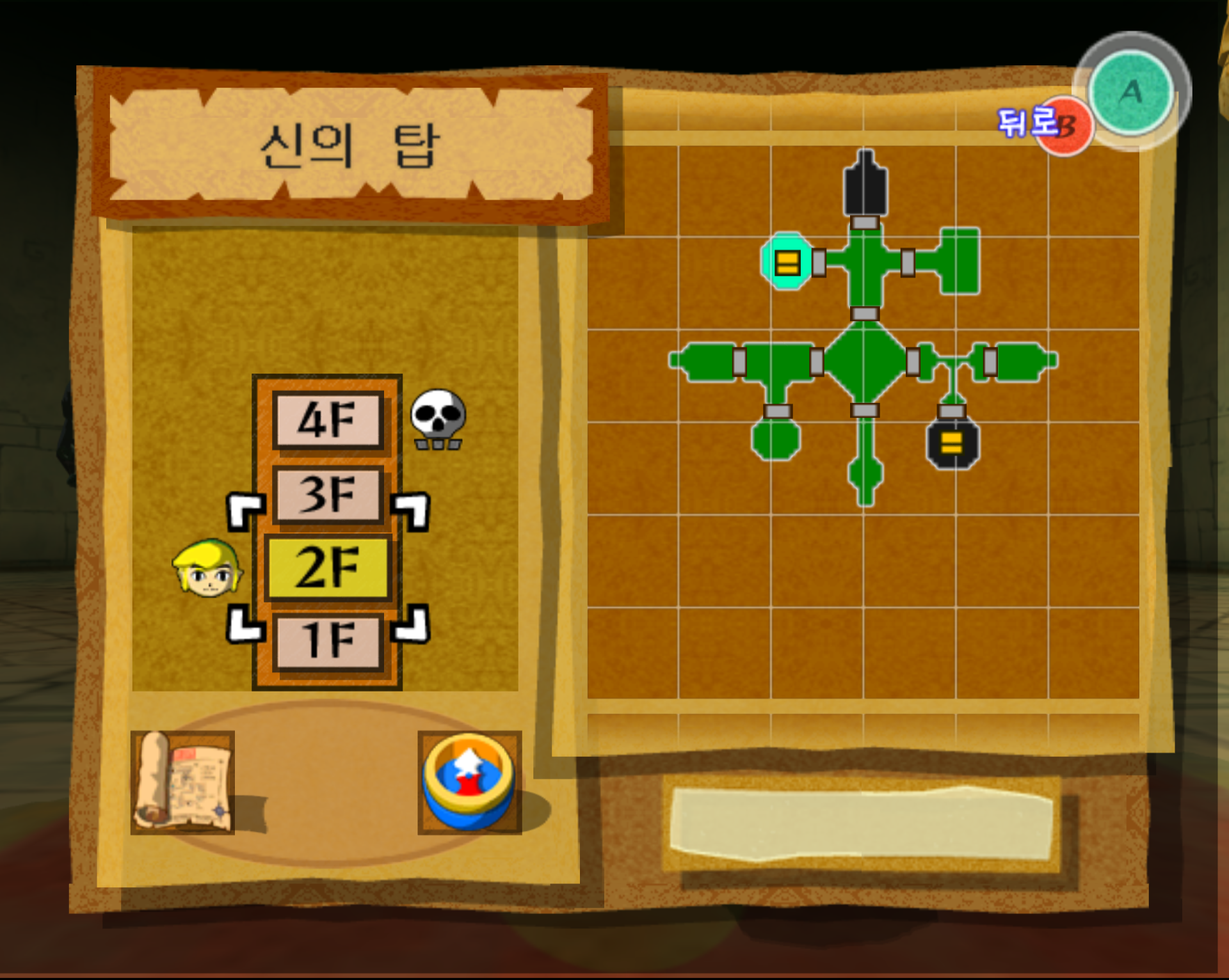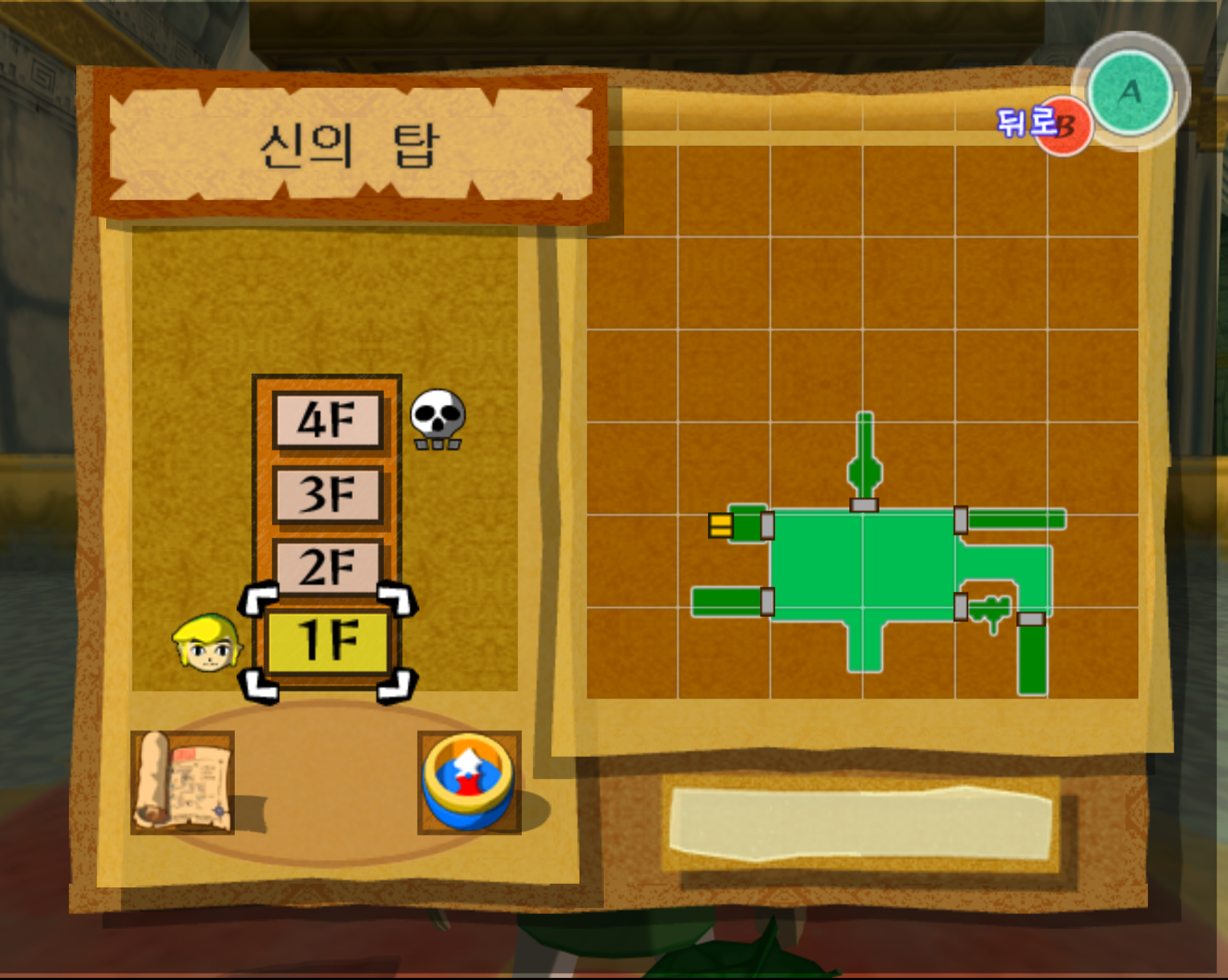 ■ 신의 탑 1층 지도를 보면 좌측 상단에 보물 상자가 표시되어 있습니다. (노란색 상자) 해당 방은 나침반을 얻은 방으로 방에 들어가 보면 벽 상단에 눈이 하나 있습니다. 눈알에 화살을 쏴야 하므로 활을 얻고 나서 와야 합니다.