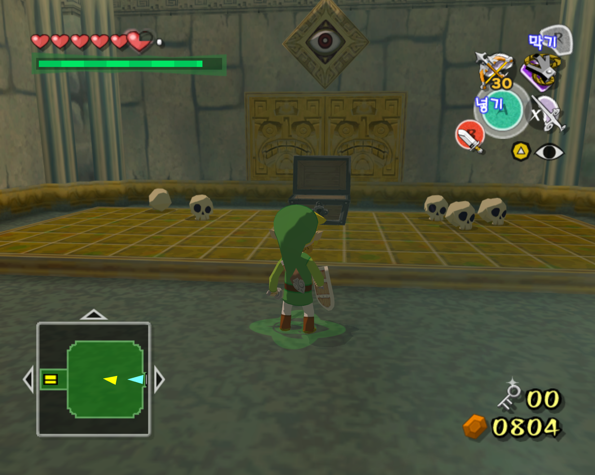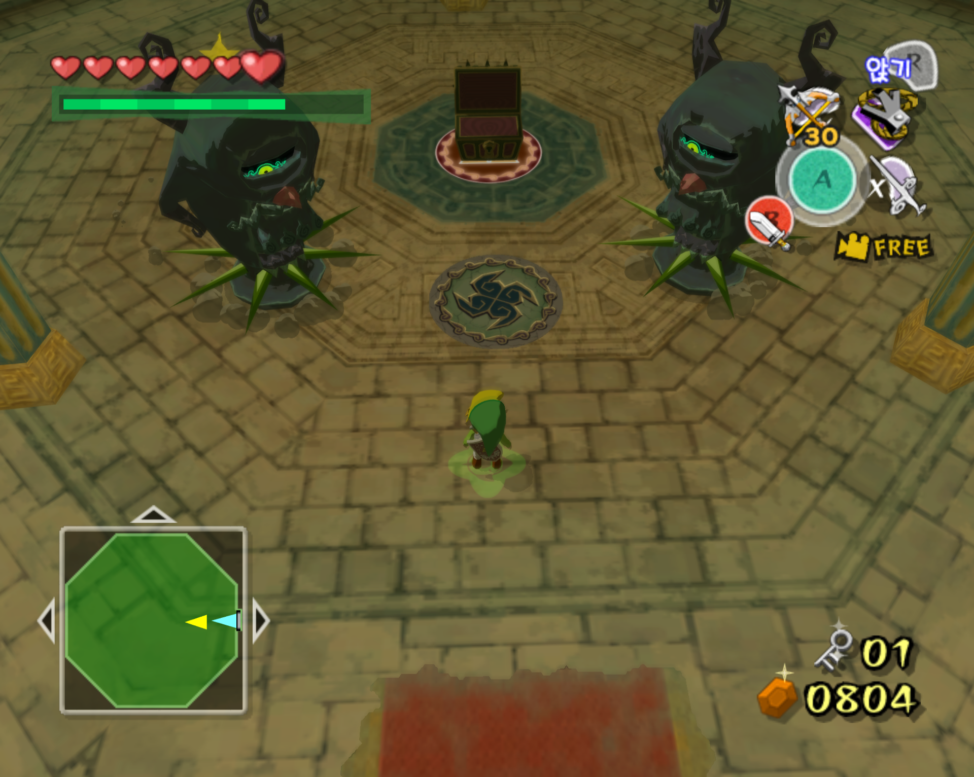 ■ 방에 들어오면 아래 스샷에 보이는 바와 같이 바람개비 표식이 되어 있는 곳이 있는데 거기서 지휘봉으로 바람의 노래를 지휘하면 보물상자가 나타납니다. 두 석상은 원래 움직이지 않지만 보물상자가 나타나면 움직입니다. 무시하고 보물 지도만 챙겨서 나오면 됩니다.