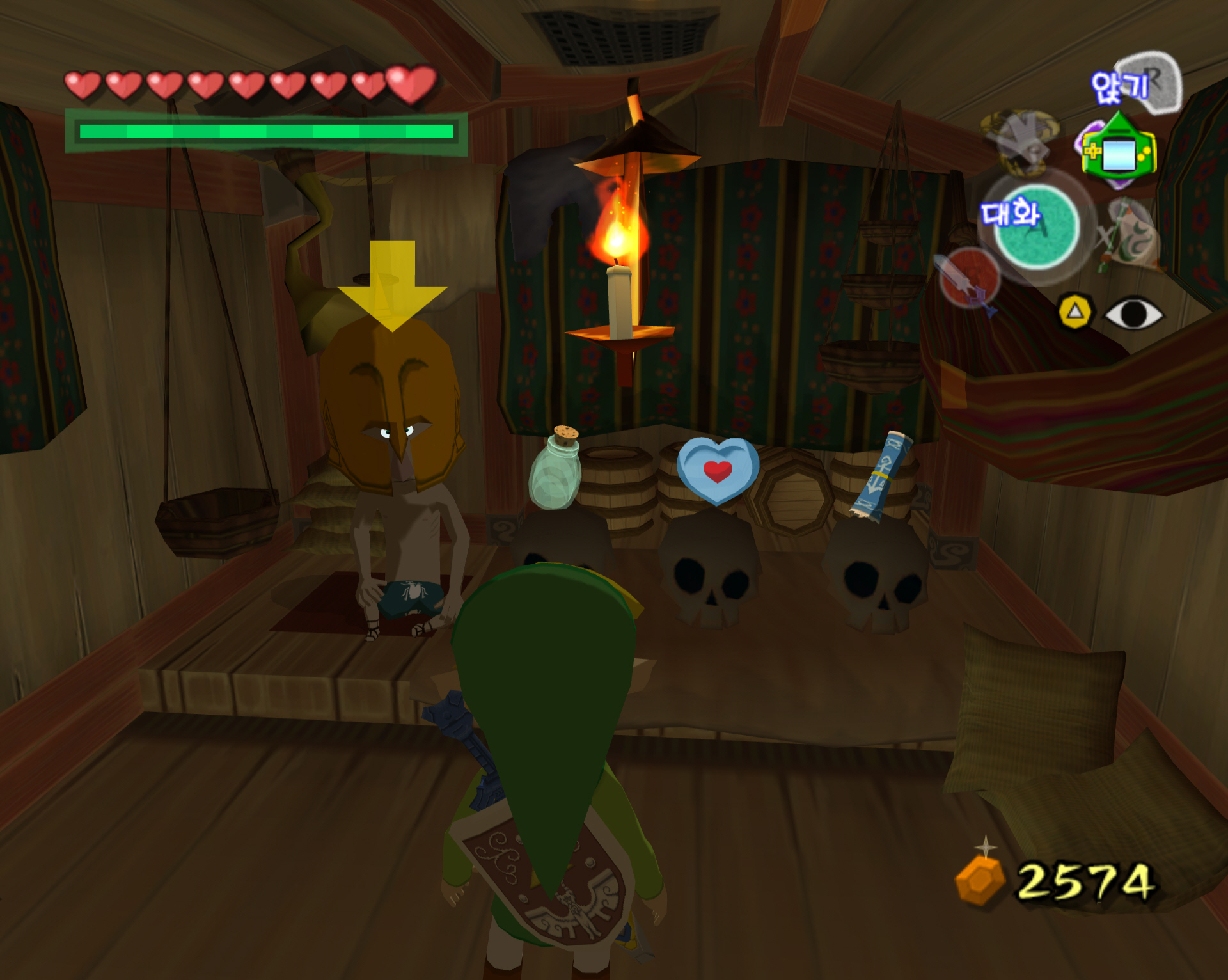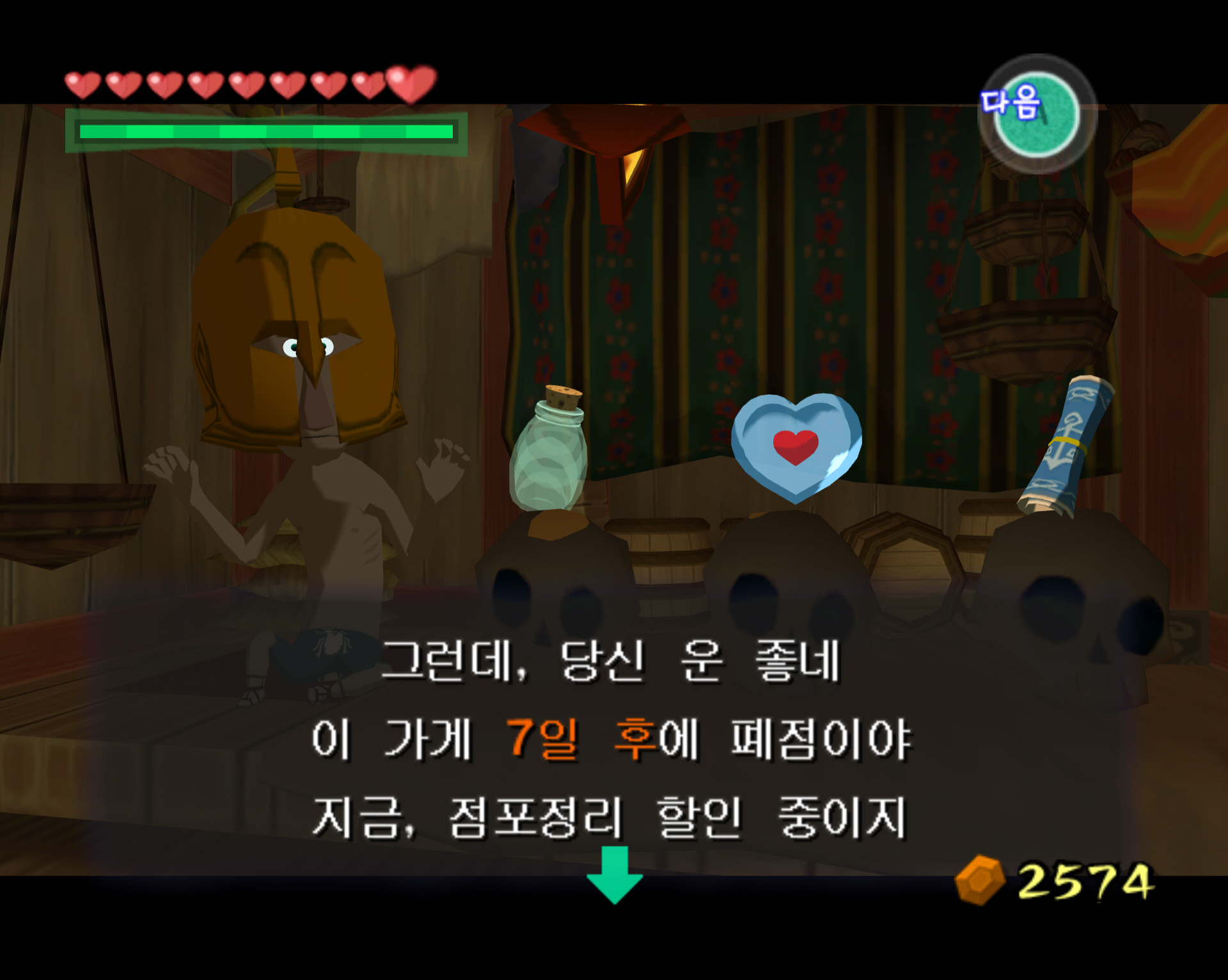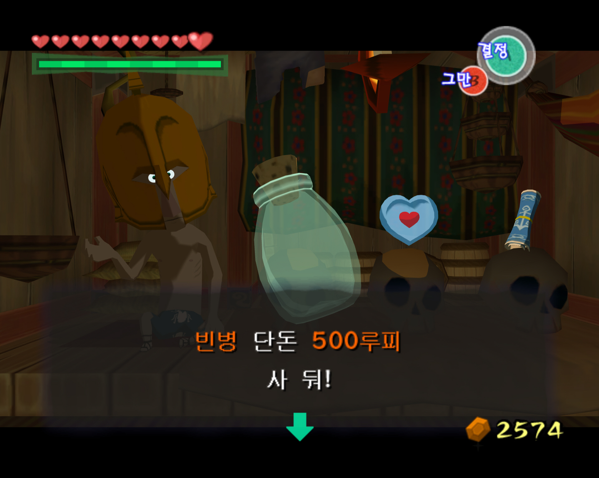 뽀족바위섬 주변에는 가면을 쓴 테리 상점배가 돌아다닙니다. 여기서는 하트조각, 빈병 그리고 보물지도 4번을 팝니다. 이 글에서는 빈병 구매를 올려보도록 하겠습니다. 금액은 500루피가 필요합니다. 루피 주머니 2개를 모두 얻고 최소한 2350루피 정도는 준비해서 갑시다. (하트조각 보물 지도도 구매하려면 그 정도가 필요합니다.)