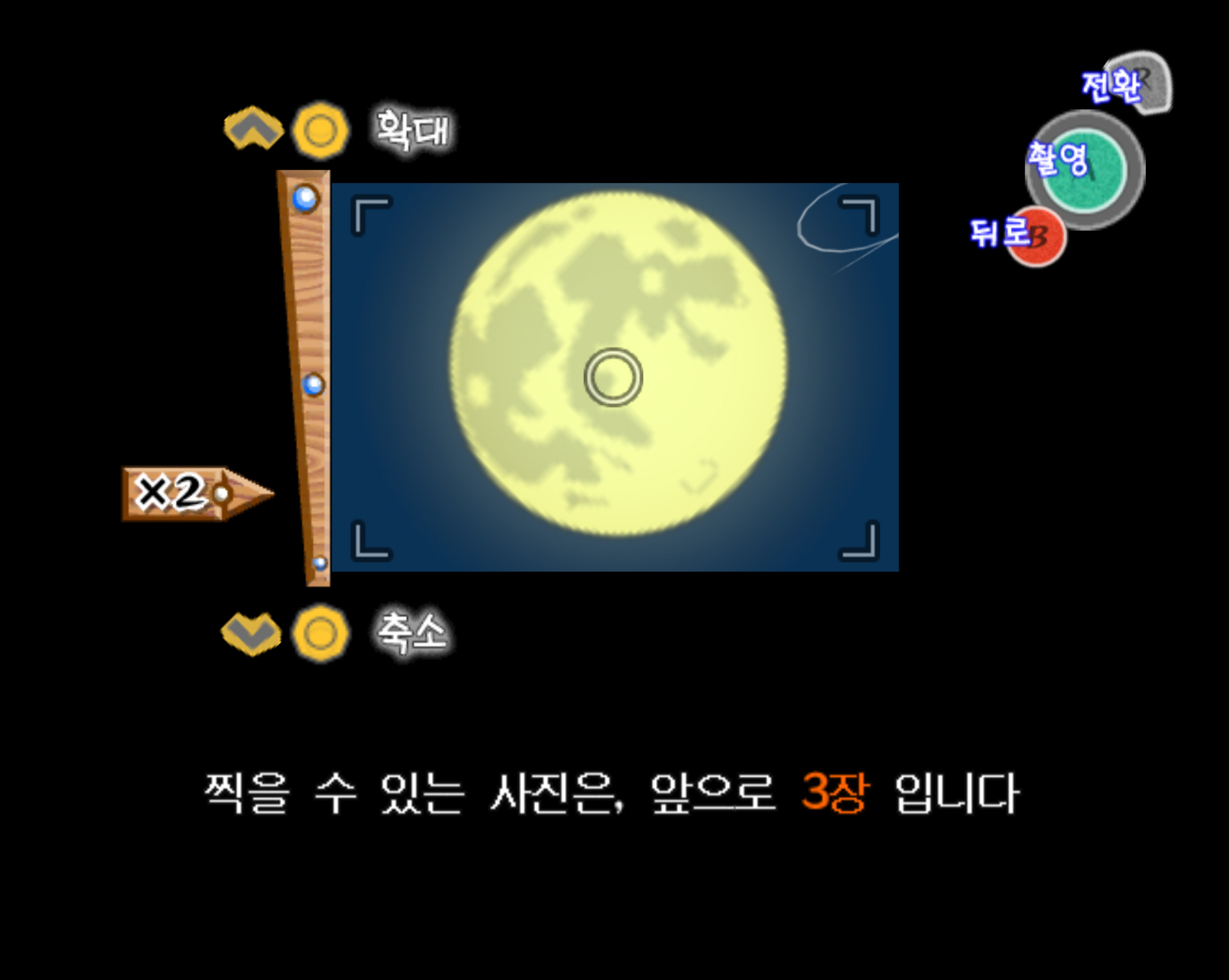 바람의 지휘봉으로 주야를 변경해서 밤 시간이 되게 합니다. 보름달을 찍어야 하기 때문에 하늘에 달이 보름달이 아니라면 주야를 여러번 바꾸서야 합니다. 보름달이 걸린 밤이 되면 칼라 카메라를 꺼내 보름달이 잘 보이게 찍습니다.