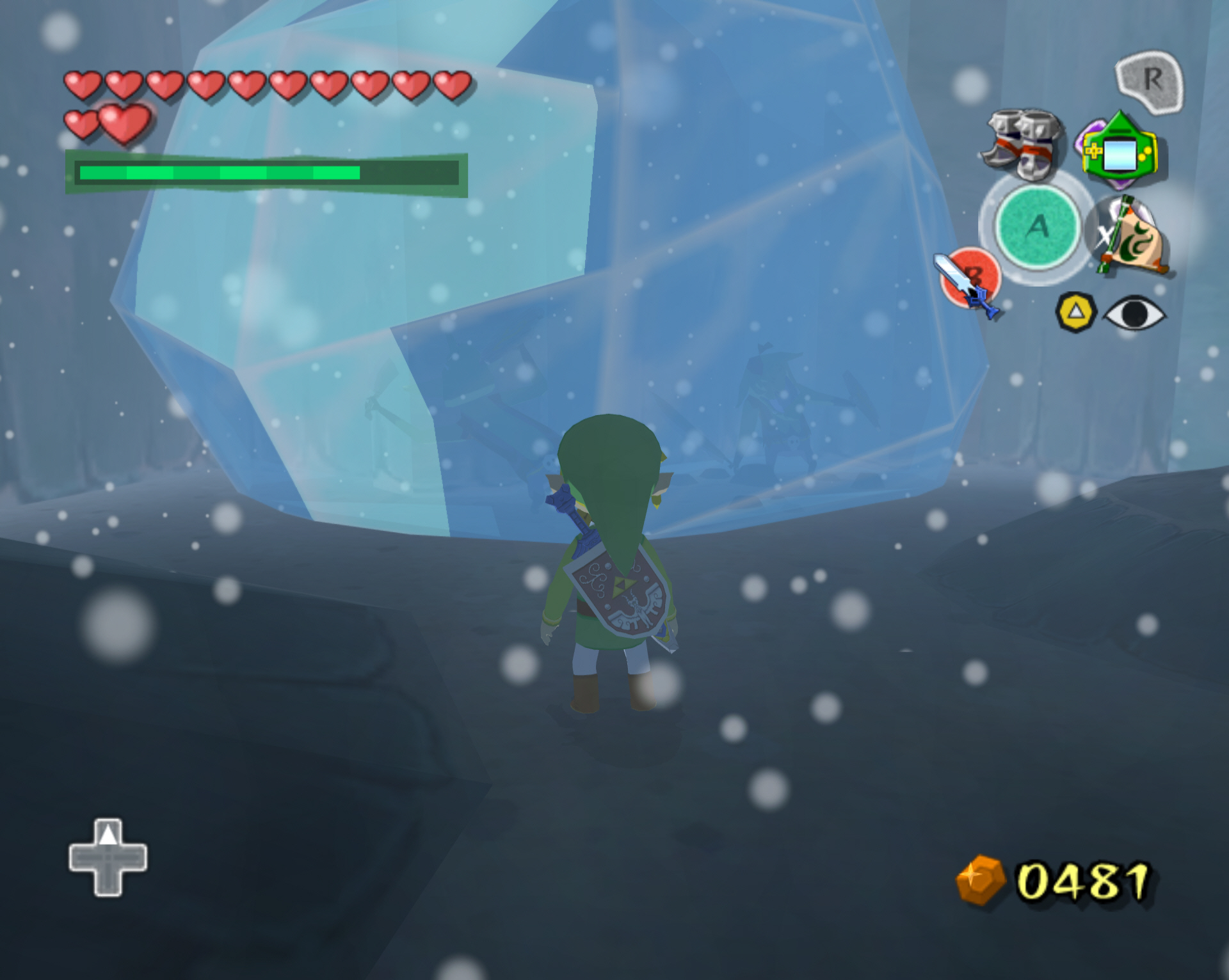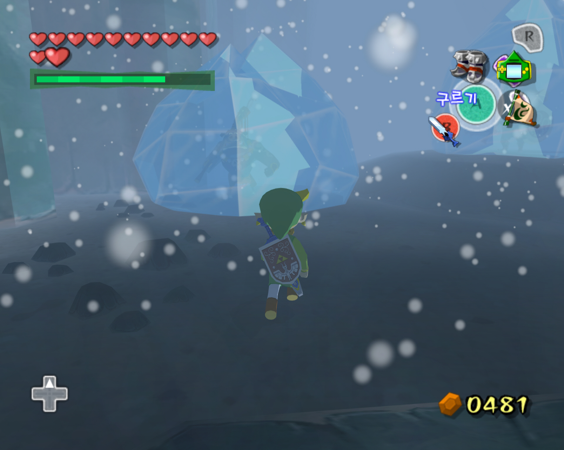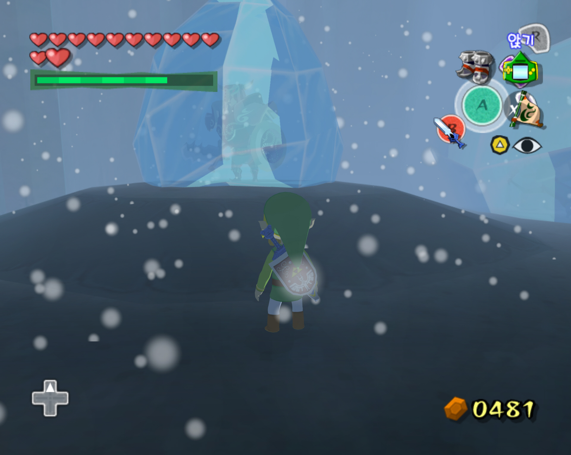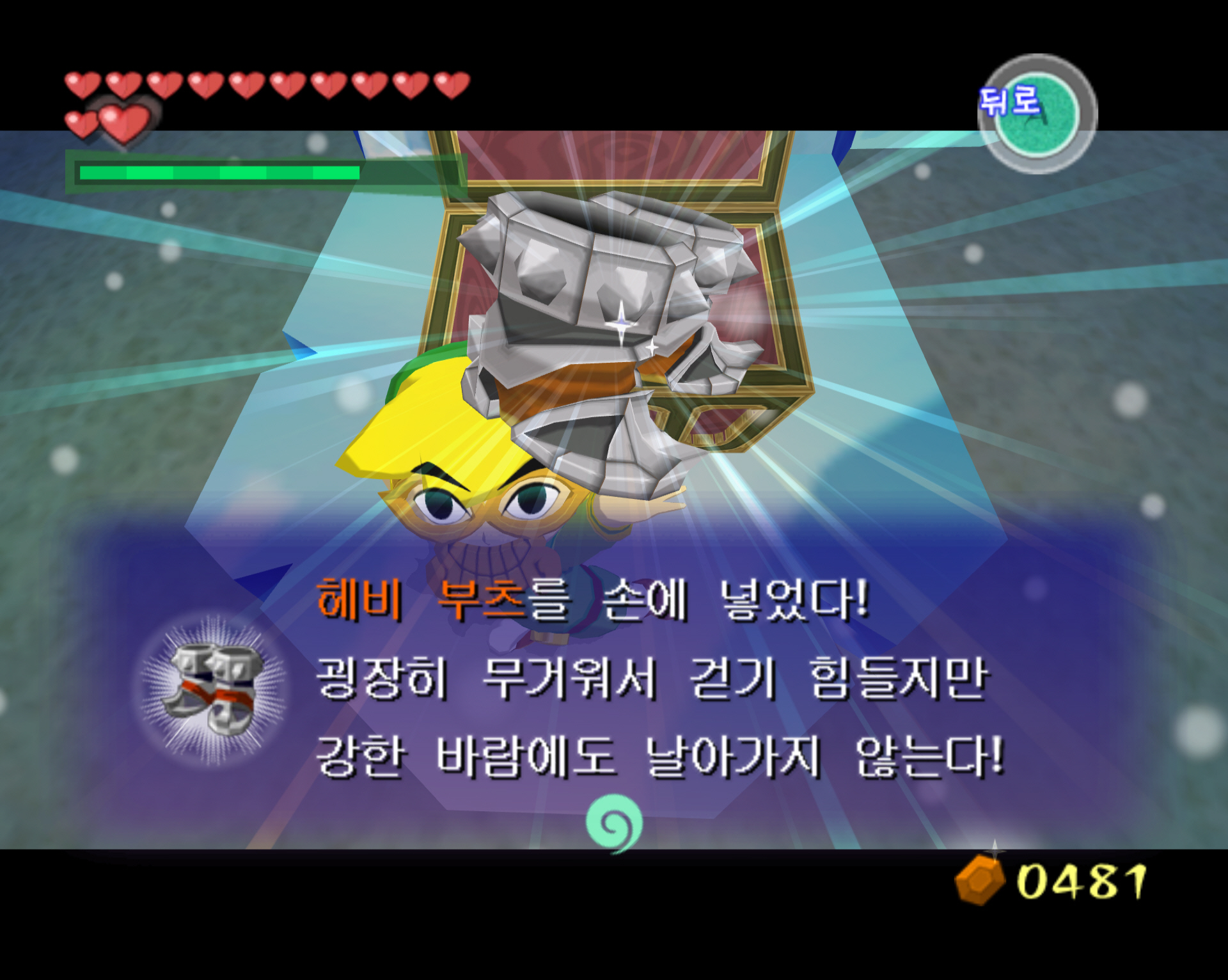 ※ 추가로, 헤비부츠를 얻고 바로 나가지 말고 냉기가 뿜어져 나오는 곳의 구멍으로 빠지면 얼려져 있는 적들이 있습니다. 불화살로 적들을 해동 후, 그 적들을 모두 제거하면 보물 상자가 나오고 100루피 (주황루피)를 얻을 수 있습니다. 스샷과 동영상으로 보겠습니다.