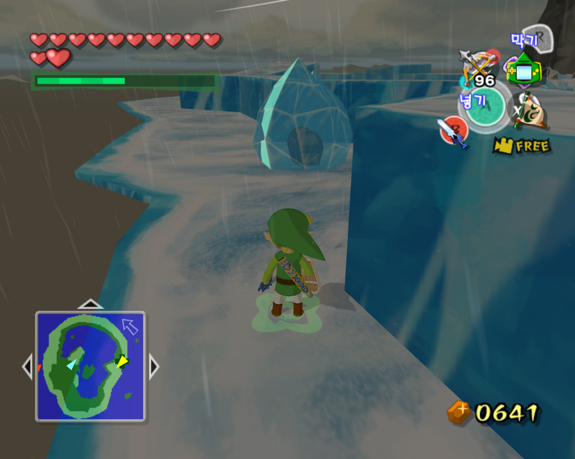지도가 들어 있는 보물 상자가 빙산섬 동측에 얼려져 있고, 빙산섬에 상륙하려면 용대가리에서 뿜는 냉기를 화살에 불의 속성을 걸어서 없애야 합니다. 냉기 나오는데 그냥 상륙하면 링크가 얼어 버려서 어차피 진행이 안되죠.