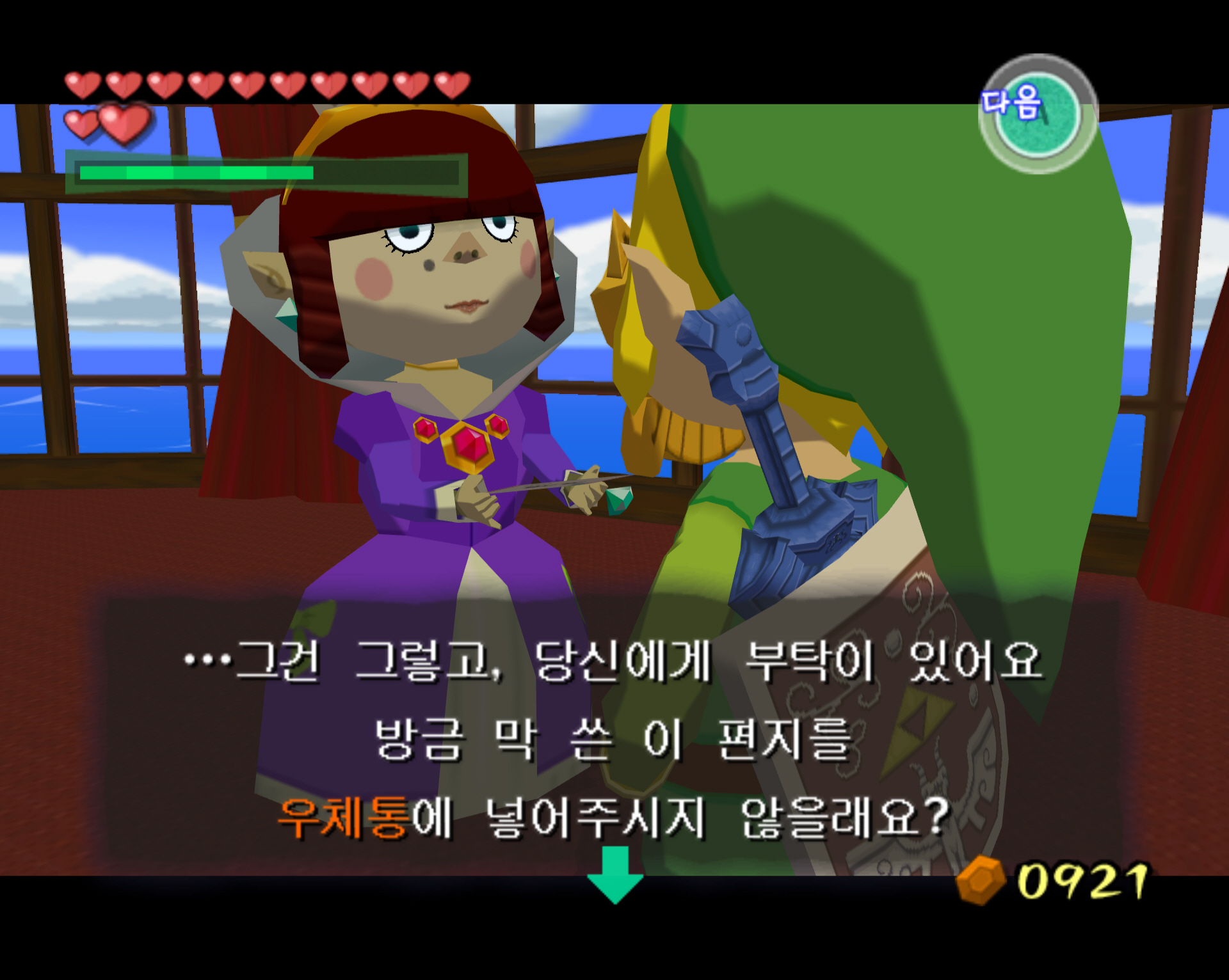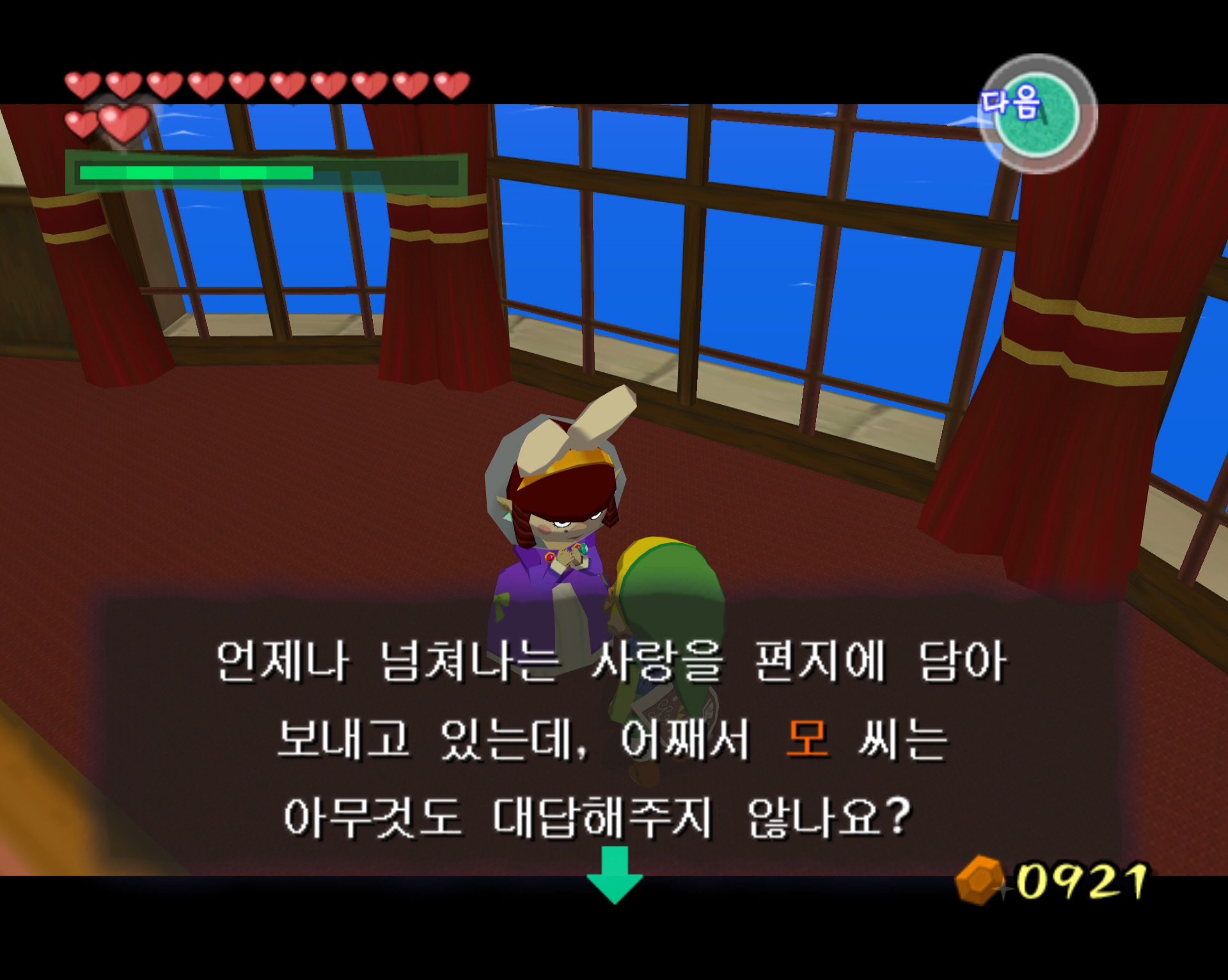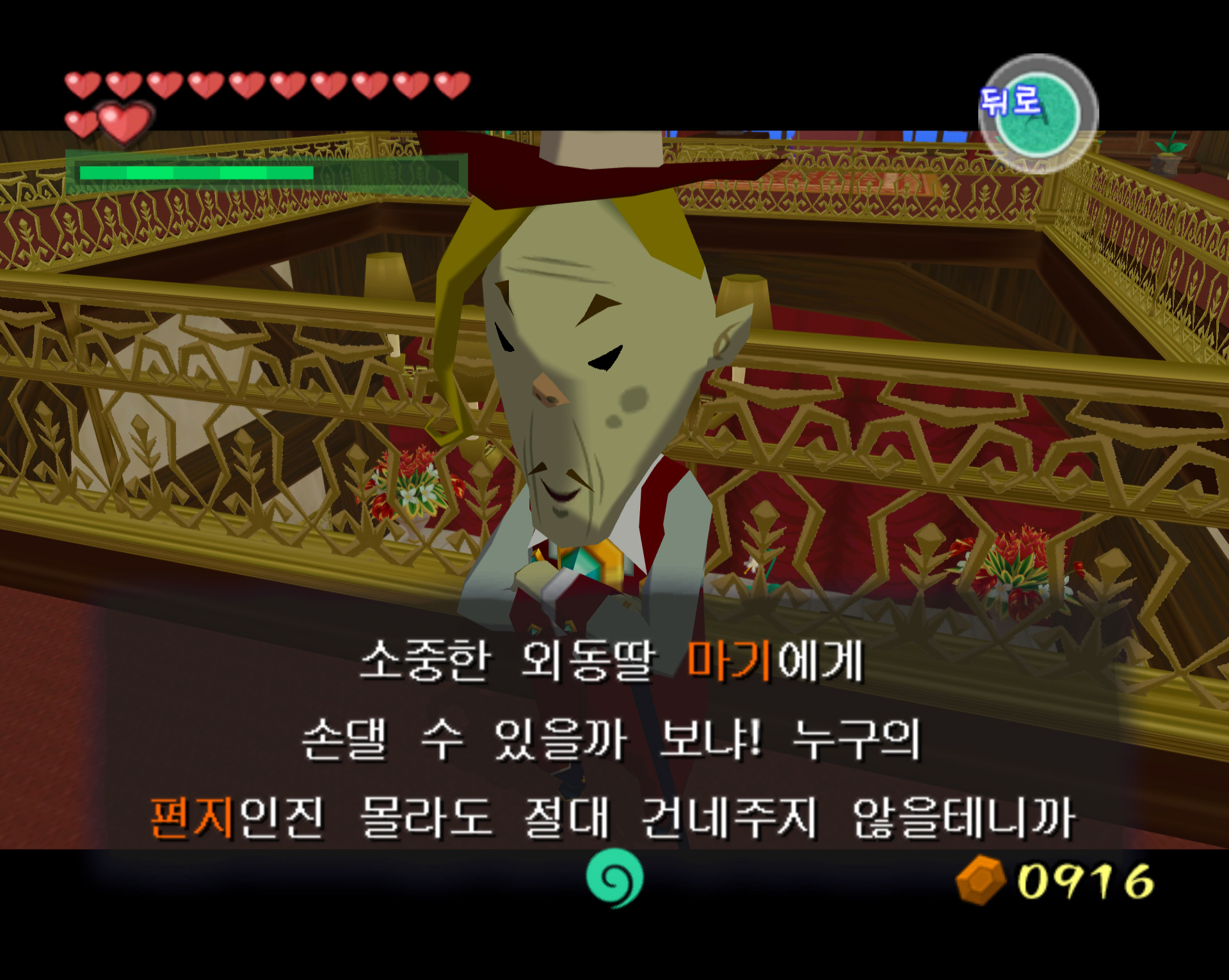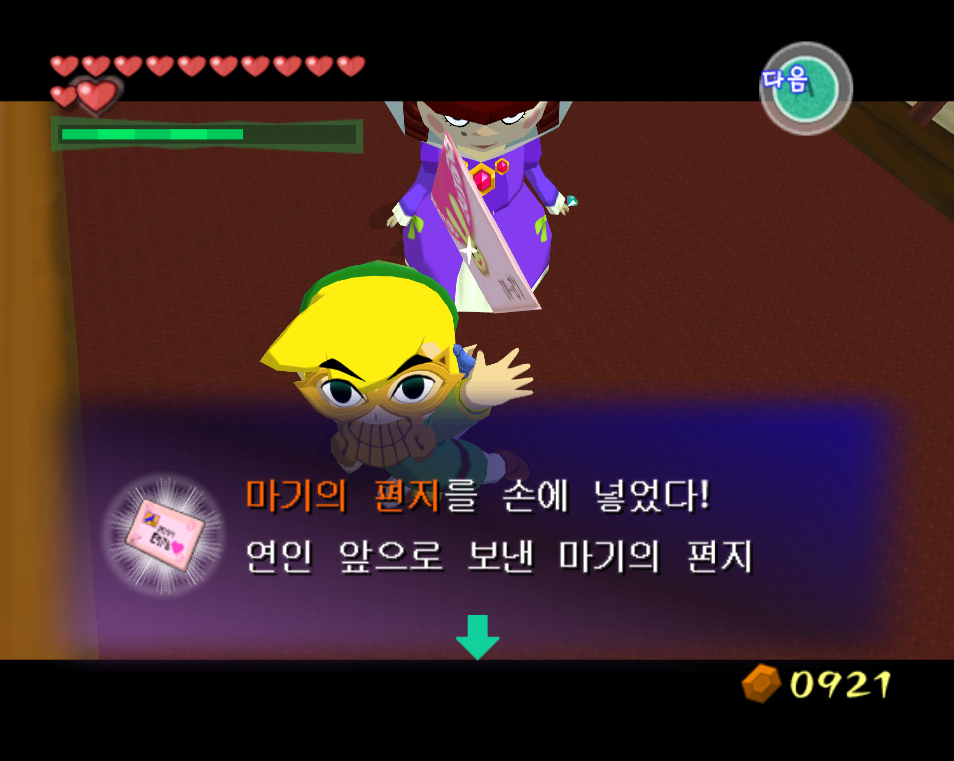 5. 다시 부잣집 2층을 가서 추녀 마기에게 배달부에게서 받은 "모"씨의 답장을 사용하면, 주저리주저리 떠들다가 하트 조각 하나를 답례로 링크에게 줍니다.