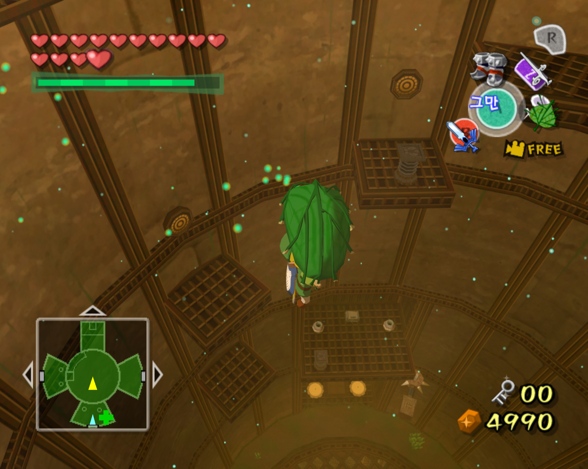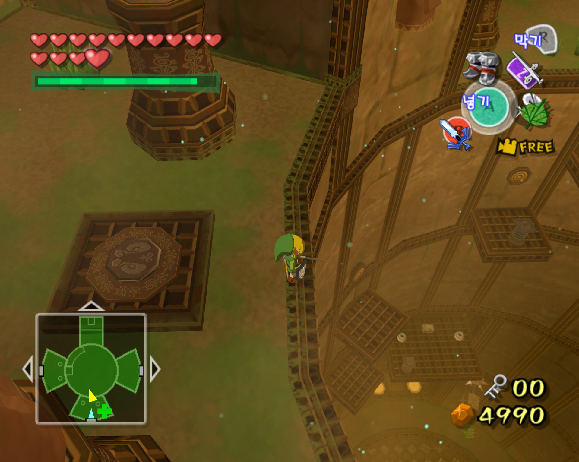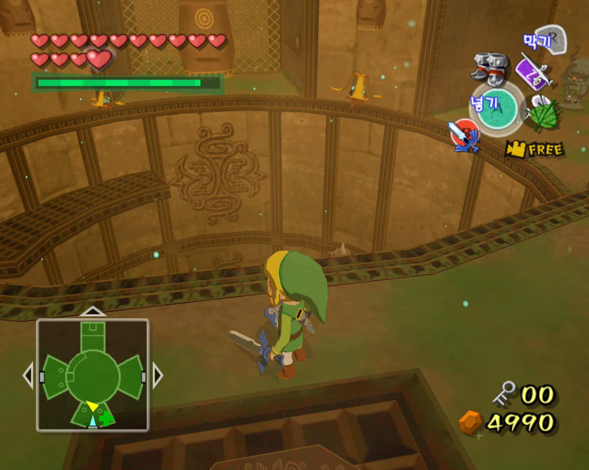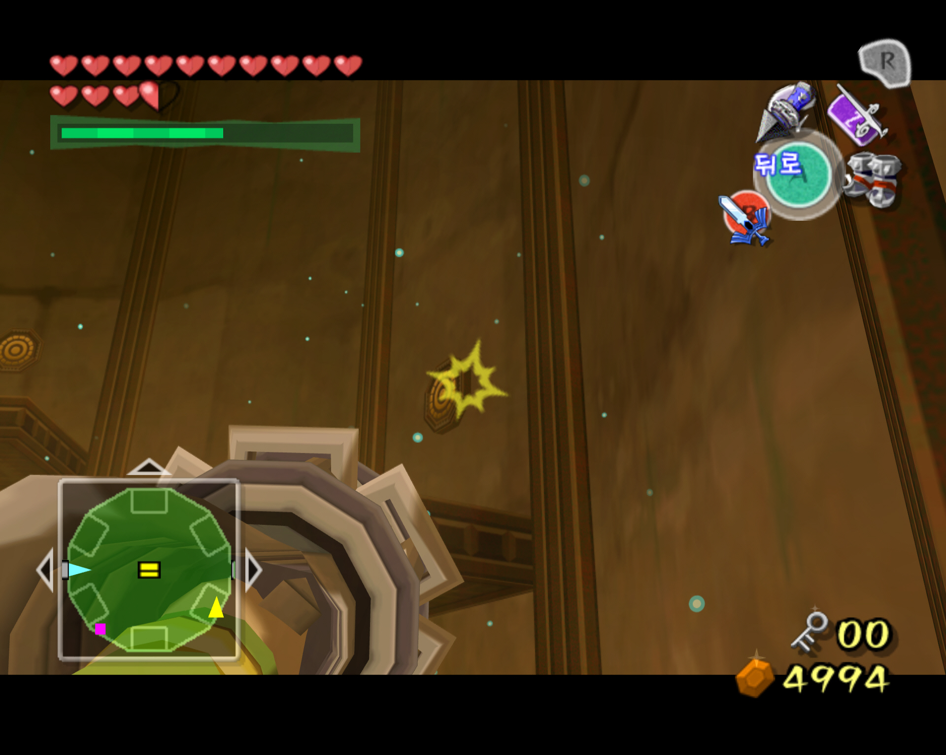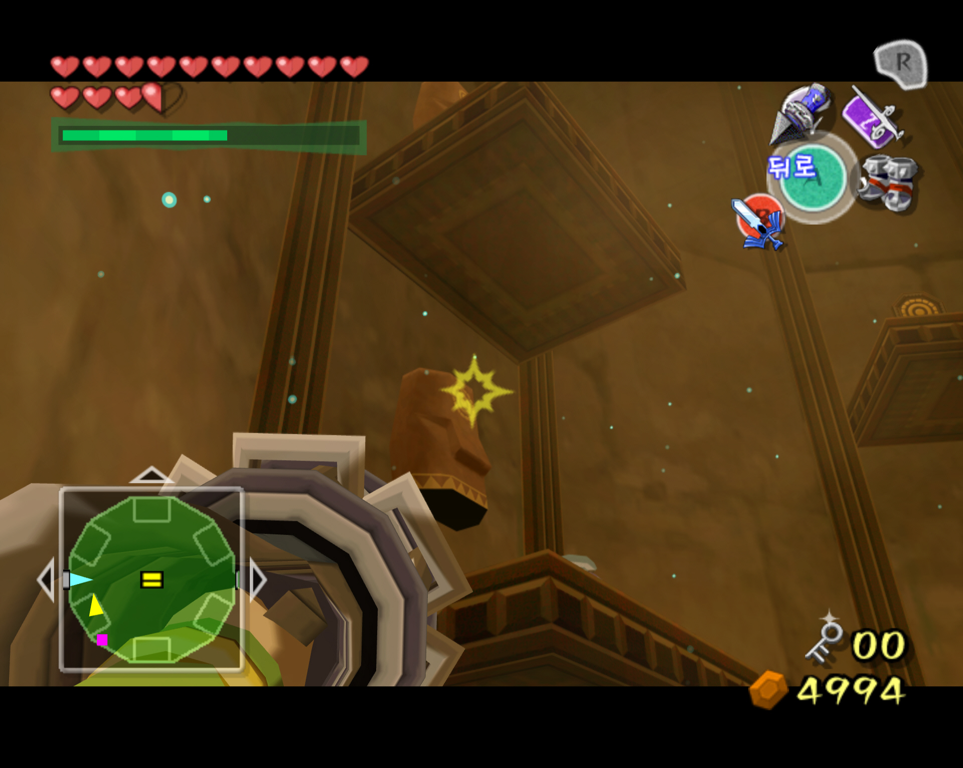 ※ 번외. 벽에 걸린 석상은 훅샷을 걸고 넘어가는 용도로도 사용됩니다. 헤비부츠를 신지 않고 훅샷을 쏘면 되는데, 이 방의 구조상 석상에 훅샷을 걸고 넘어가야 할 곳이 두어 곳 있습니다. 근데 먼저 석상을 헤비부츠 신고 당겨서 걸 곳이 없다면, 테크잎을 타고 넘어가시면 됩니다. 같은 높이의 난간들은 전진하면 링크가 끝 부분에서 점프를 하기 때문에 그때 테크잎을 쓰면 자연스럽게 높이가 높아져 충분히 넘어갈 수 있습니다.