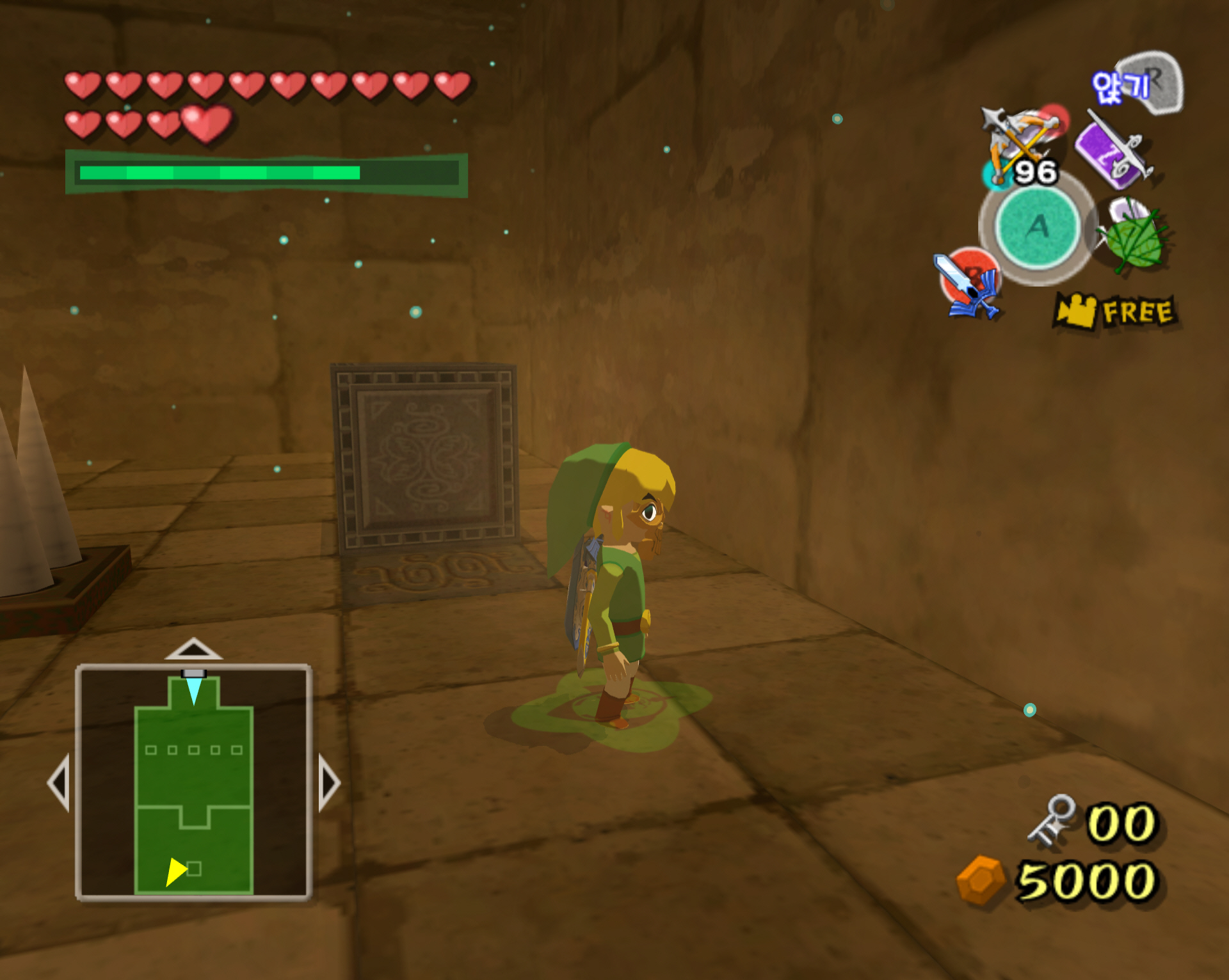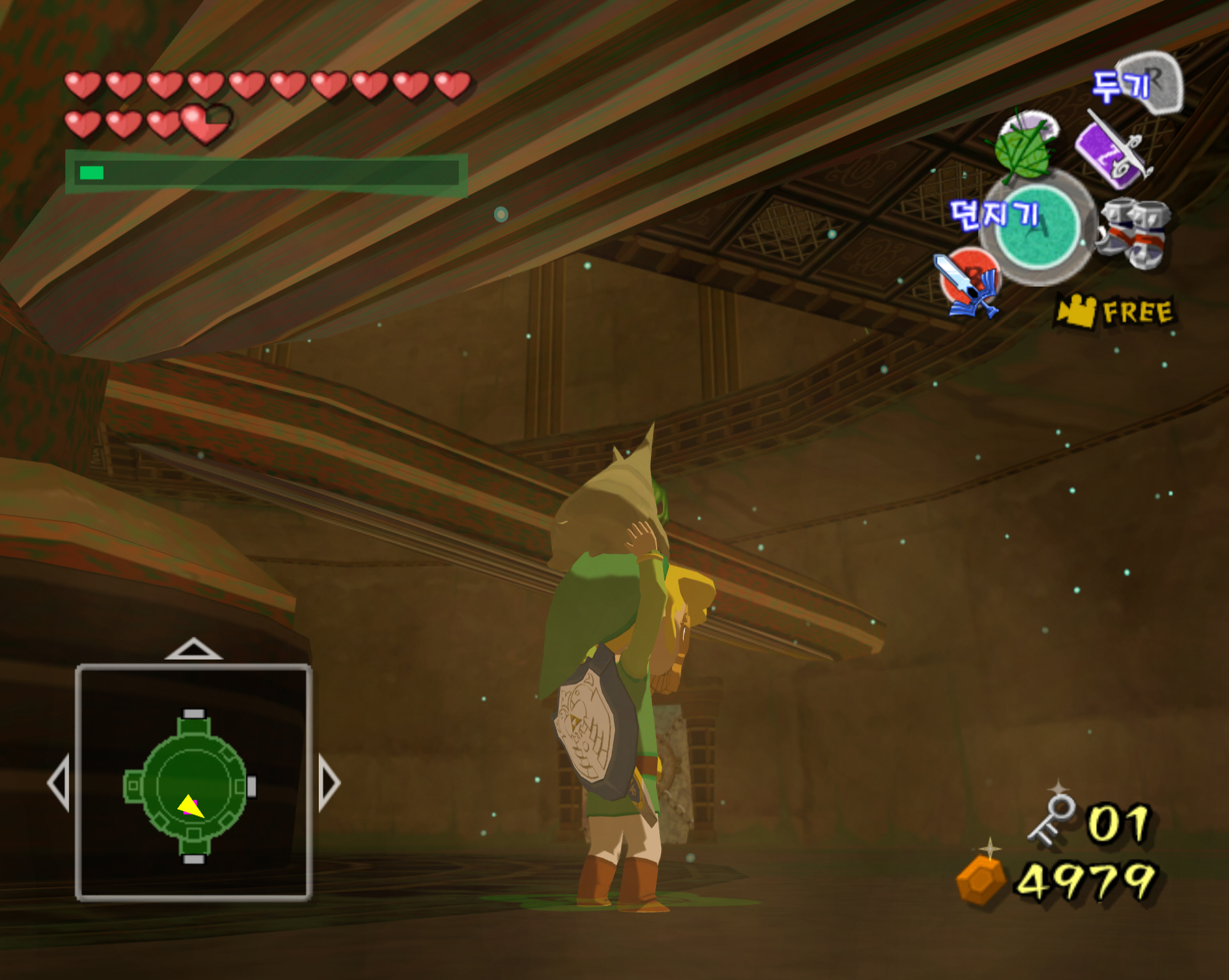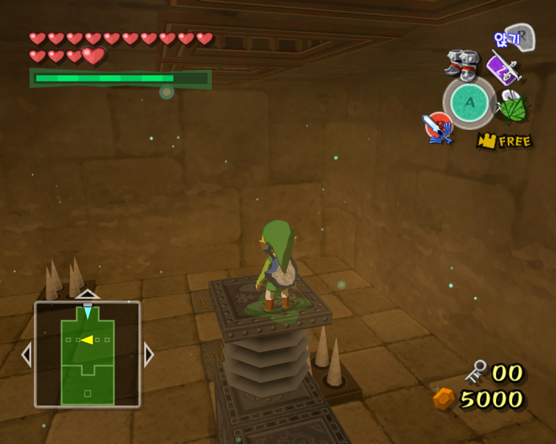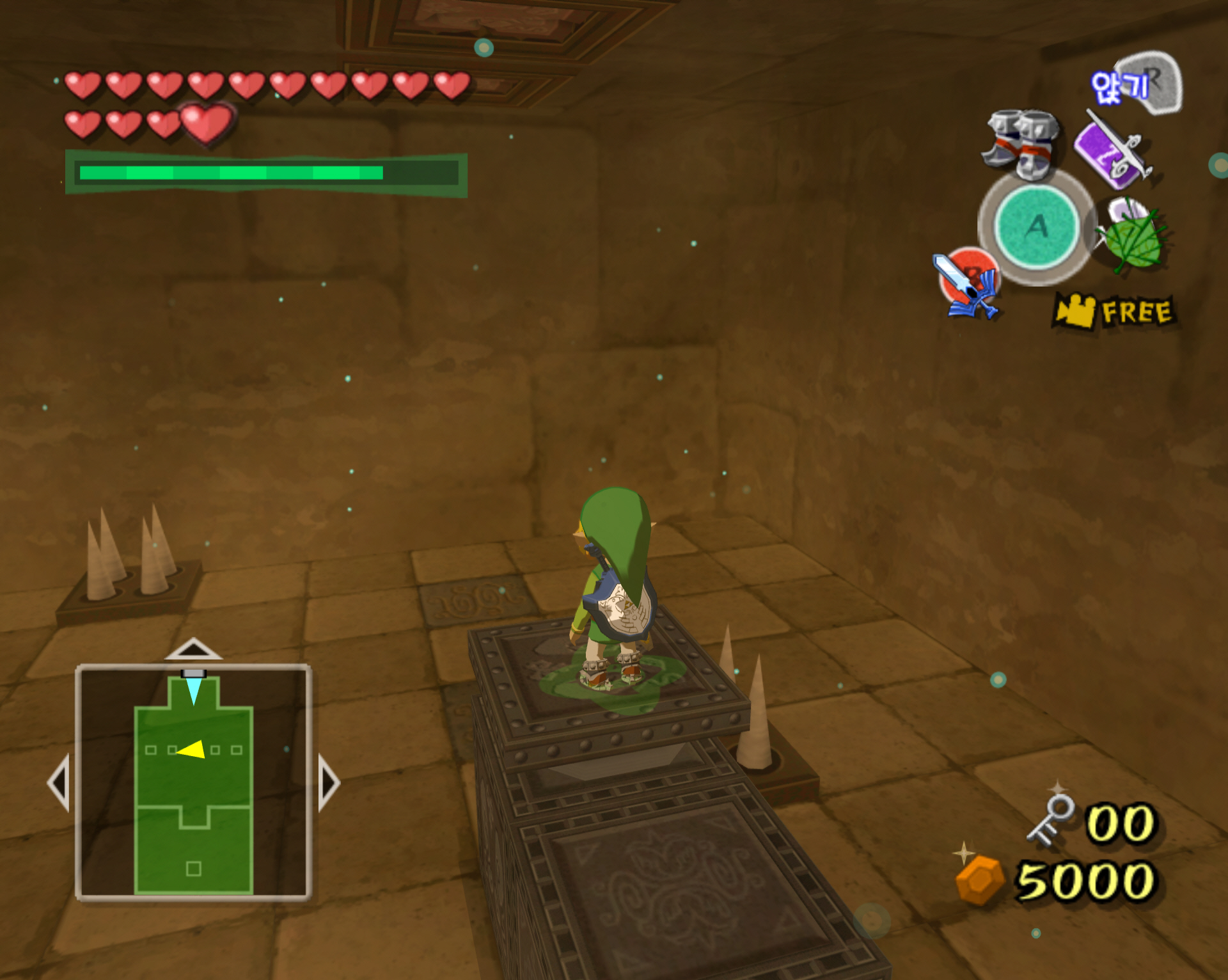 2. 적을 다 잡고 나면 마빡에 훅샷을 걸 수 있는 석상이 벽면에 붙어 있는데, 이것들을 헤비부츠 신고 훅샷으로 당기다 보면 숨어 있는 적 두 마리가 튀어나옵니다. 그 둘을 다 잡으면 바닥에 보물 상자가 나타납니다. 그 안에 보물 지도가 들어 있습니다. 그리고 맨 위에 있는 석상은 그 아래 보스 방으로 가는 문의 스위치가 있습니다. 스위치는 위에 올라가서 헤비부츠를 사용하면 되는데, 그곳까지 가려면 석상을 당기면 안 되고 (즉 헤비부츠 신지 말고) 훅샷으로 넘어가서 스위치부터 밟고 그 다음에 석상을 당겨서 숨겨진 적을 조지면 됩니다. 석상부터 당기셔서 훅샷을 걸어 넘어갈 수 없다면, 걱정 말고 테크잎으로 날아가셔도 됩니다.