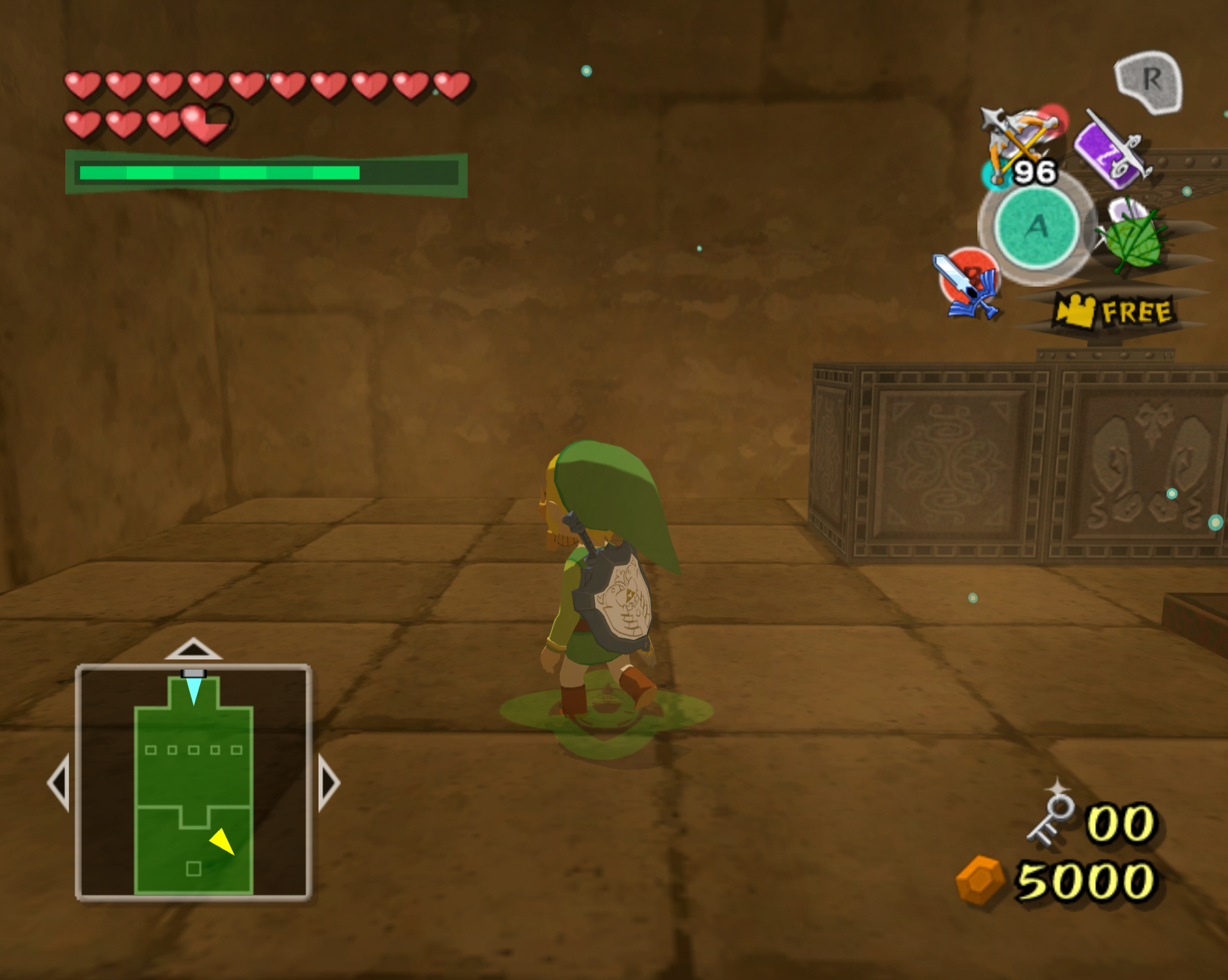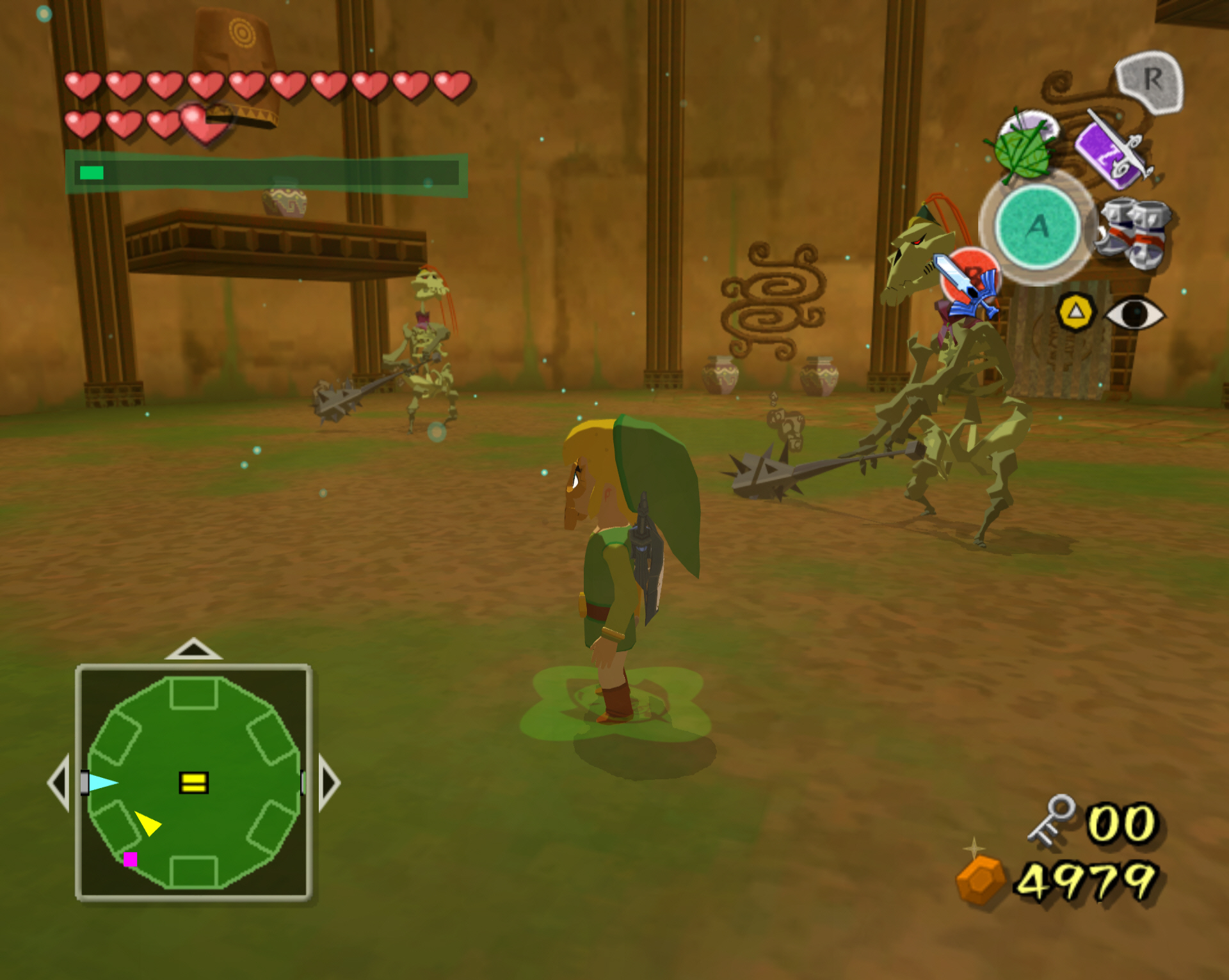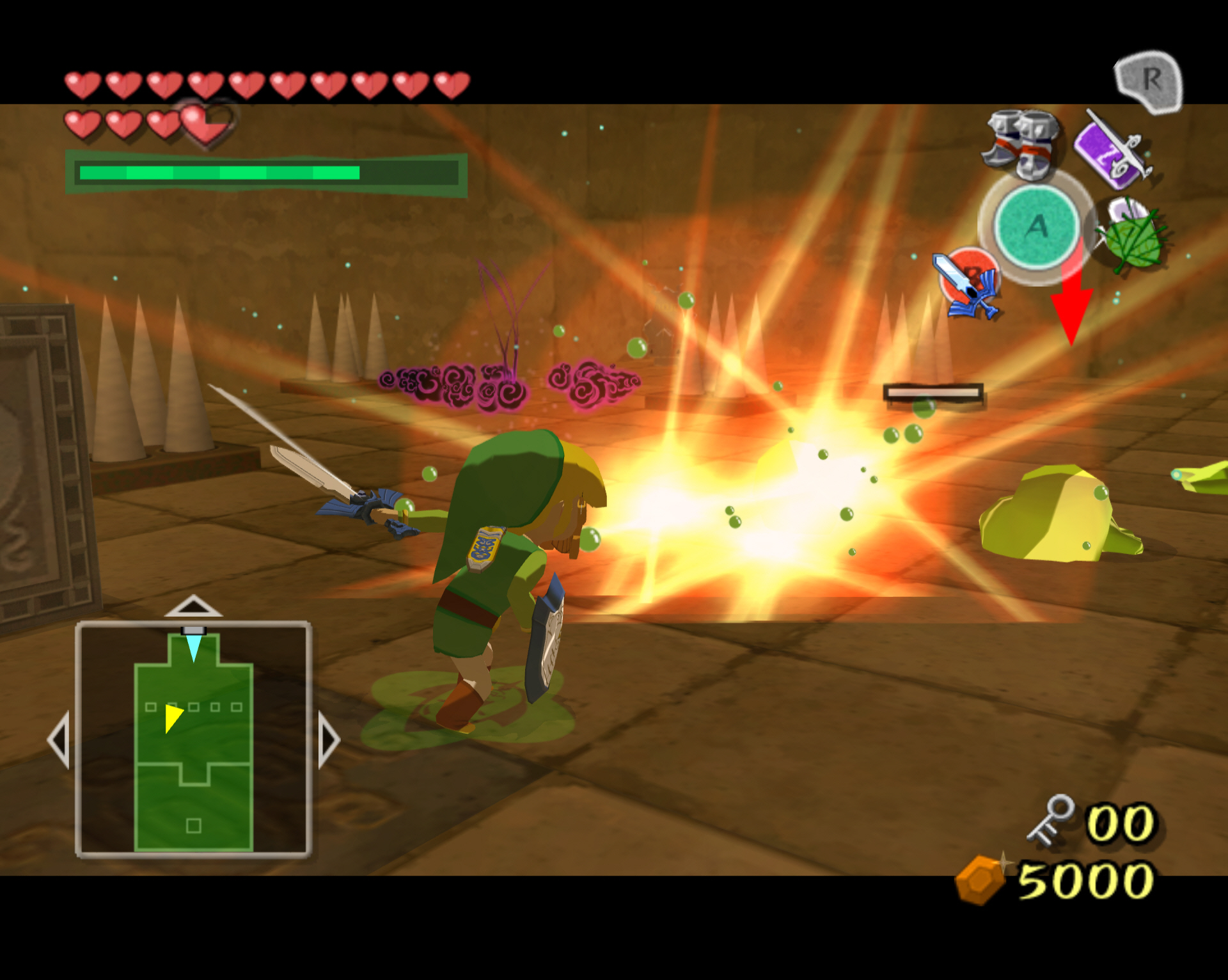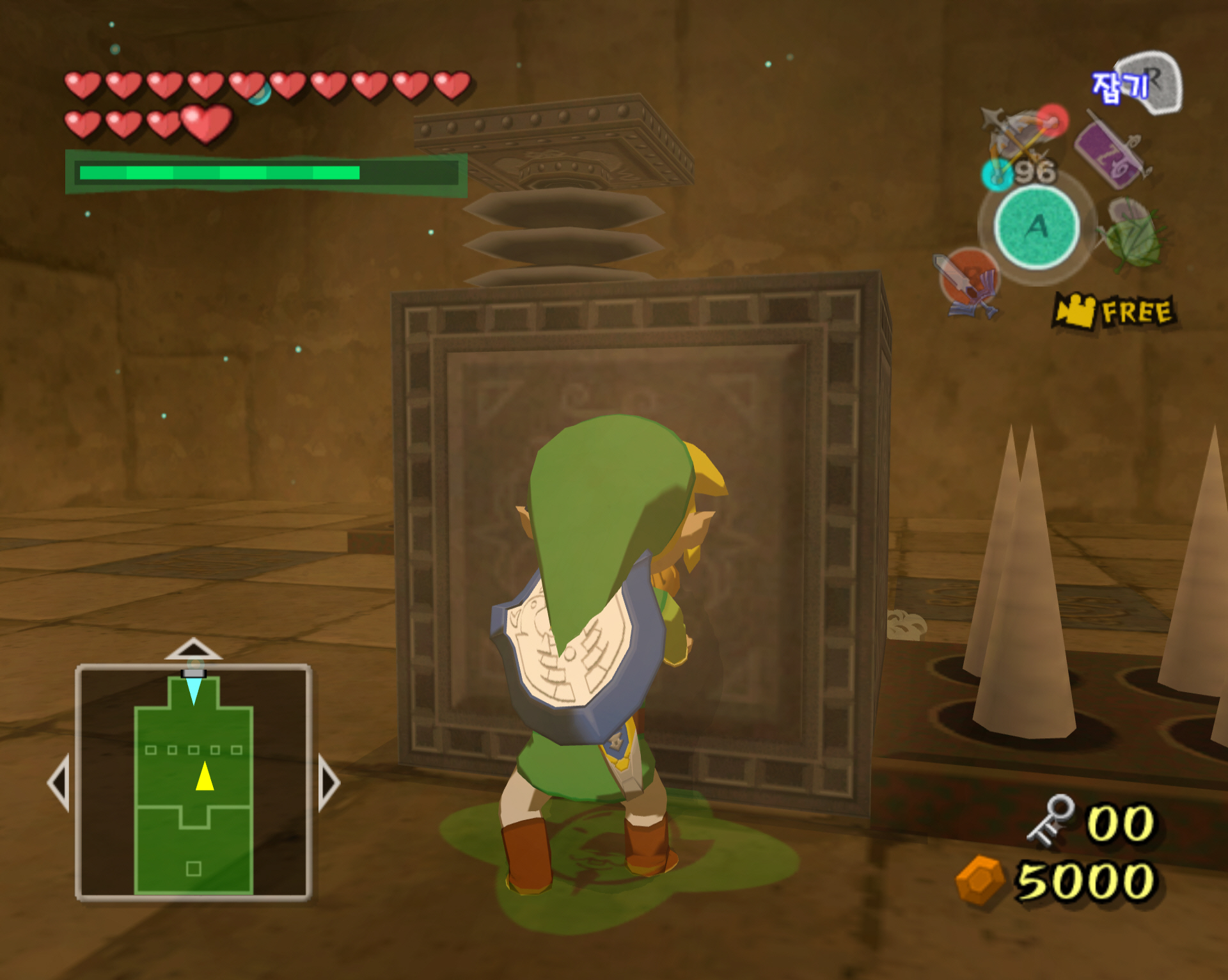 2. 적을 다 잡고 나면 마빡에 훅샷을 걸 수 있는 석상이 벽면에 붙어 있는데, 이것들을 헤비부츠 신고 훅샷으로 당기다 보면 숨어 있는 적 두 마리가 튀어나옵니다. 그 둘을 다 잡으면 바닥에 보물 상자가 나타납니다. 그 안에 보물 지도가 들어 있습니다. 그리고 맨 위에 있는 석상은 그 아래 보스 방으로 가는 문의 스위치가 있습니다. 스위치는 위에 올라가서 헤비부츠를 사용하면 되는데, 그곳까지 가려면 석상을 당기면 안 되고 (즉 헤비부츠 신지 말고) 훅샷으로 넘어가서 스위치부터 밟고 그 다음에 석상을 당겨서 숨겨진 적을 조지면 됩니다. 석상부터 당기셔서 훅샷을 걸어 넘어갈 수 없다면, 걱정 말고 테크잎으로 날아가셔도 됩니다.