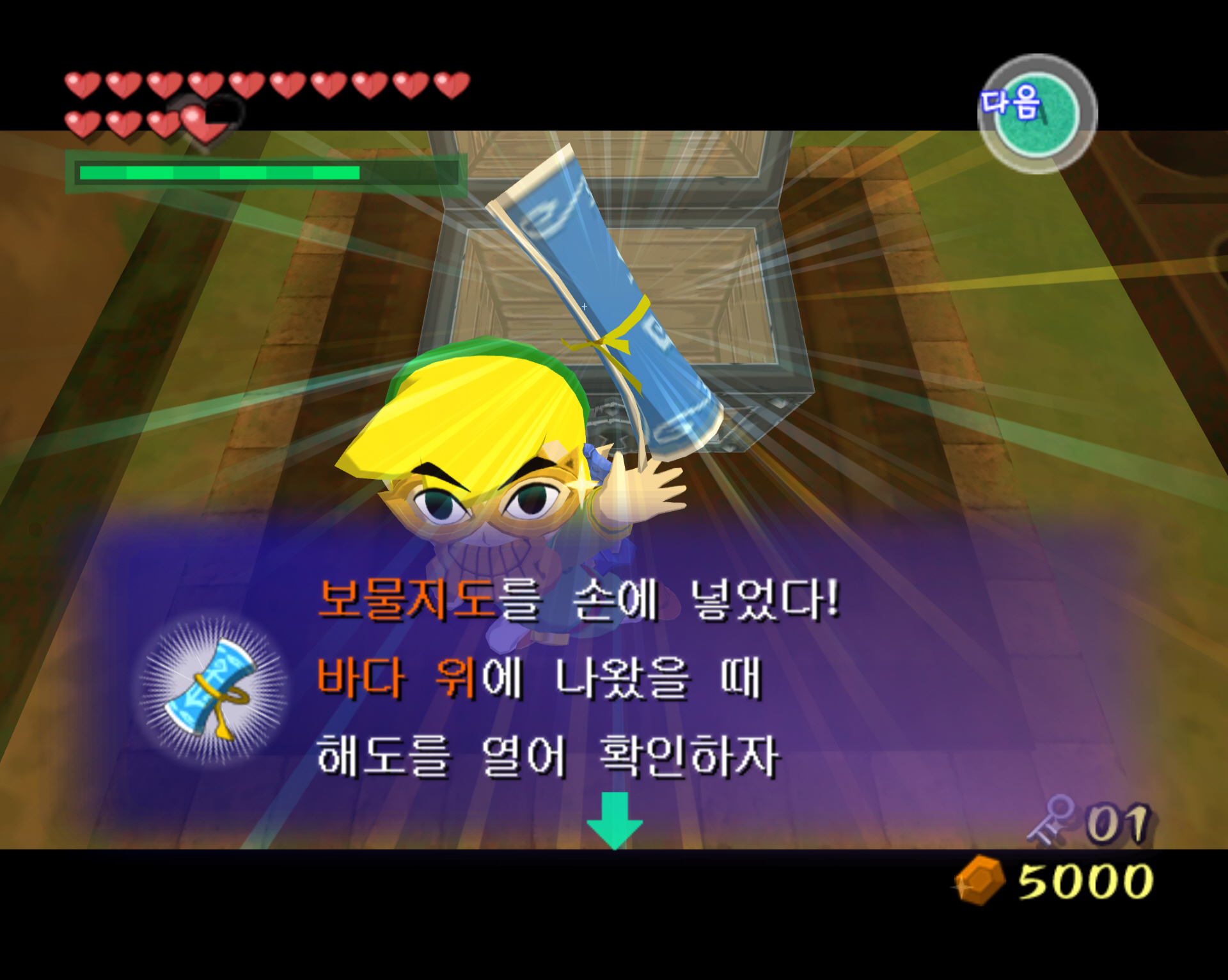바람의 신전 공략 중 첫 번째 열쇠를 얻어야 하는 진행 과정에 첫 번째 보물지도를 같이 얻을 수 있습니다. 보물 상자 등장 장소가 딱 열쇠를 얻는 곳에 존재하지요.