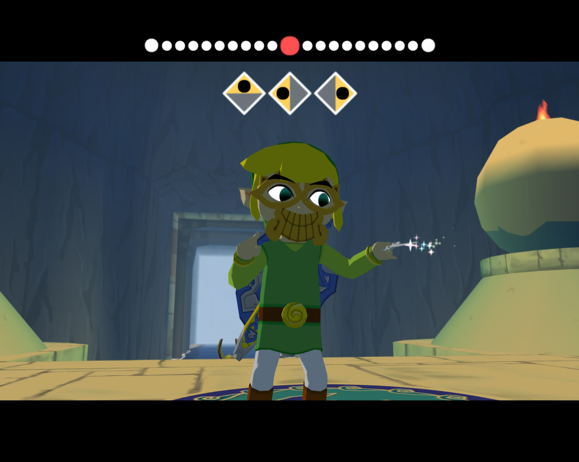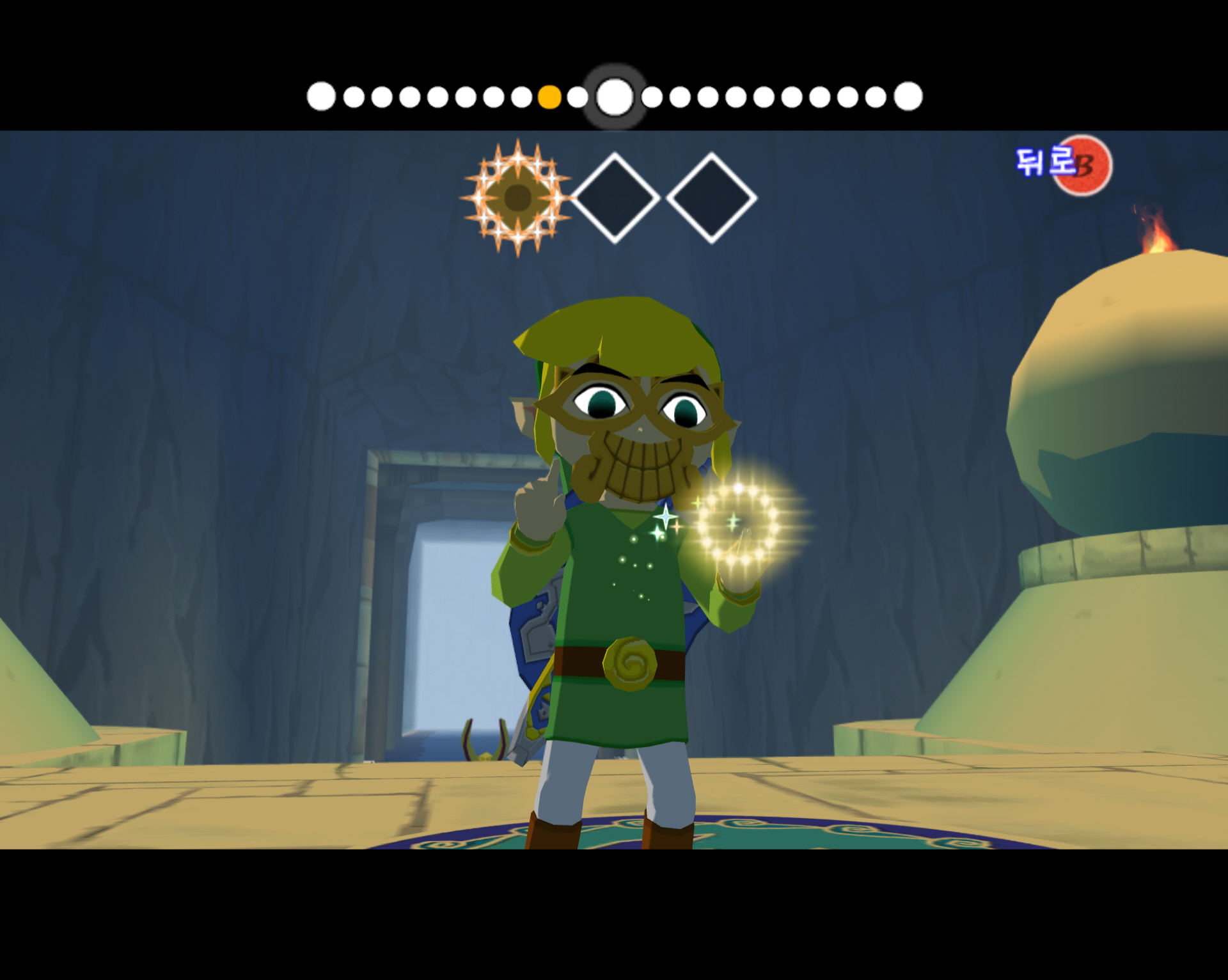 그 다음 입구로 들어가면 제단이 보이는데, 제단에는 바람개비 형상의 타일이 있습니다. 거기서 바람의 노래를 지휘하면 숨겨진 보물 상자가 나오고 그 안에 트라이포스 지도 1번이 있습니다.