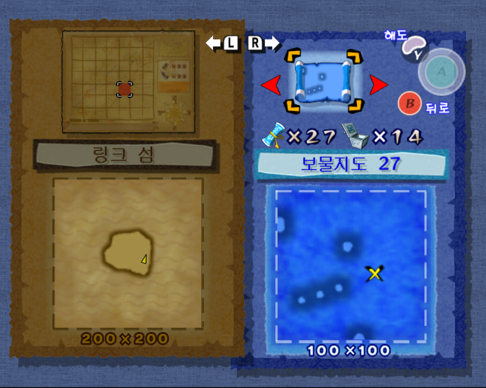 보물지도 27번은 아무개섬에 위치합니다. 트라이포스 지도 2번을 먼저 획득했다면, 이 섬의 이름은 여러분이 게임 시작 시 설정한 링크의 이름으로 변경되어 있을 겁니다. 어쨌거나 아무개섬의 위치는 전체 해도에서 E5에 위치합니다.