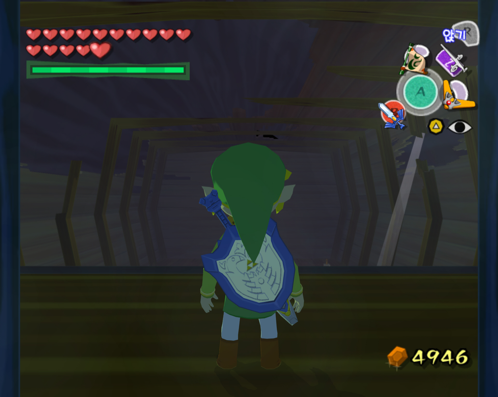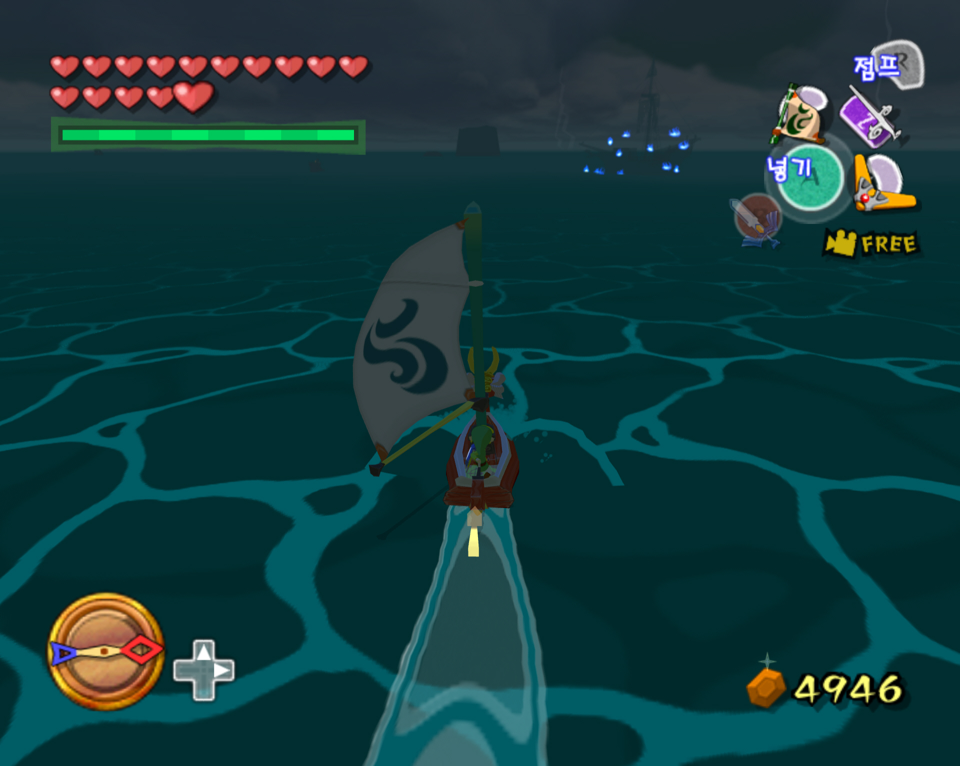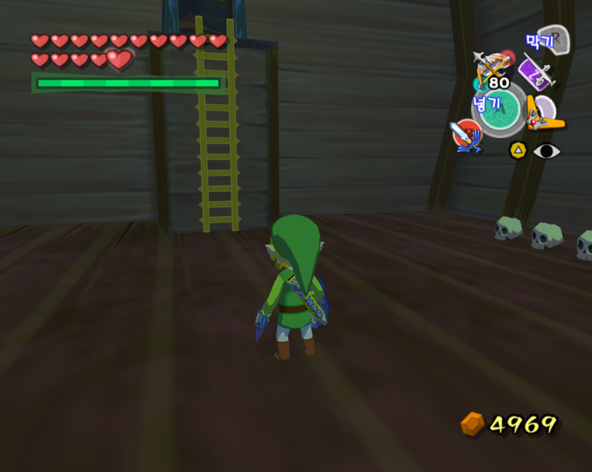 이 정도 진행했으면 하트가 많아서 몸빵으로 버티며 잡아도 충분합니다. 보물상자에서 트라이포스 인양 지도를 얻으면 자동으로 유령선에서 튕겨져 나가니 항아리나 해골에서 루피를 얻을 분들은 미리미리 먹고 상자를 열도록 합니다.