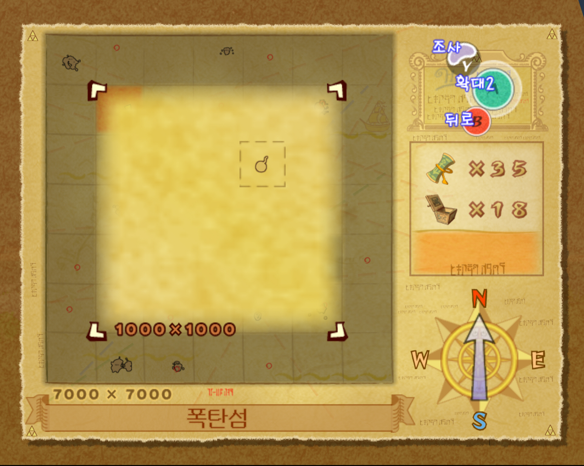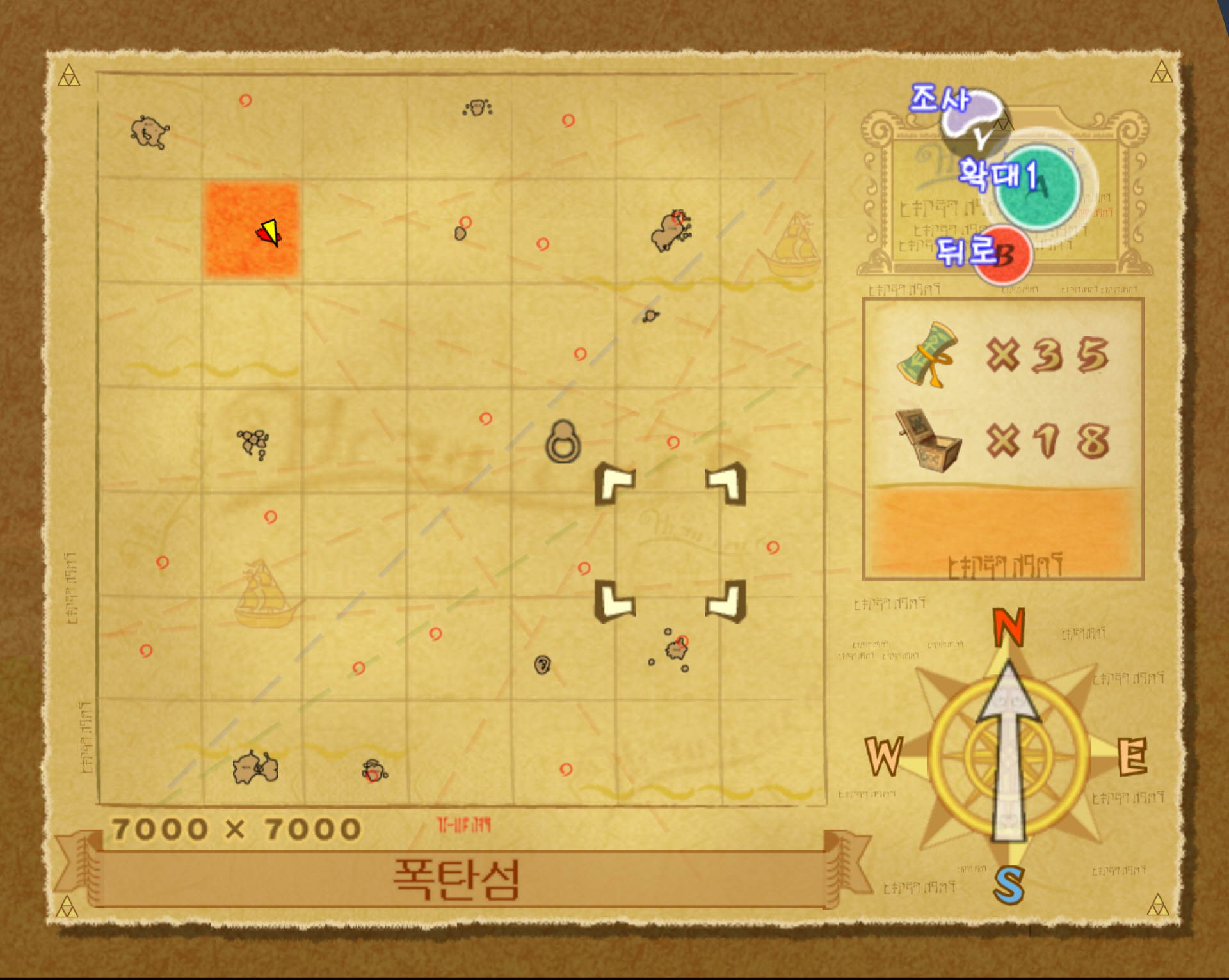 4-1. 폭탄섬은 해도상 좌표 F5입니다. 바로 아래 F7 숲의 섬으로 워프 할 수 있으니 그곳으로 가서 항해로 올라갑니다.
