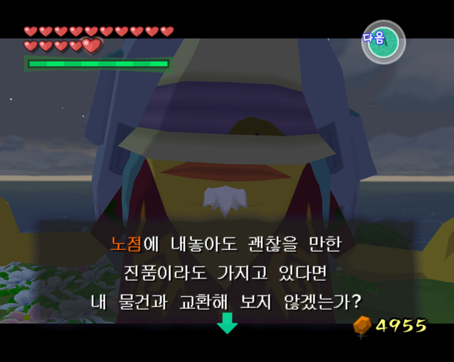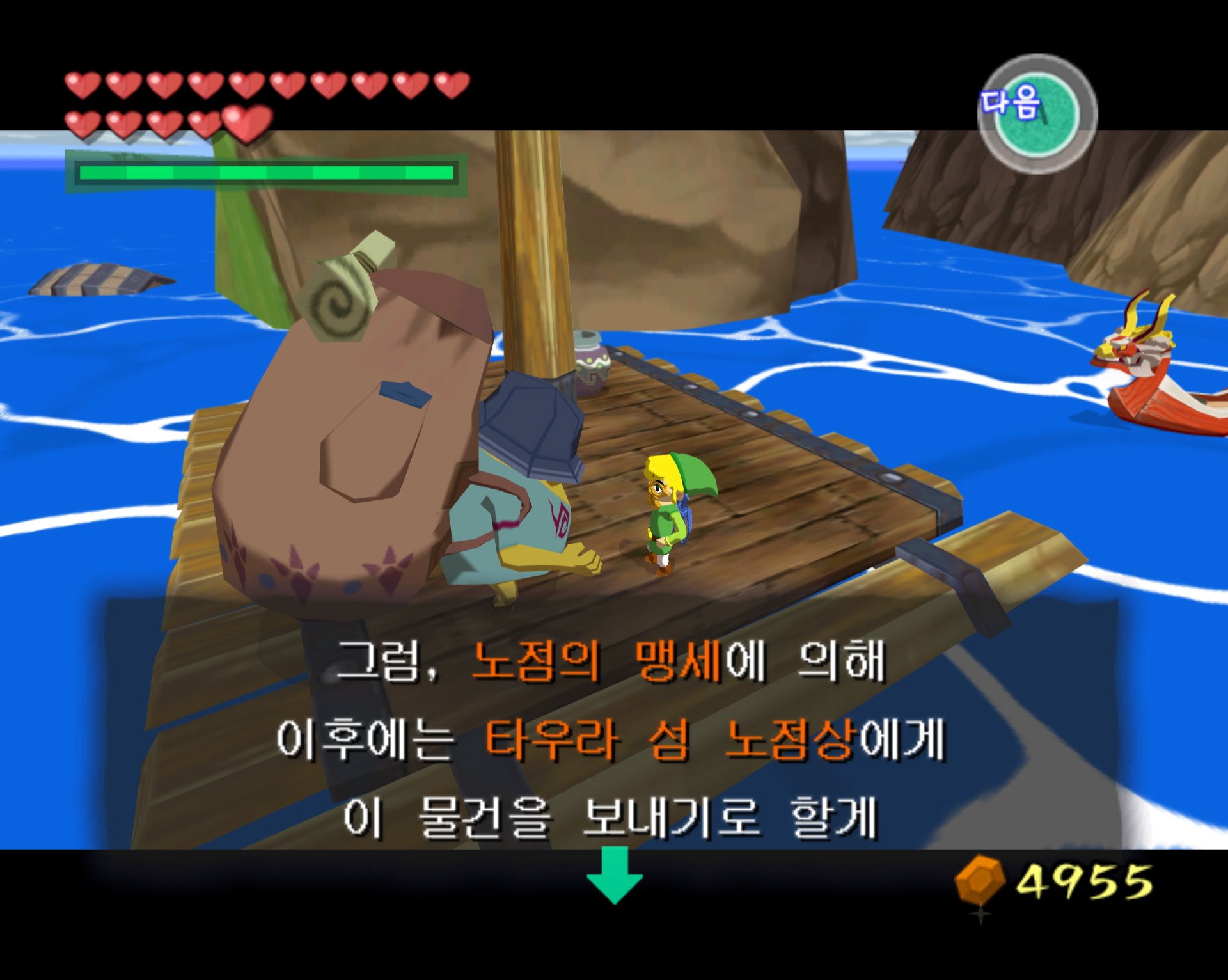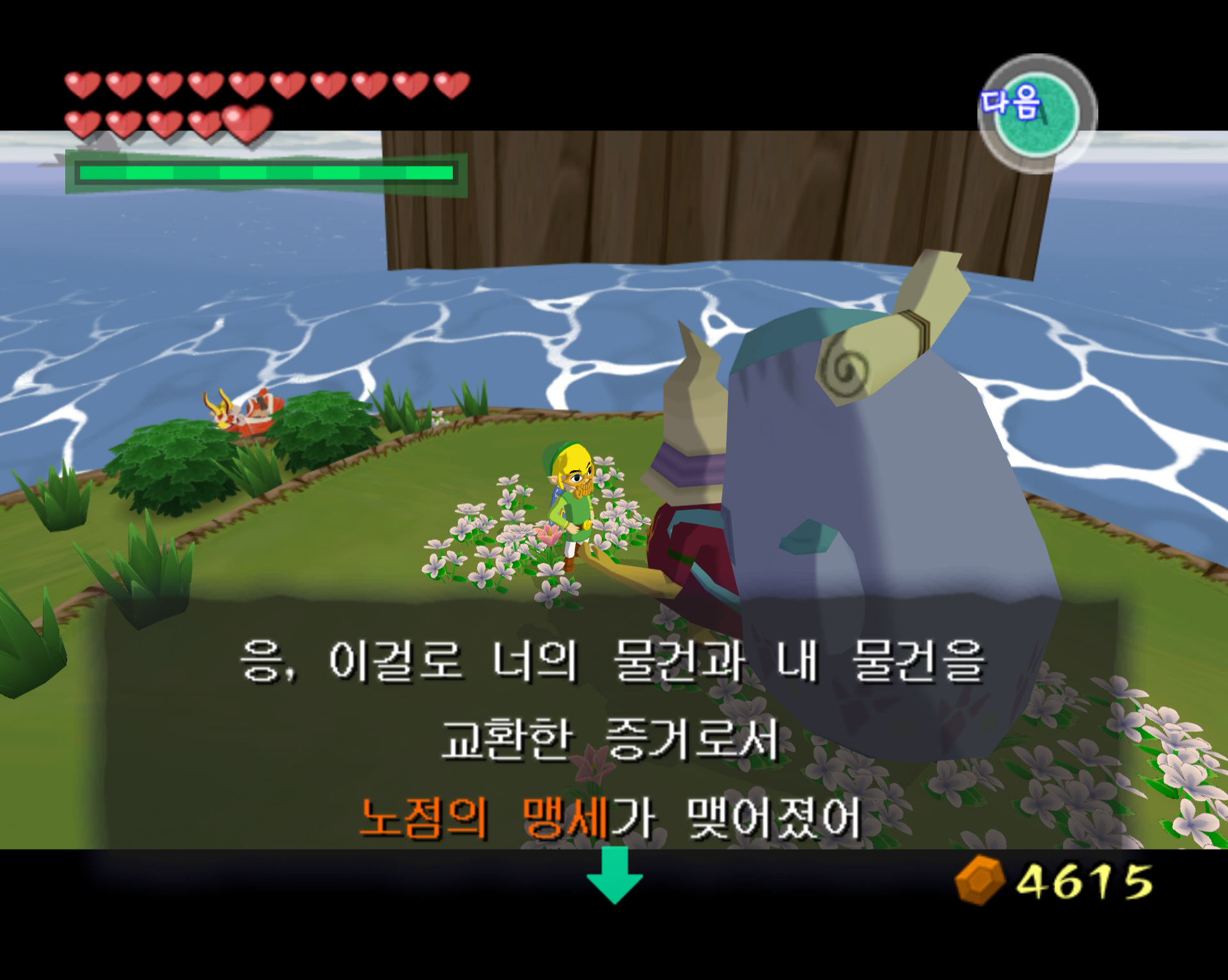 2-2. 물고기 섬에 가면 아래 스샷처럼 뗏목이 보입니다. 뗏목에 올라와 큰 배낭을 멘 "여행의 노점상"을 만나 말을 겁니다. 그리고 타우라 섬에서 구매해 온 "마을의 꽃"을 사용하면 "바다의 꽃"으로 교환할 수 있습니다. 그리고 다시 "바다의 꽃"을 사용하면 "남풍의 꽃"을 받을 수 있습니다. 교환에는 수수료를 지급해야 합니다. 그 이후에는 부자도로 이동합니다.