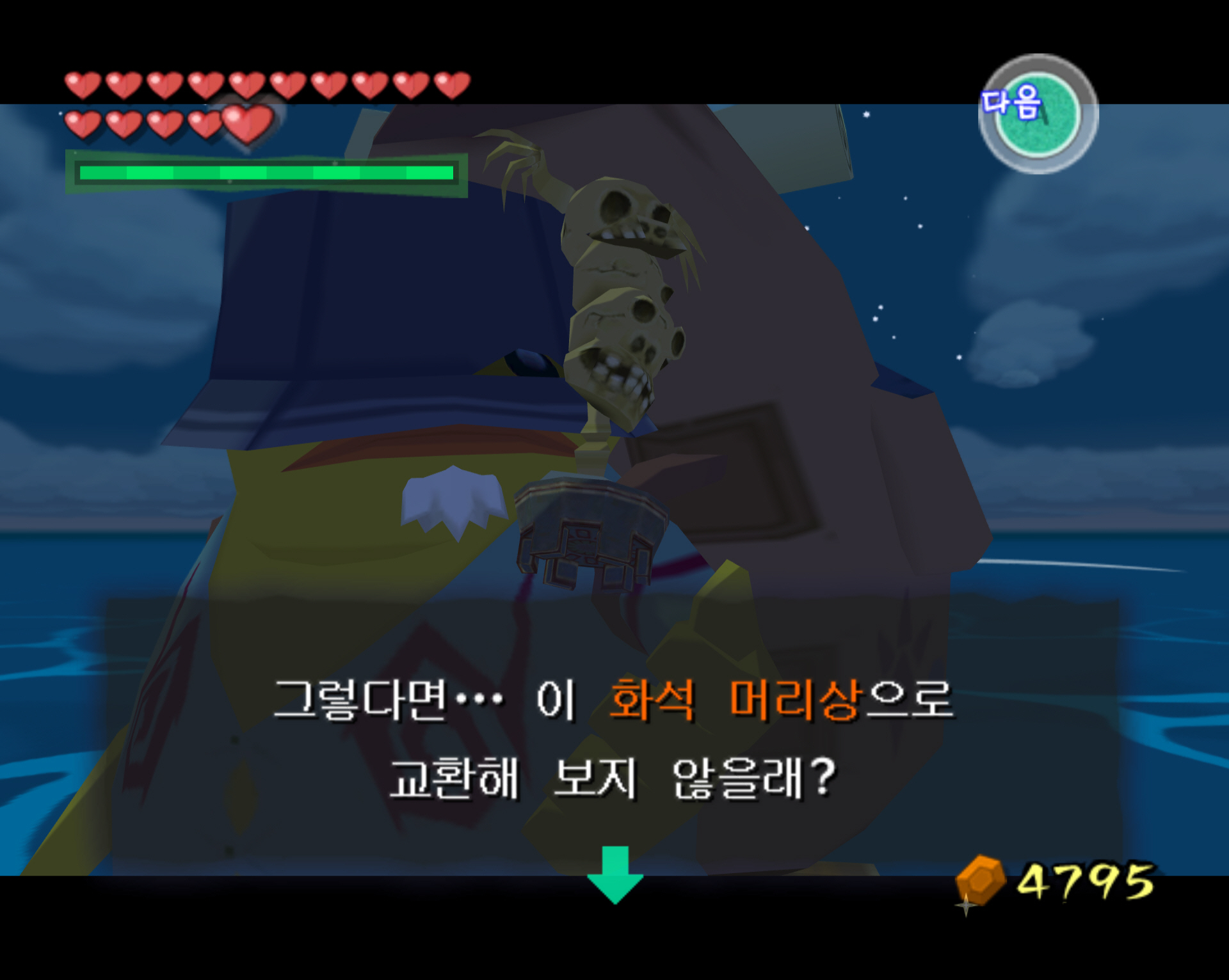 5. 다시 물고기 섬으로 이동해서 이곳의 여행의 노점상에게 말을 겁니다. 그리고 폭탄섬에서 교환해 온 "항아리의 분수상"을 사용하면 "화석 머리상"을 교환할 수 있습니다. 이 것을 가지고 다시 부자도로 갑니다.