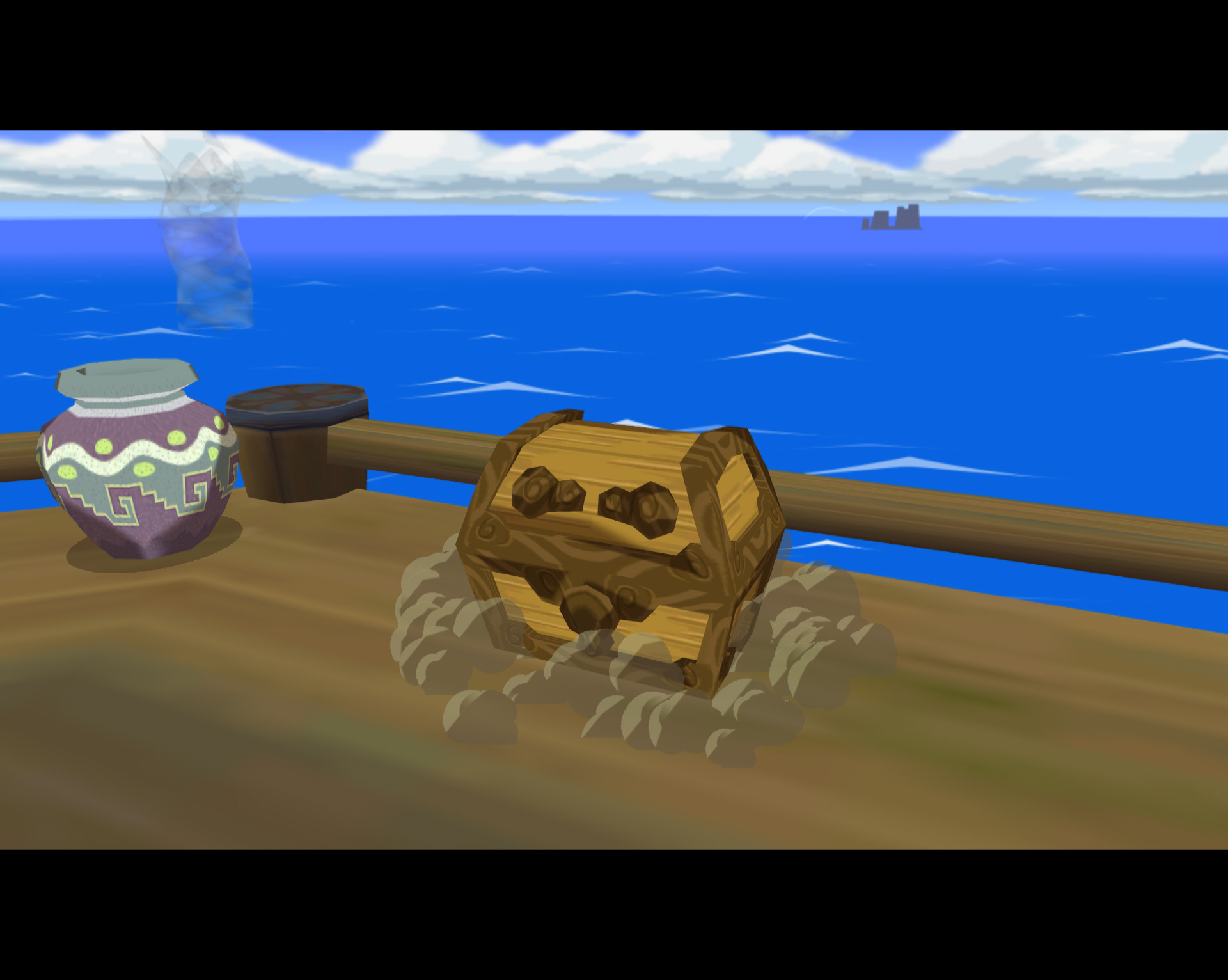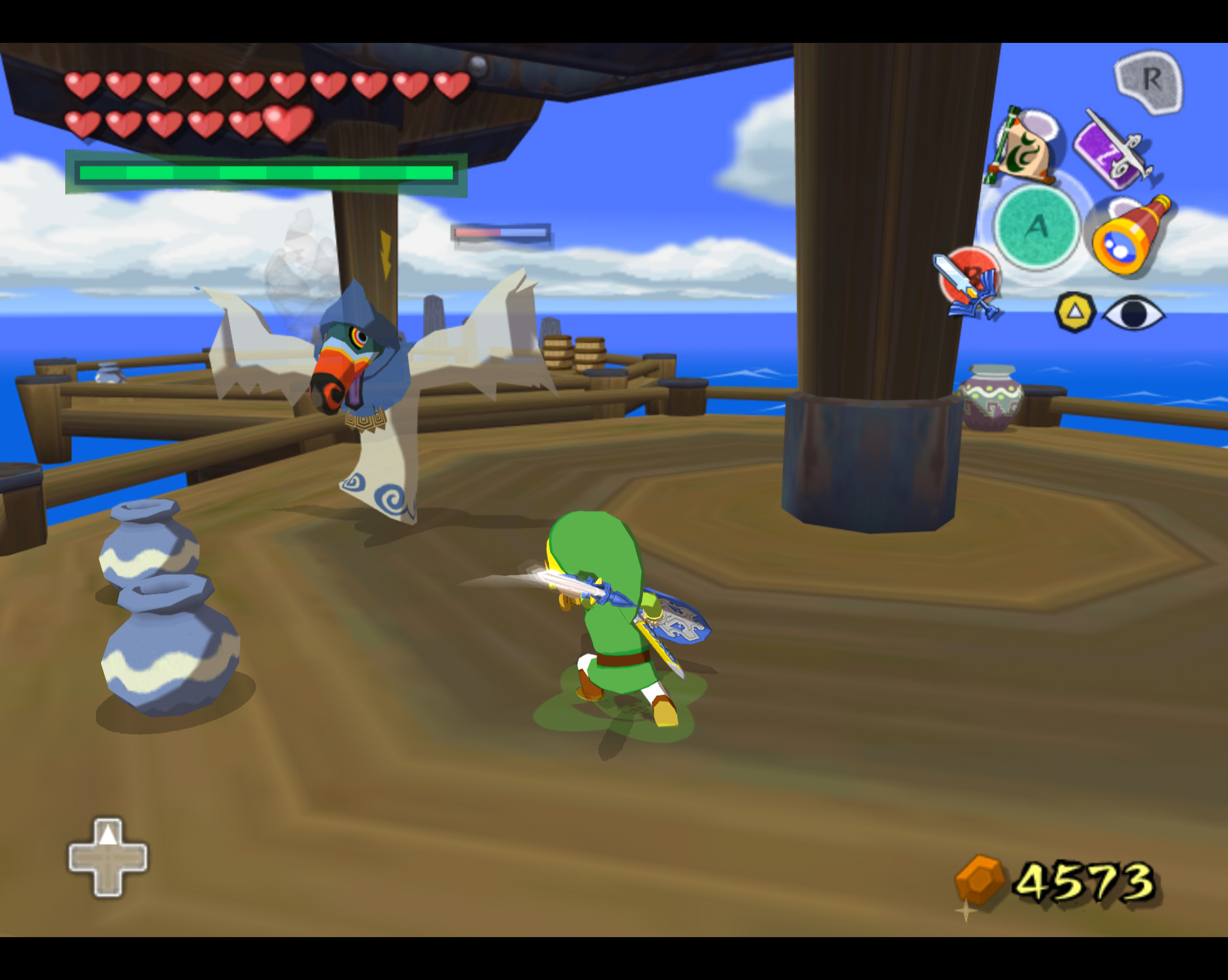 망루에 도착하면 중앙 망루의 사다리를 통해 올라갑니다. 그럼 불을 날리는 마법사가 등장하는데 한 마리 죽일 때마다 보물 상자가 하나씩 나타납니다. 리고 적지막에는 두 마리가 나옵니다. 총 3개의 망루에 각기 1개씩 3개의 보물 상자가 나타나며 보상은 20루피, 황금 깃털, 보코바바의 씨입니다. 영문판은 여기서 보물 지도가 하나 나온다더군요.