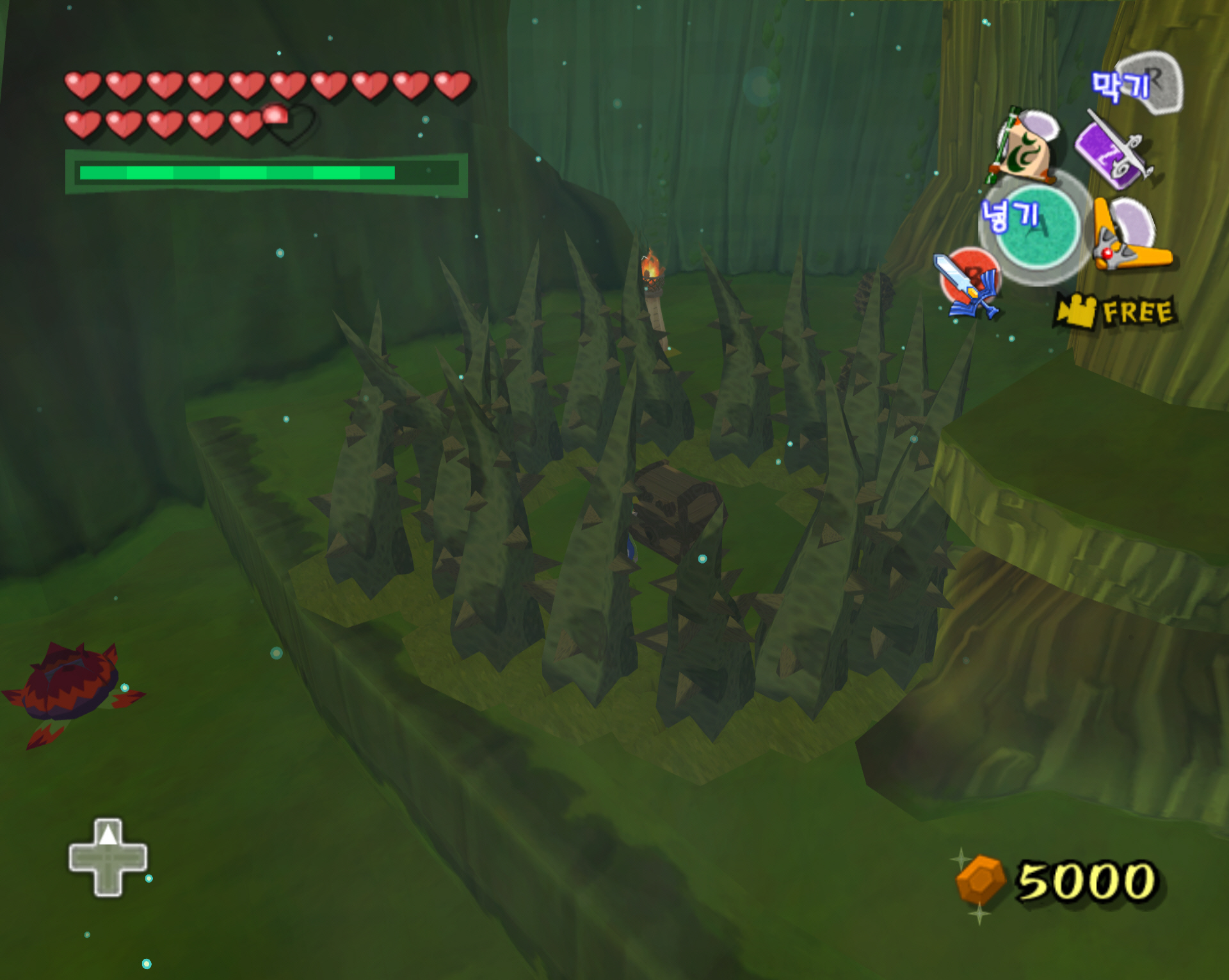 그러면 보물상자가 보이는데 보물 상자로 조심해서 잘 떨어집니다. 그러면 촉수 식물들이 보물상자 주위를 둘러쌓습니다.