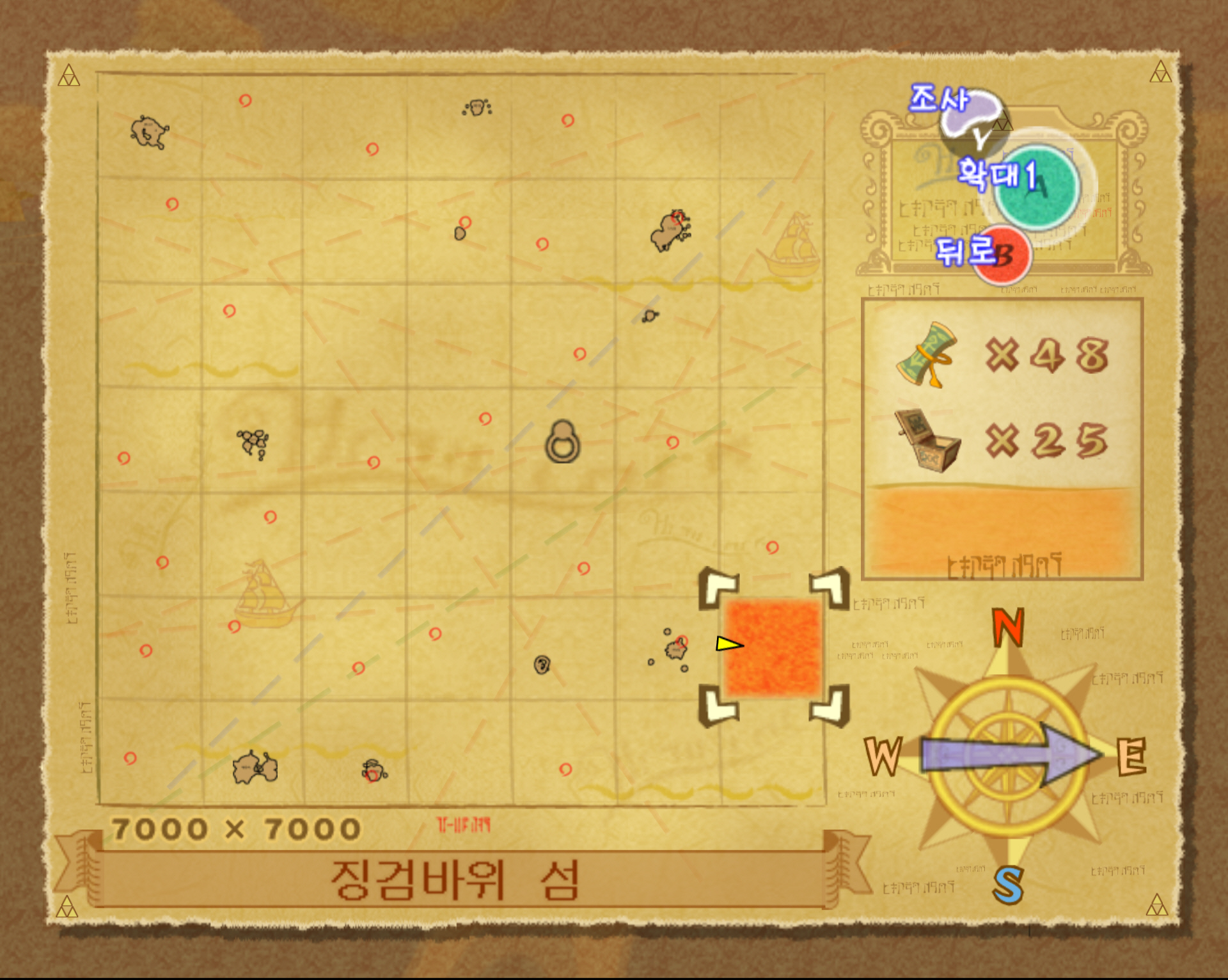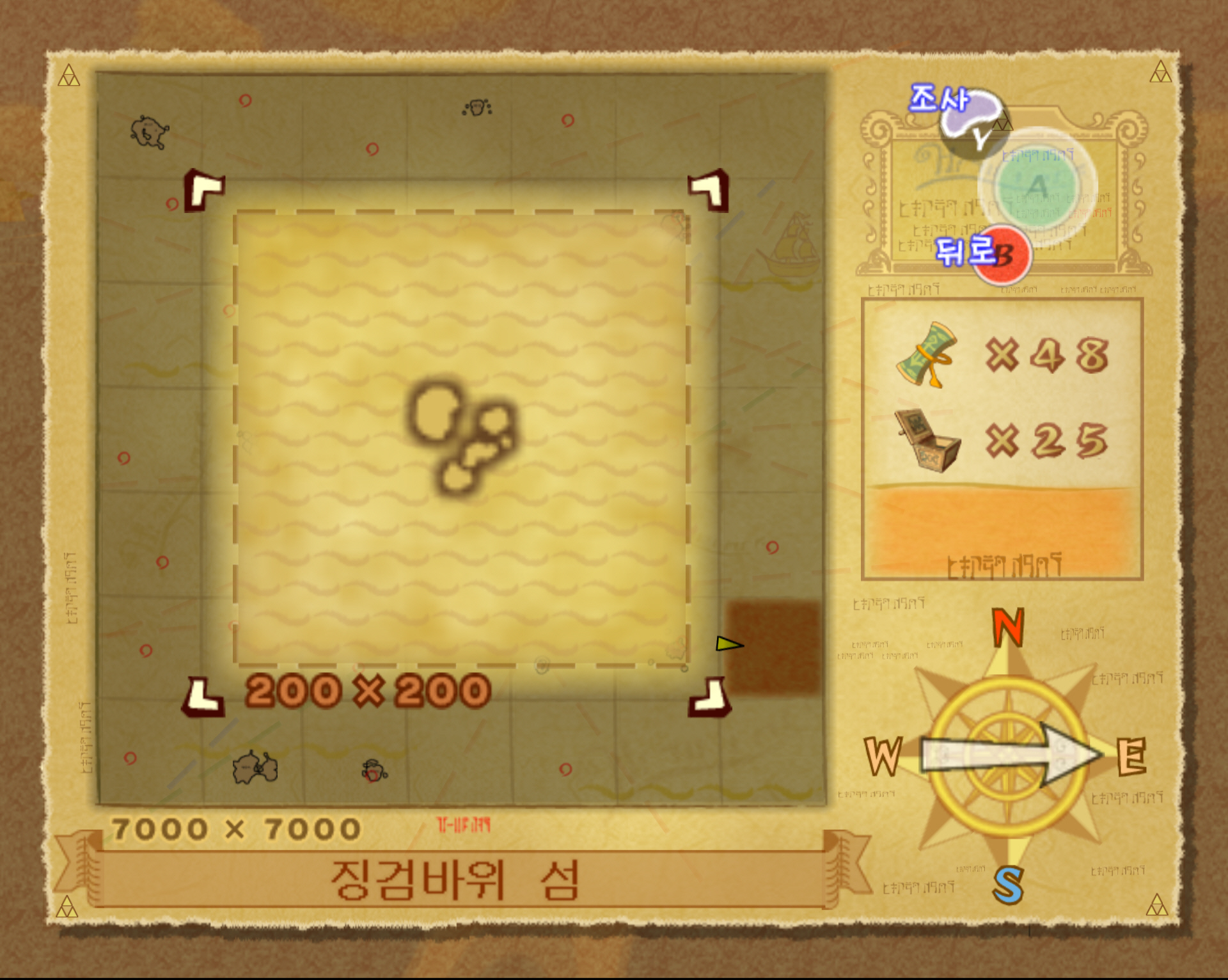 징검바위 섬 정상에 보물 상자가 있고 여기여 보물지도 25번이 들어 있습니다. 징검바위 섬 전체 해도 좌표는 G6입니다.
