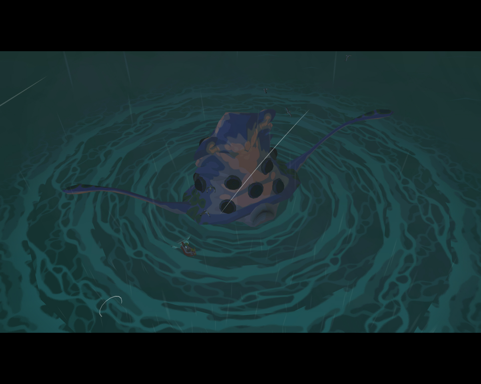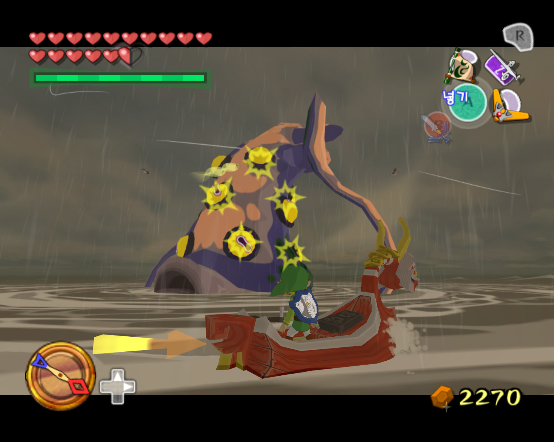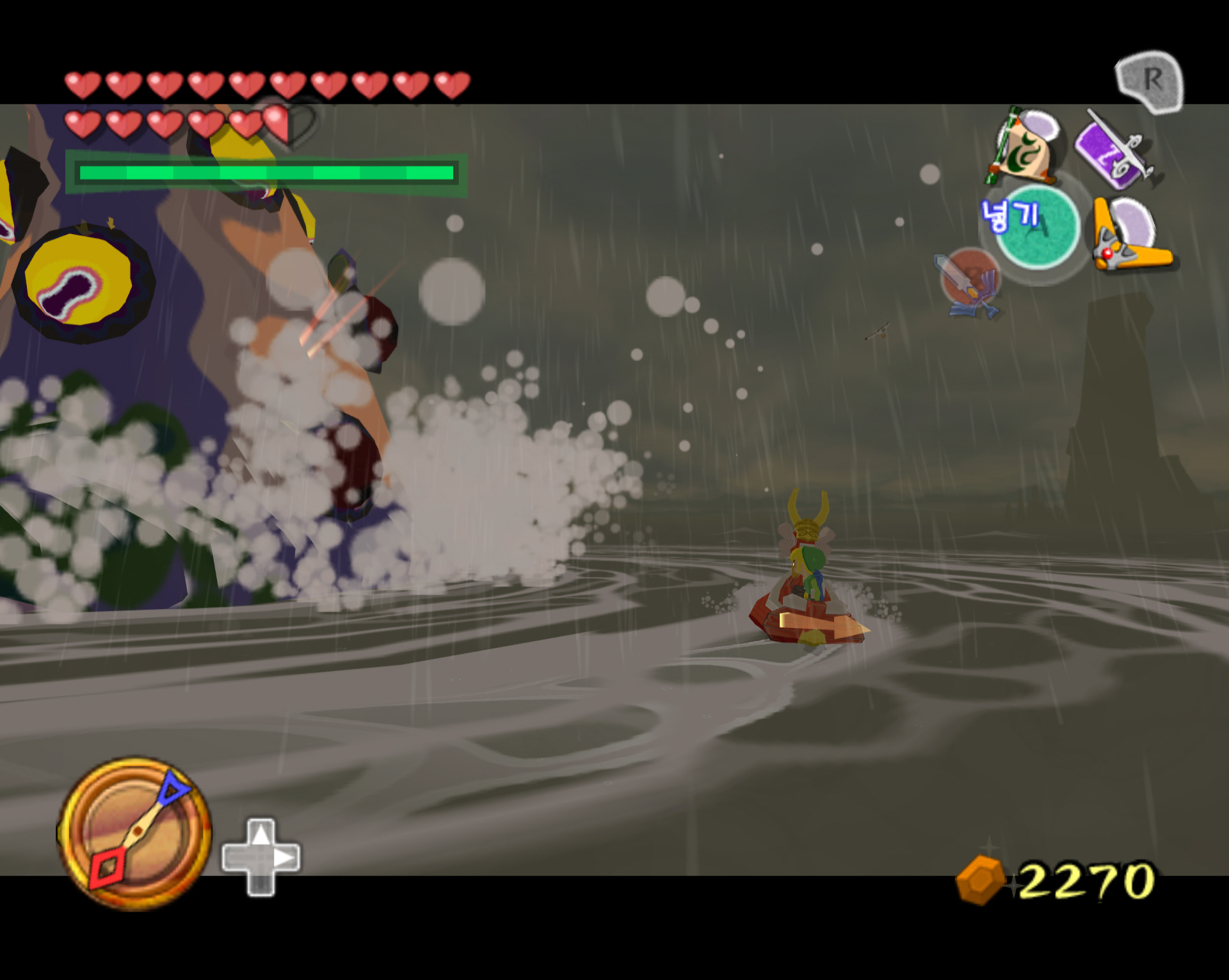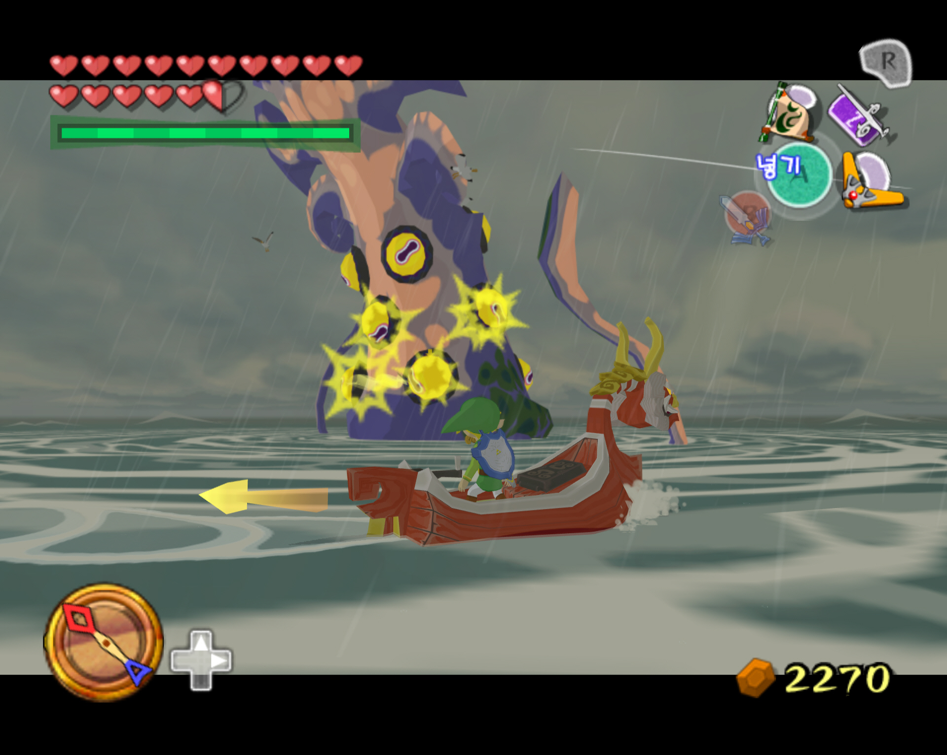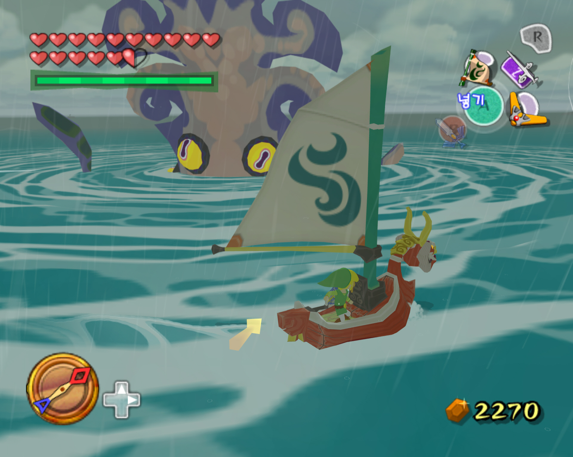오징어가 등장하면 부메랑으로 눈깔들을 맞춰주면 됩니다. 조작을 좀 빨리해야 하는데 링크가 탄 배는 오징어 주위를 빙빙 돌면서 최종적으로는 오징어에게 빨려 들어갑니다. 그러면 공략 실패. 재도전해야 합니다. 오징어를 격퇴하면 빛무리가 등장하고 거기서 인양을 하면 하트의 조각이 들어 있는 보물 상자가 딸려 올라옵니다.