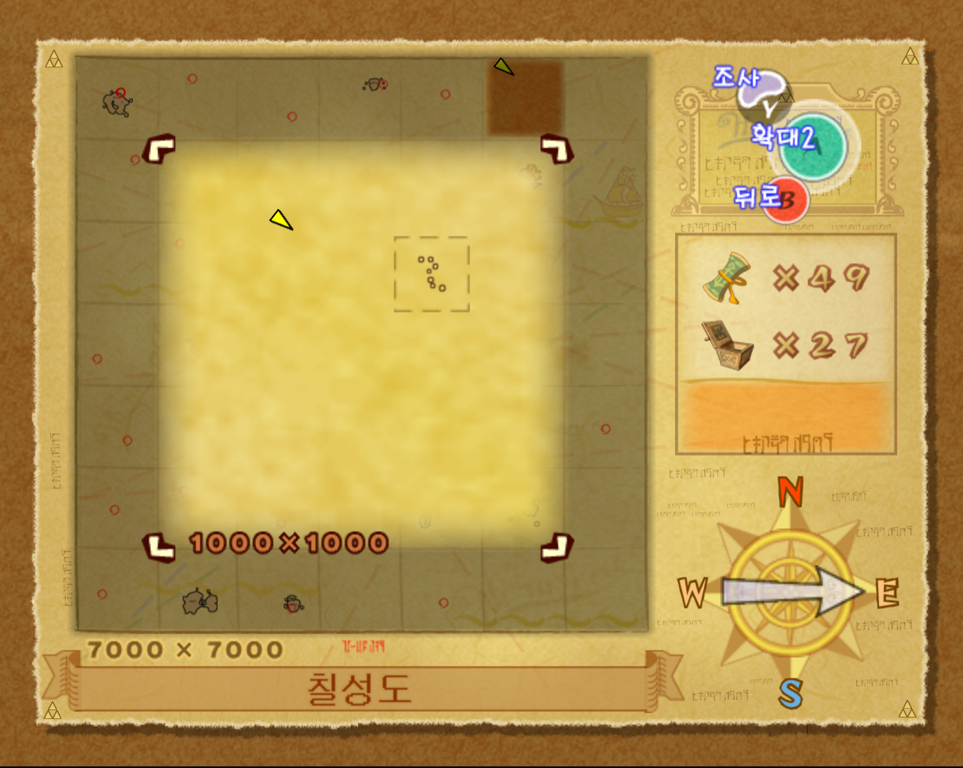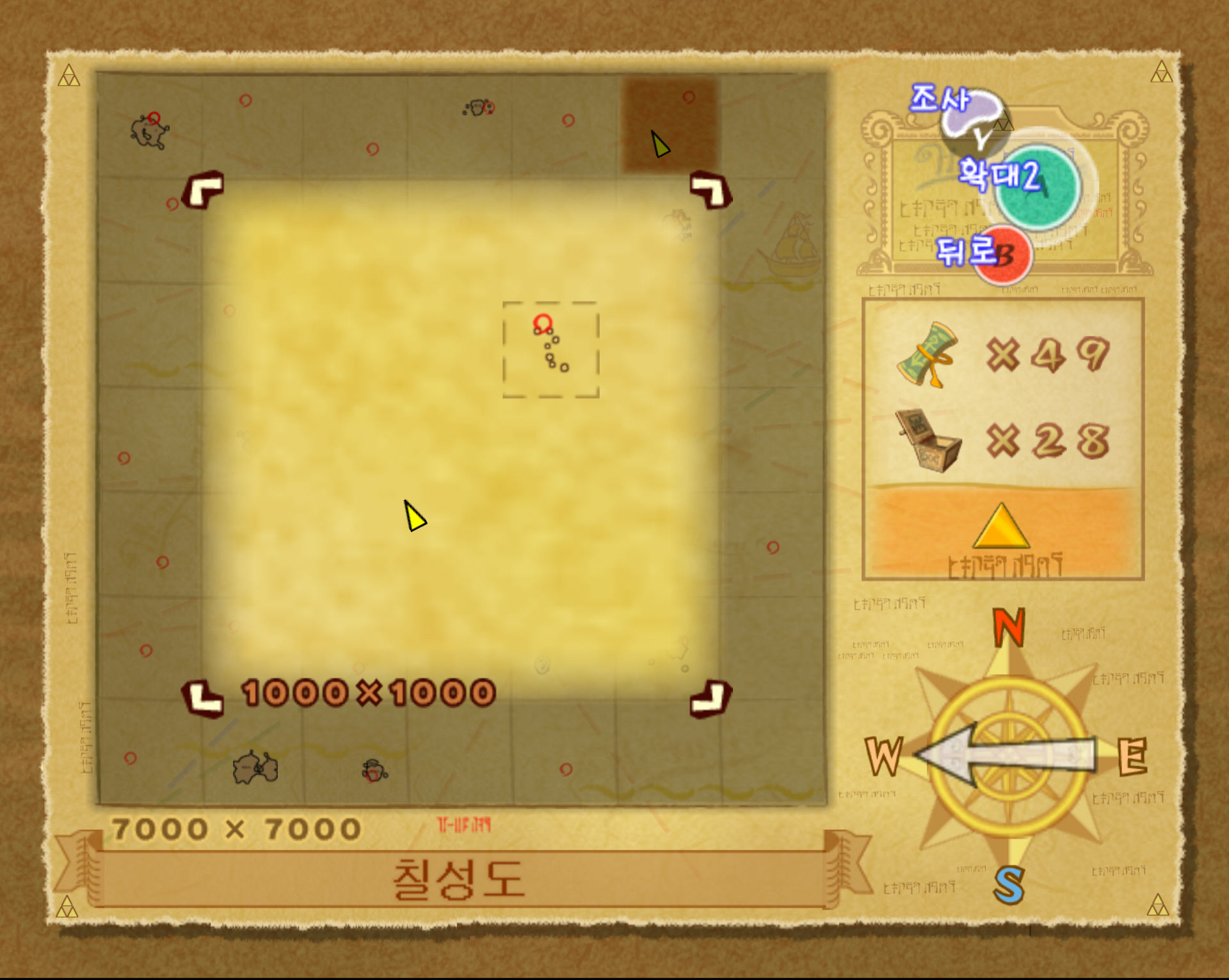 칠성도 주변에 갈매기가 많이 모여 있는 곳으로 가면 대왕 오징어가 등장합니다. 찾아가기 애매하면 다음 해도를 참조하세요. 노란 삼각형은 링크가 탄 배의 위치를 나타내는데 저 위치에서 대왕 오징어가 등장합니다. 해당 위치에 도착하면 갈매기들이 날아다는 것을 확인할 수 있습니다.