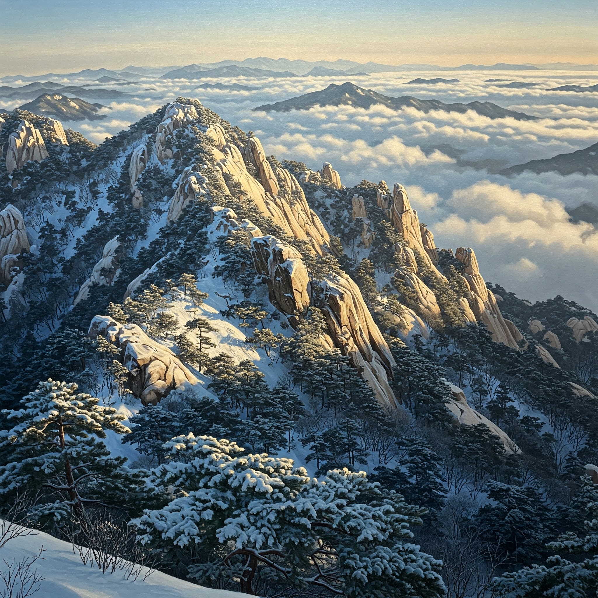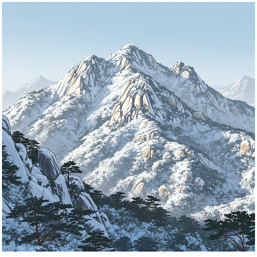 AI 가 그려준 눈 내린 북한산... 그냥 채팅창에 "눈 내린 북한산" 그려줘라고 쳤는데 이렇게 이미지가 생성됨. 왼쪽 아래 해가 들지 않아서 그늘진 부분까지 완벽하게 그려진 모습에 혀를 내둘렀음.