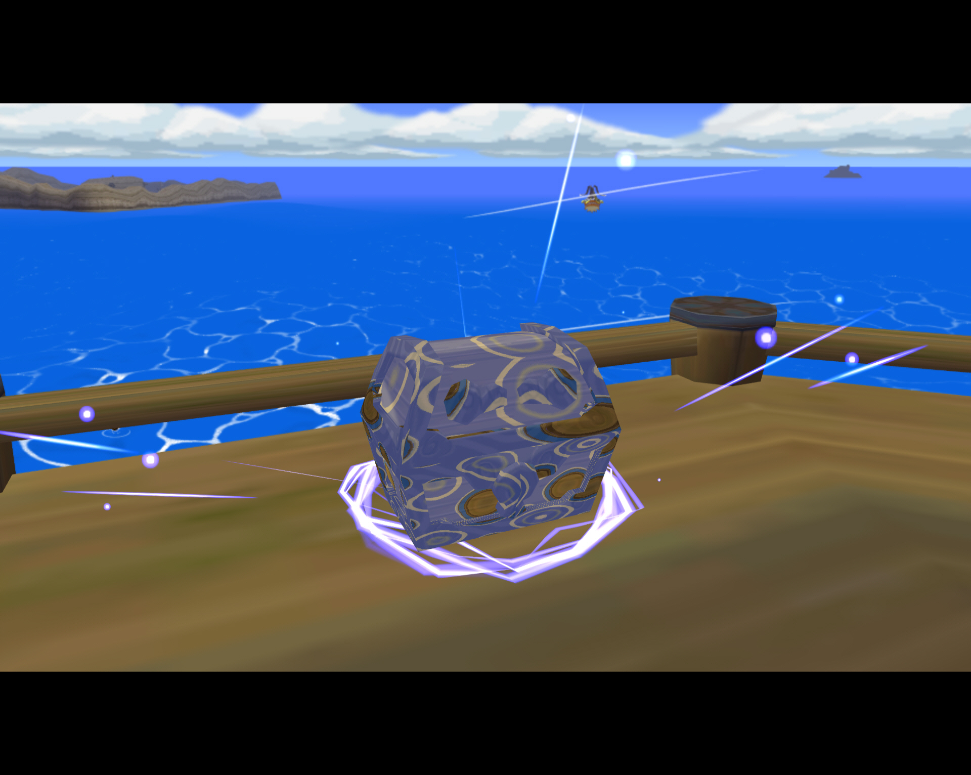 외눈섬에서 서북쪽에 망루가 1개 있습니다. 포탑이 달려 있고 주위에는 복어 닮은 적들이 날아다니고 있으니 부메랑으로 조져서 안전을 확보하고 망루의 포탑들을 제거합니다. 보물상자는 망루 위에 올라 분홍 고블린들까지 제거해야 나타납니다.