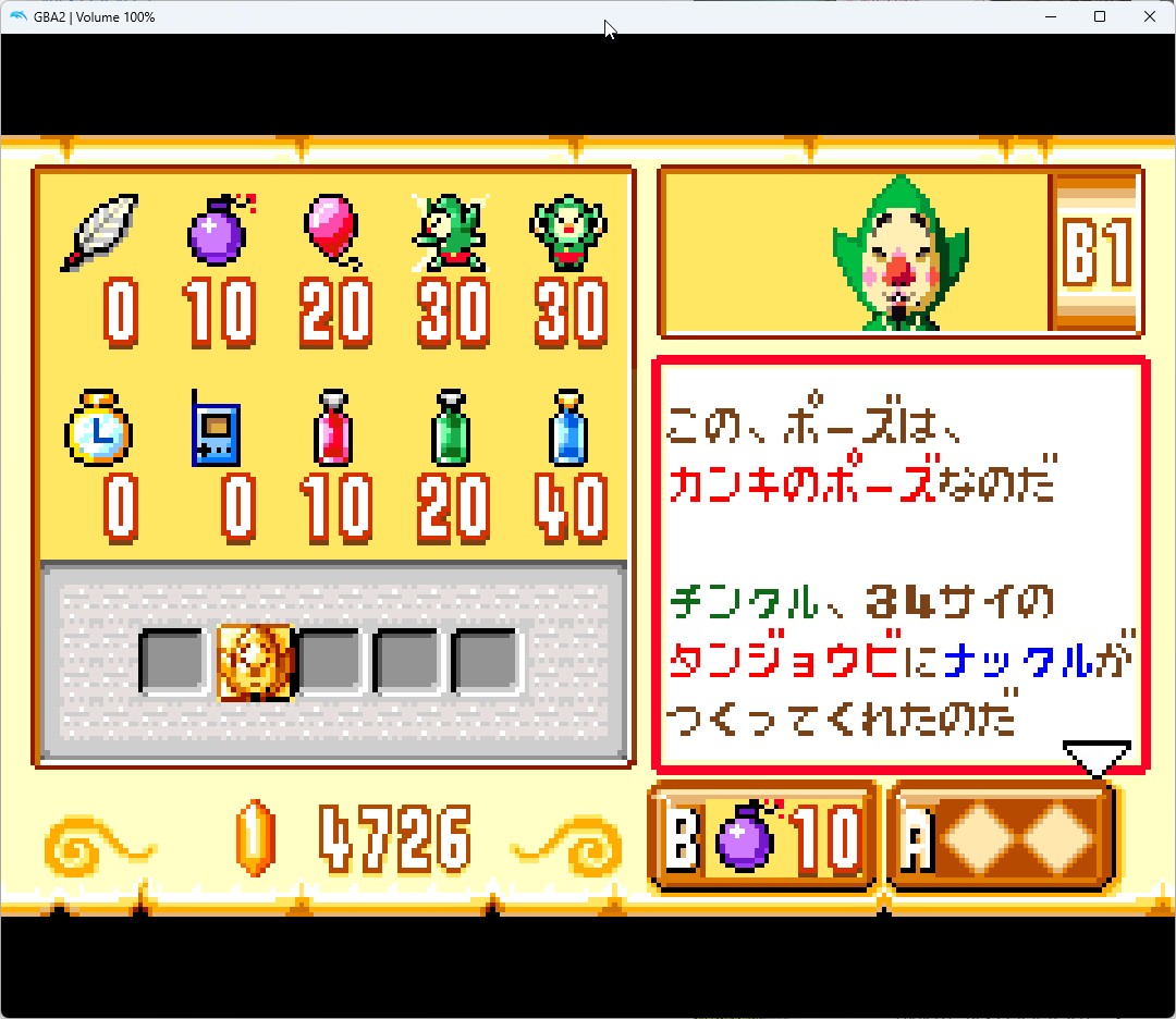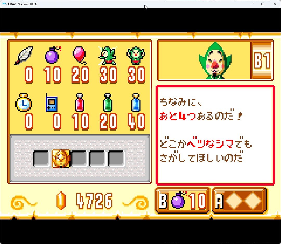 1-7. GBA쪽 화면에서 보물상자로 표시된 곳에 팅클 커서를 움직이고 루피를 지불하고 팅클의 폭탄을 터트려 주면 보물상자가 게임 화면에 등장합니다.