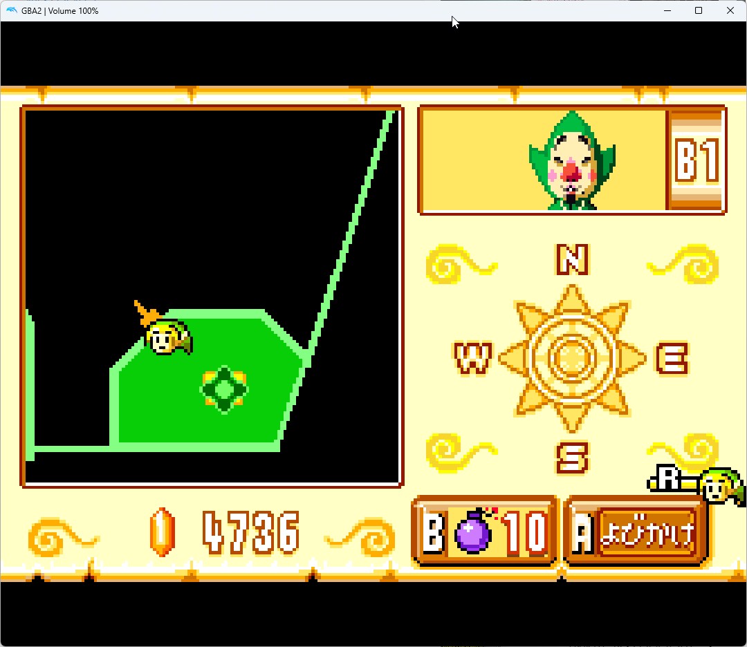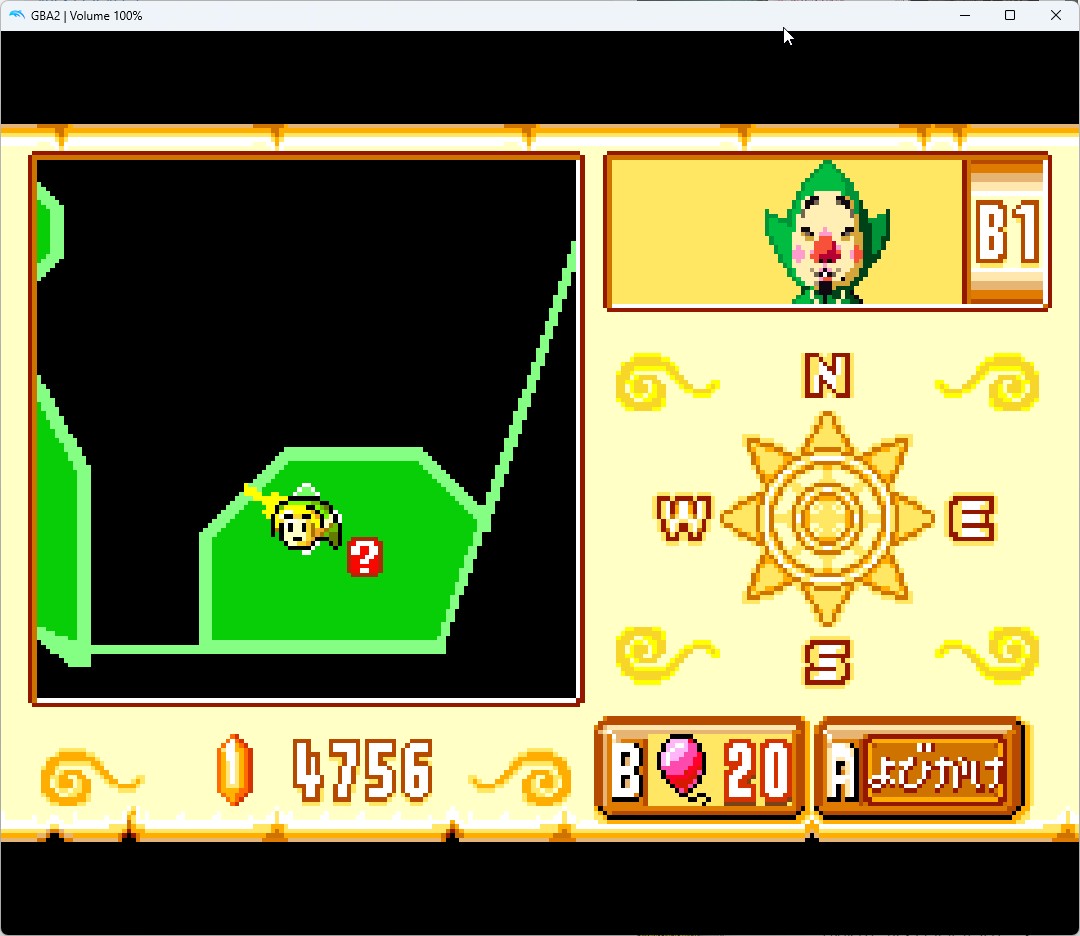 1-6. 스샷과 같은 위치로 이동하면 GBA 쪽화면에 ?표가 표시되어 있습니다. 그 물음표 위치에 GBA 십자키를 이용해서 팅클 커서를 이동시키면 큰 느낌표시가 나타나며 ?표는 보물상자 모양으로 변경됩니다.