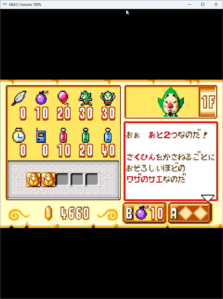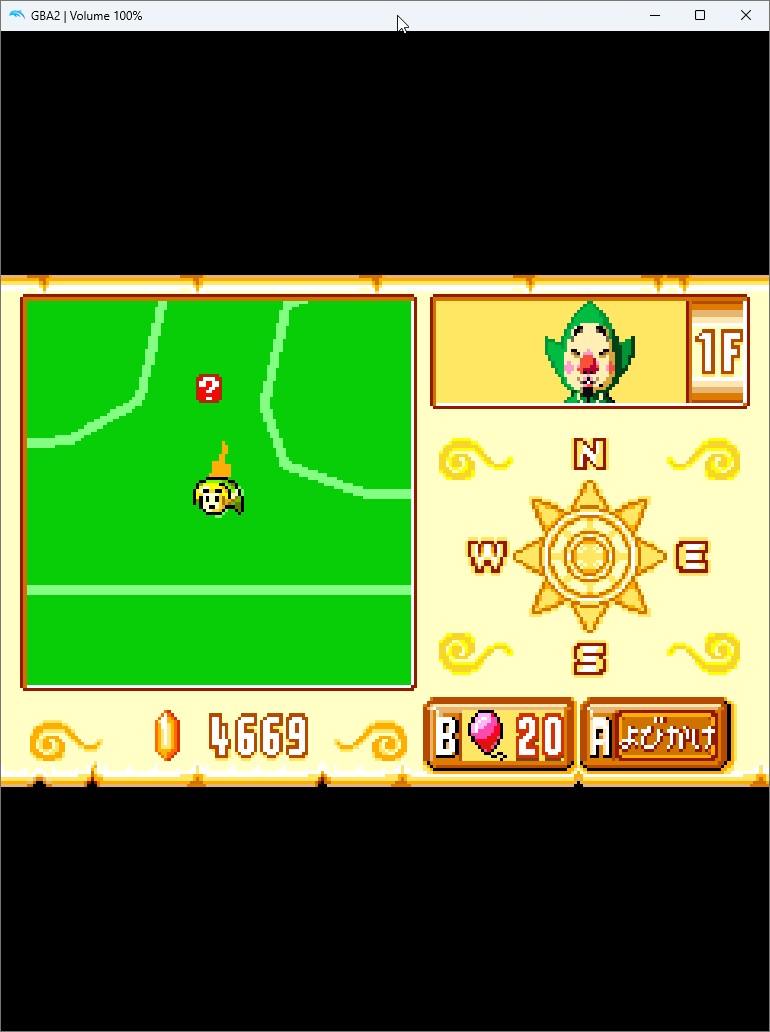 1-3. 이때 GBA 쪽 화면에 다음과 같이 ? 표시가 출력되는데 GBA의 팅클 커서를 움직여서 A버튼으로 조사하면 보물상자 모양으로 변합니다.