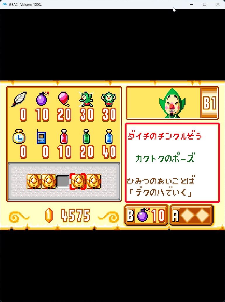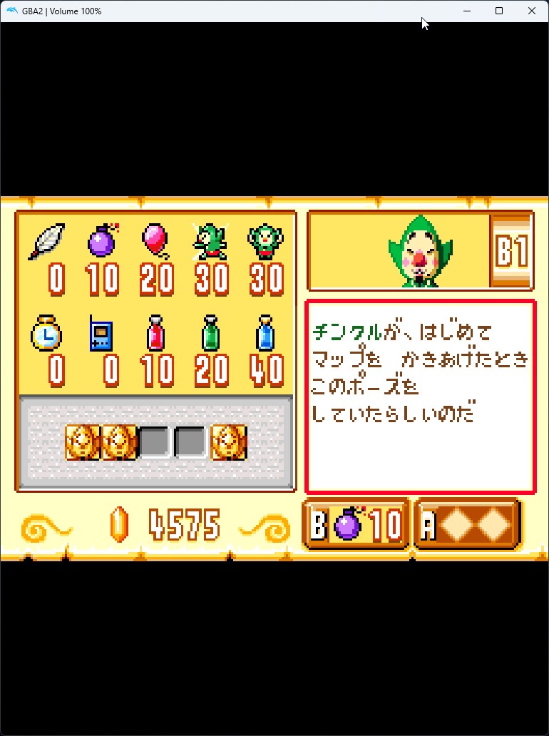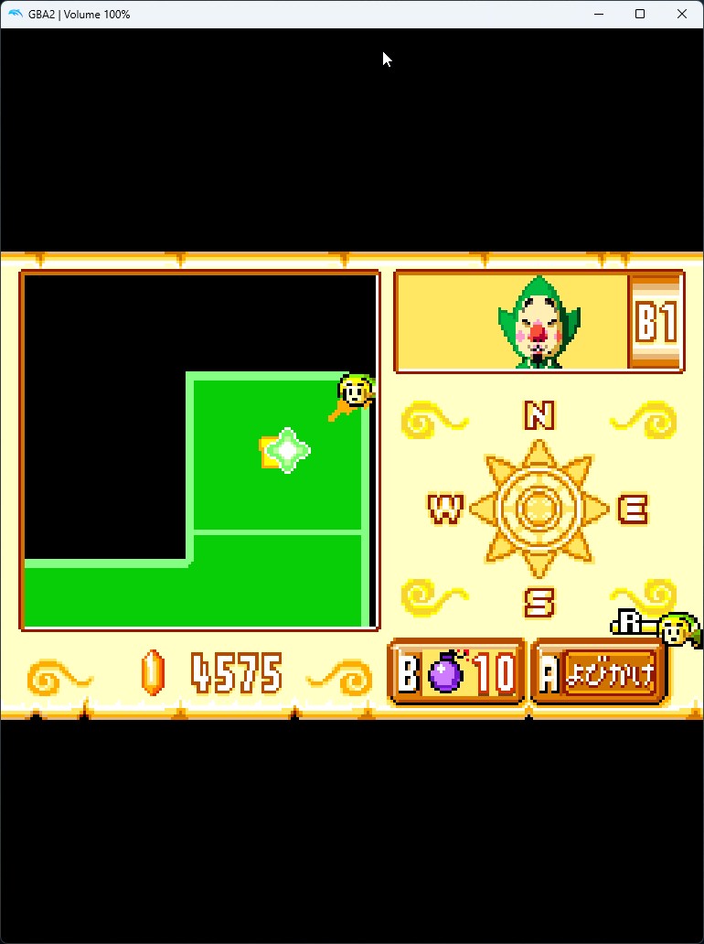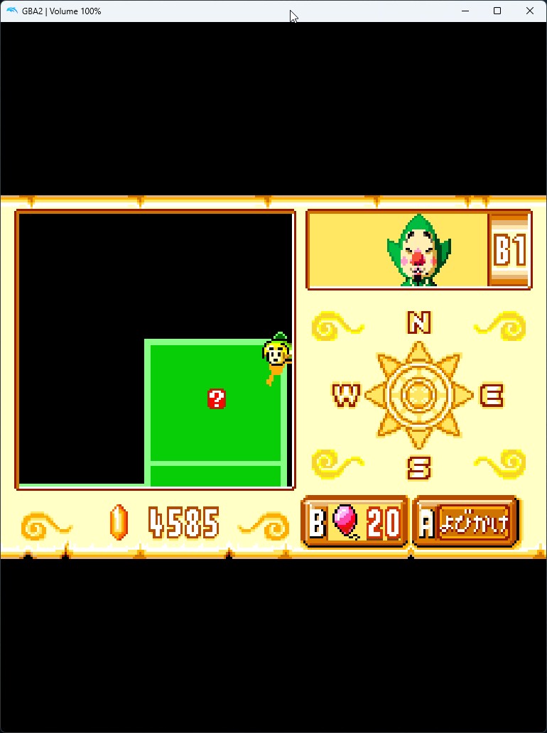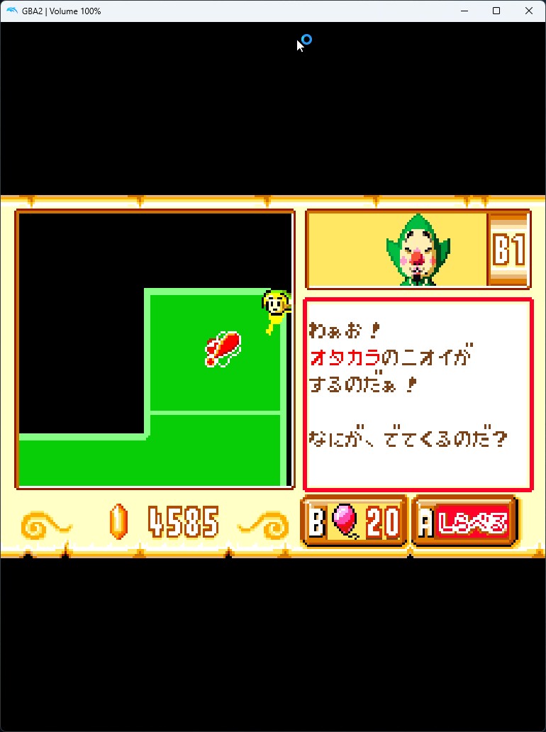 1-5. 해당 장소에 도착하면 GBA 쪽 화면에 다음과 같이 ?표 표시가 나타납니다. 거기에 GBA의 팅클 커서로 위치시켜 조사하면 보물 상자 모양으로 바뀌니 팅클 폭탄을 사용해 줍니다.